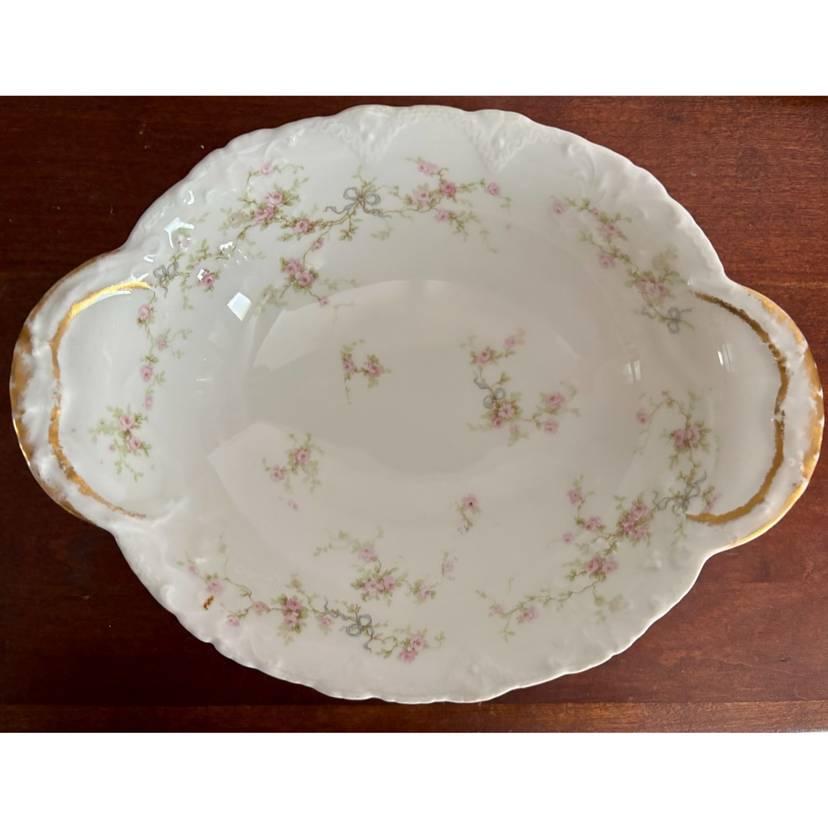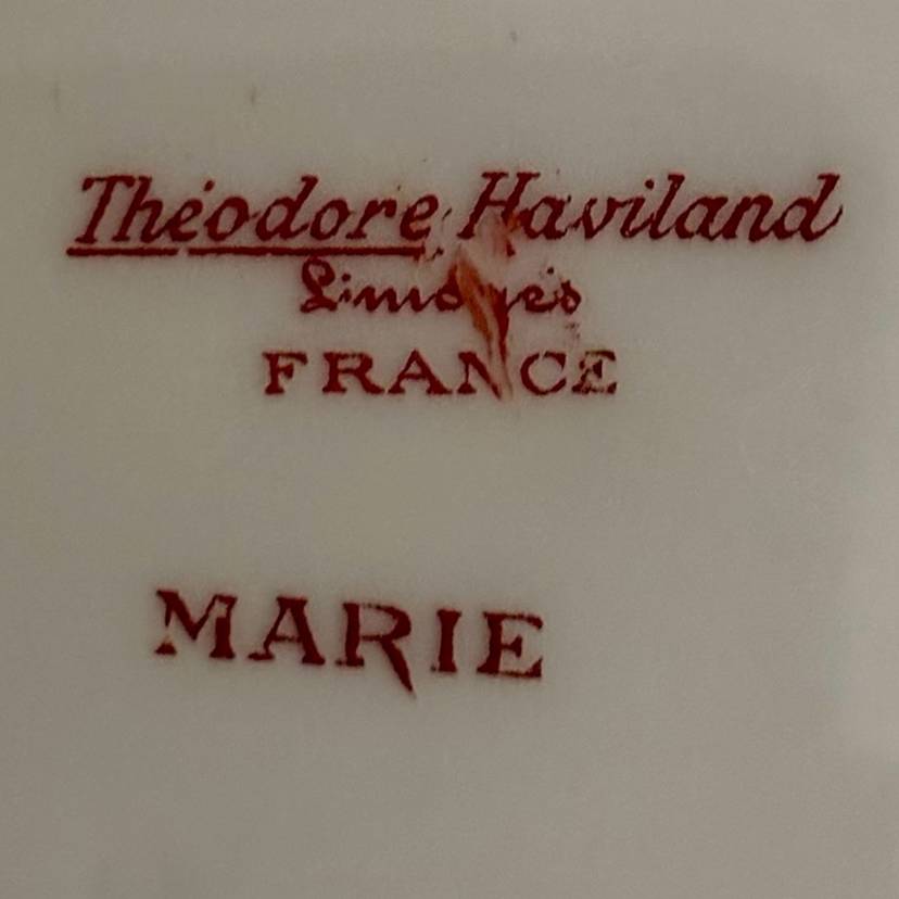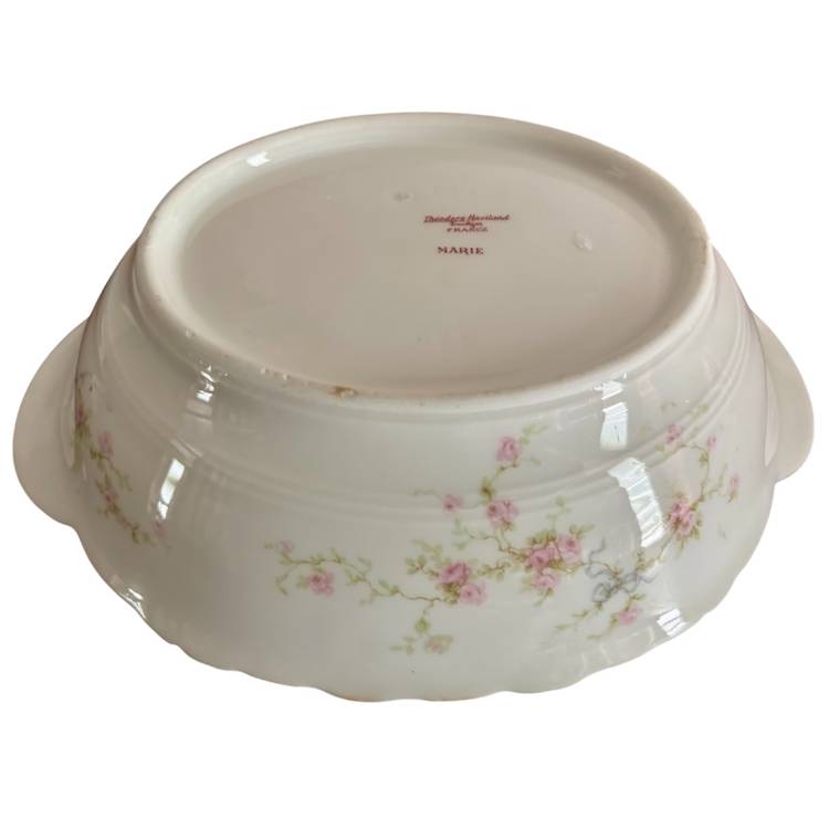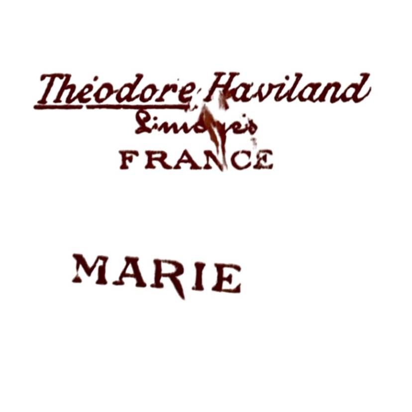 Antique Stamped/Signed “Theodore Haviland Limoges France Marie” Marie Scattered Flowers pattern Hand Painted Bowl Porcelain Victorian Pink Flowers Scalloped edge with an embossed rim,decorated with a hand painted design of pink flowers, green leaves and blue bows The backstamp indicates it was made in France by Theodore Haviland Limoges, a mark first used in 1903, suggesting its age