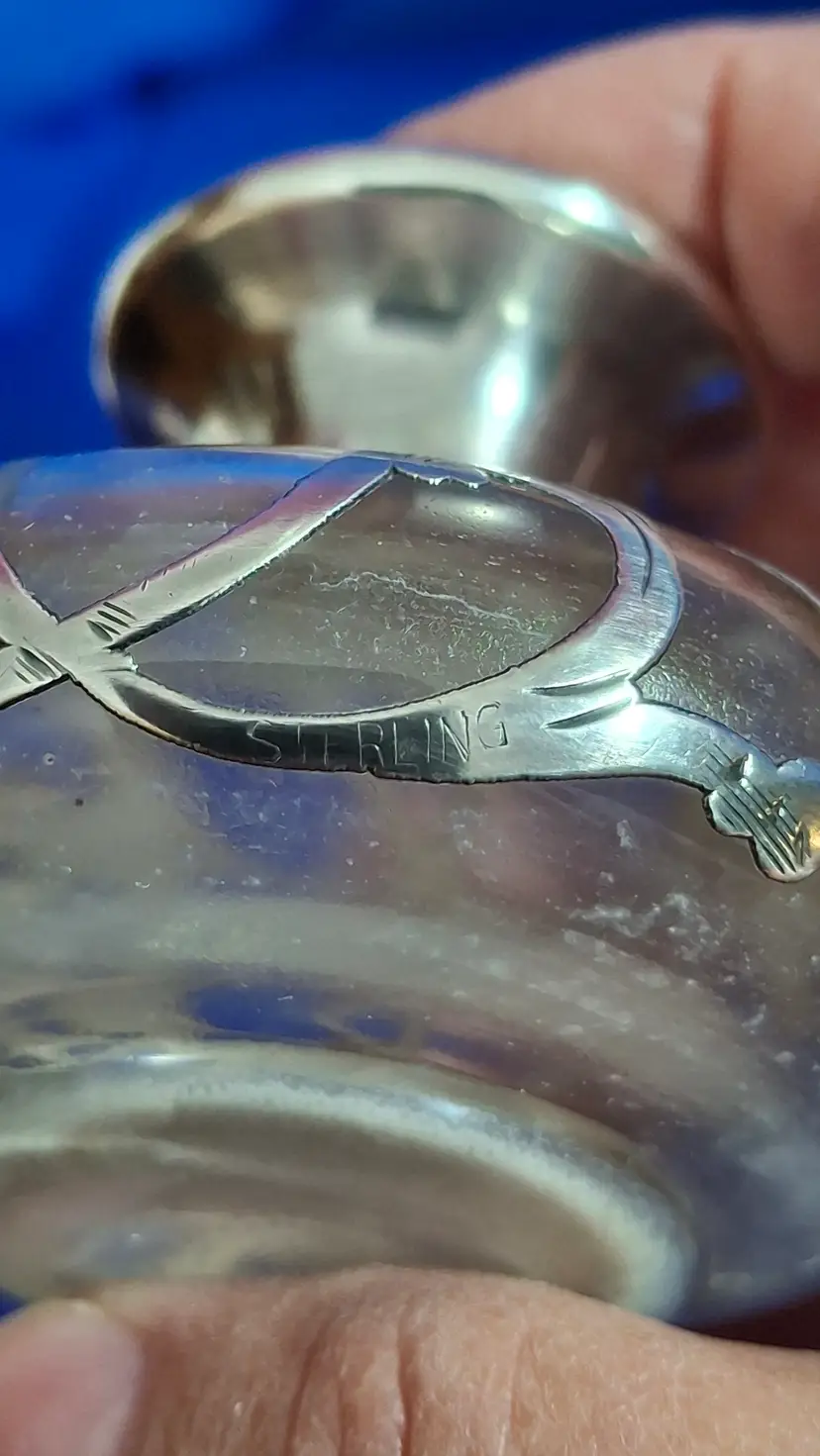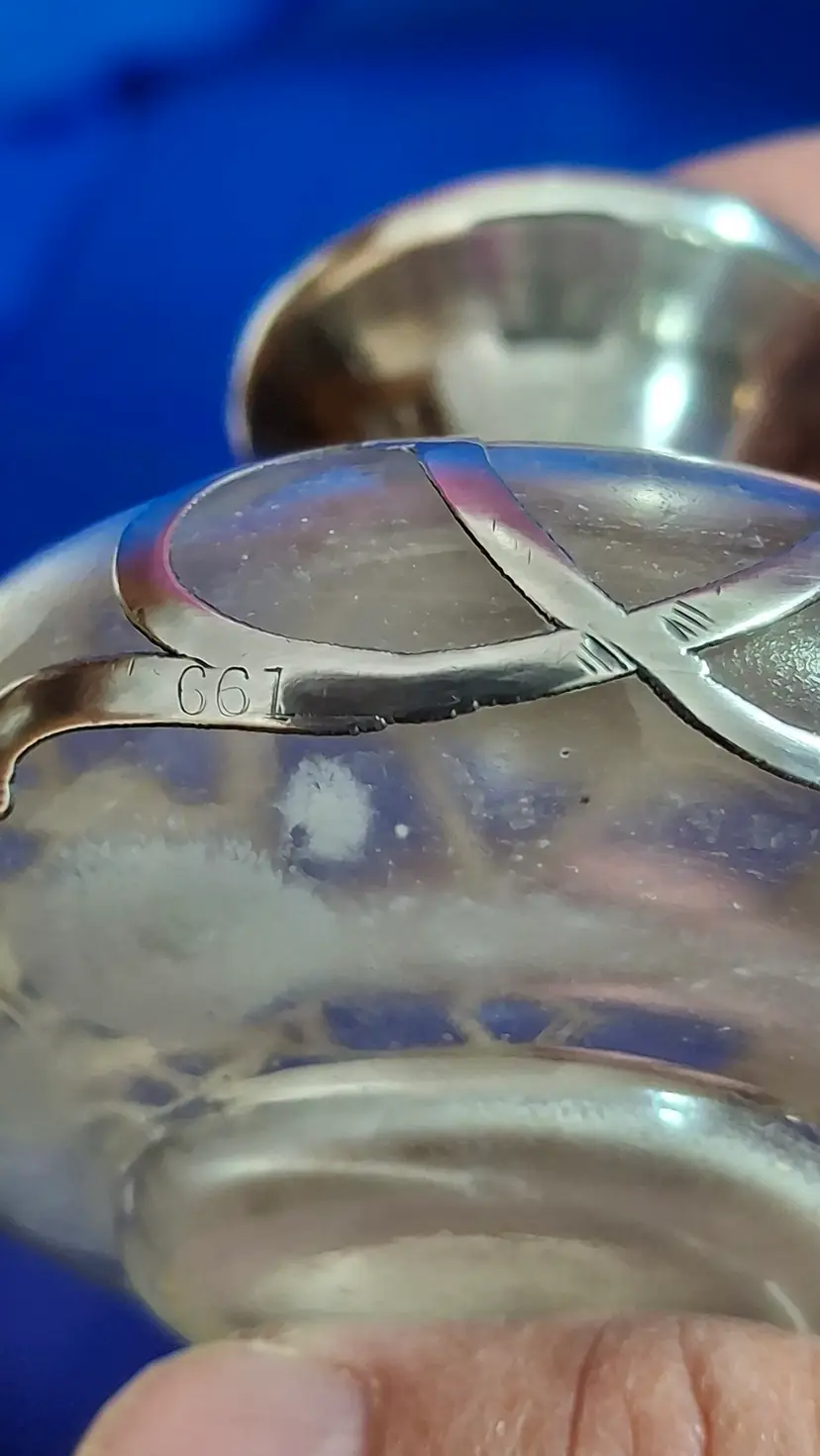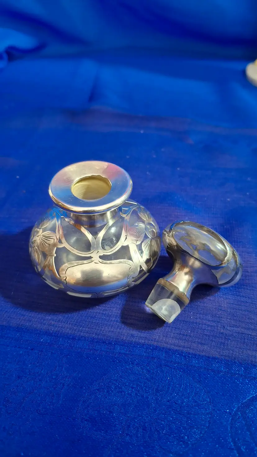 Antique Sterling Silver Overlay Art Nouveau Perfume Bottle – c. 1900–1915 Clear glass perfume with heavy sterling silver overlay marked STERLING and pattern number 661. 3” tall x 2 ½” wide. Stopper looks like it cracked and has a really good repair on dauber end, so you don’t see it until you lift the lid. Please view the pictures and feel free to ask questions. Thank you for visiting my shop.