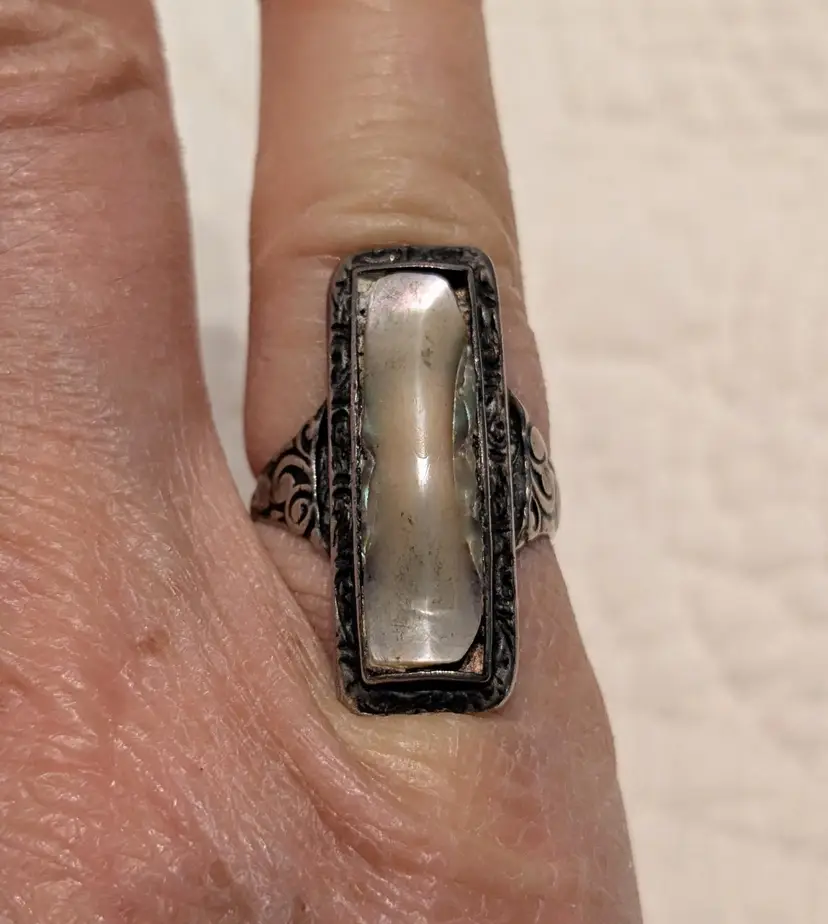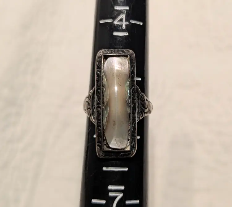 The front face of this ring is 1" long. Unmarked but acid tests as positive for sterling silver.