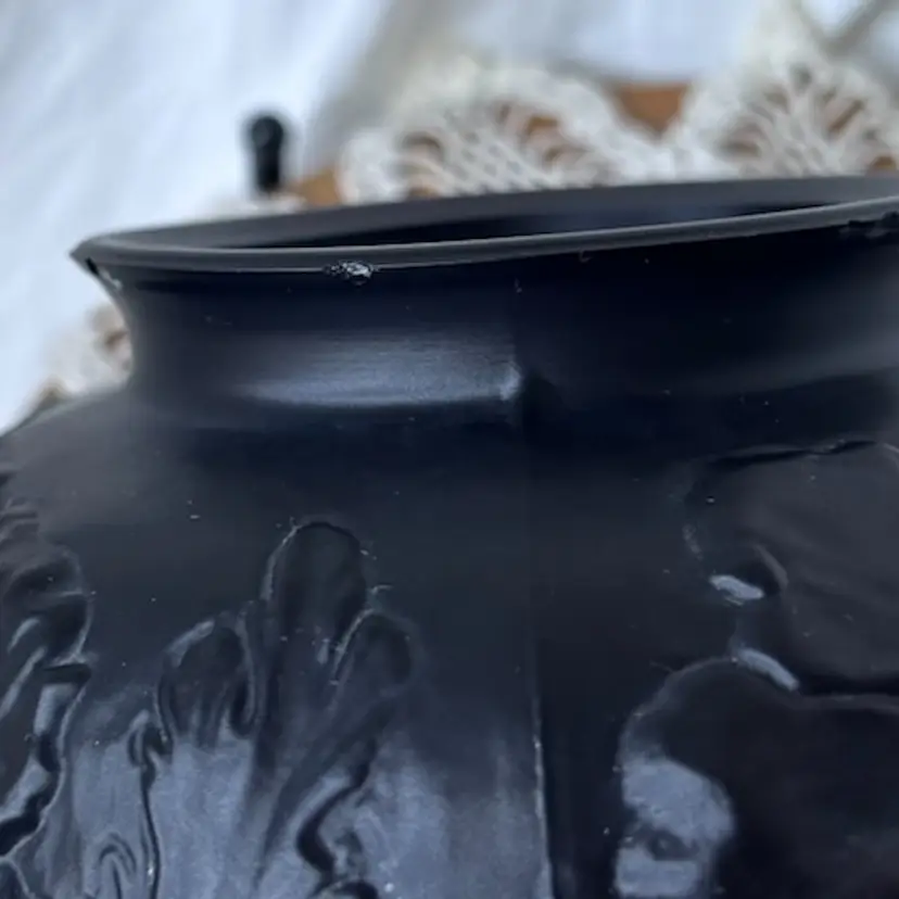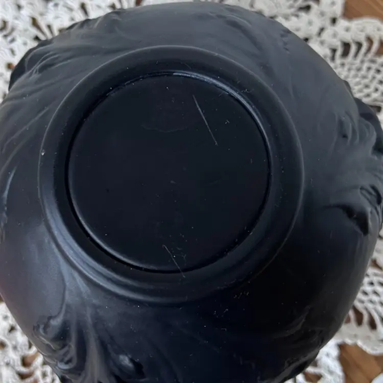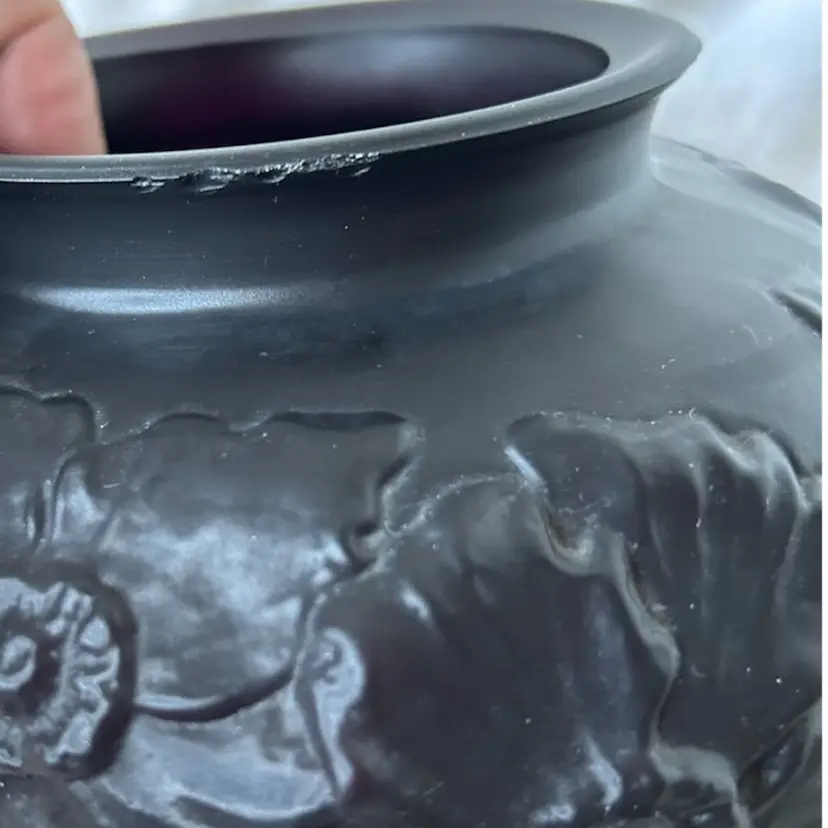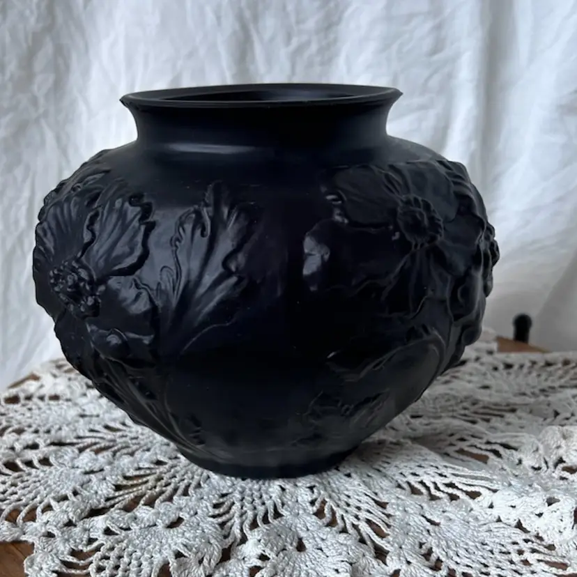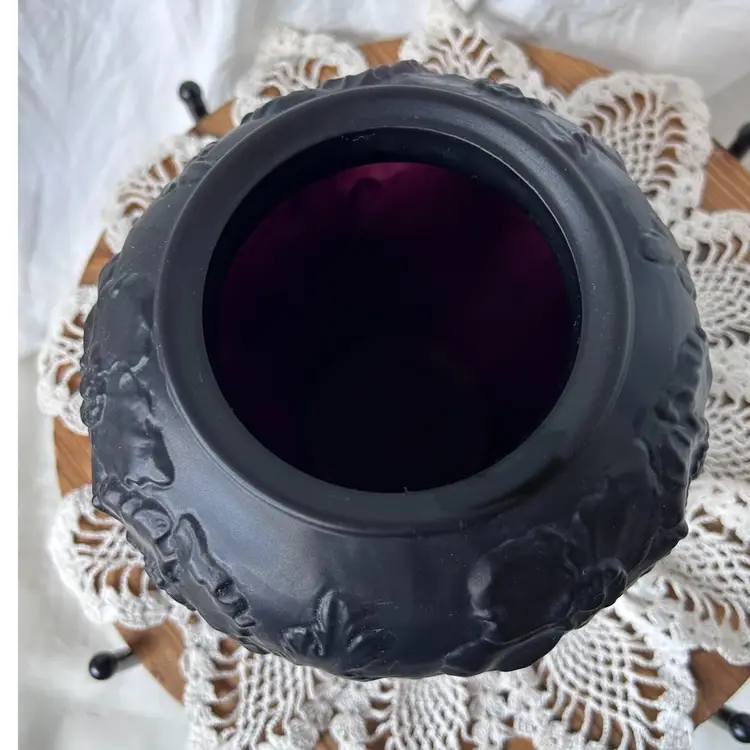 Beautiful antique Tiffin Glass black amethyst vase from the 1920s-30s in the Art Deck era. The vase itself is in excellent condition but there are some tiny chips around the rim so please see the pictures. It measures 6” tall by 6.5” wide.