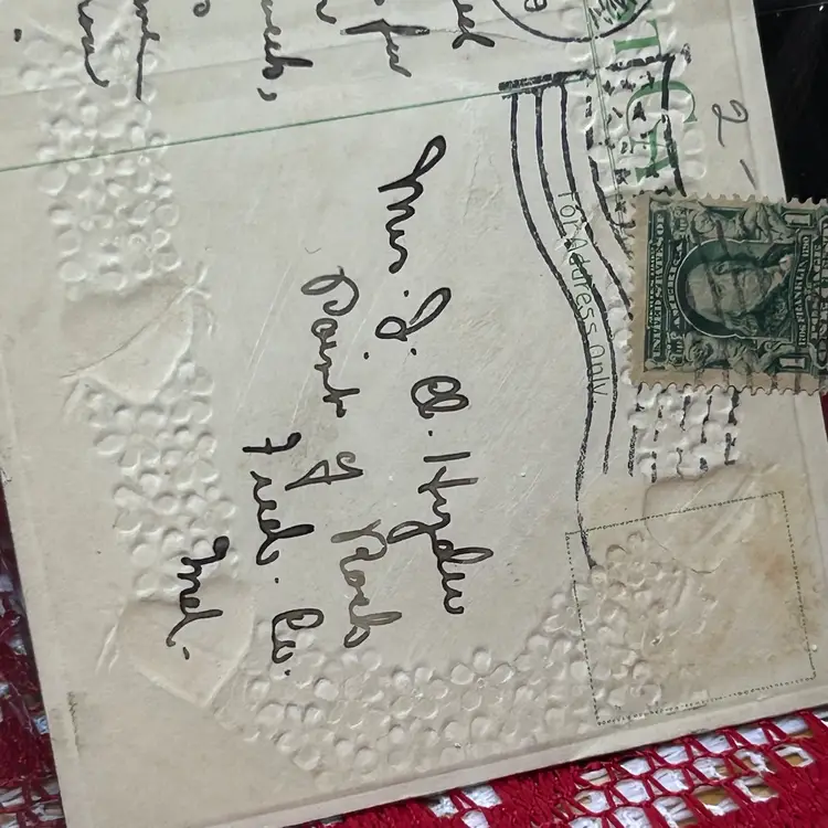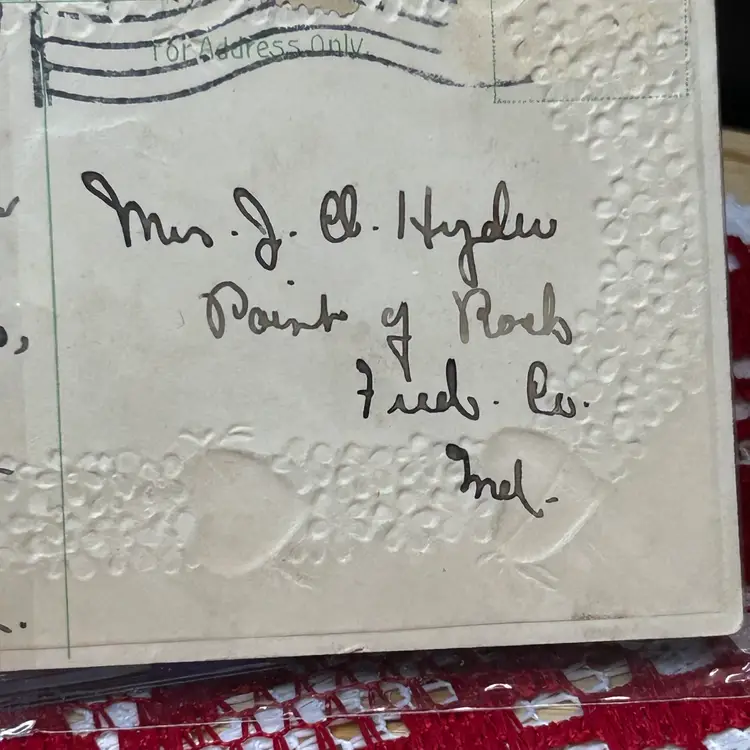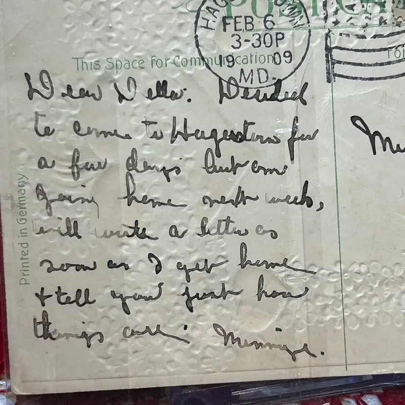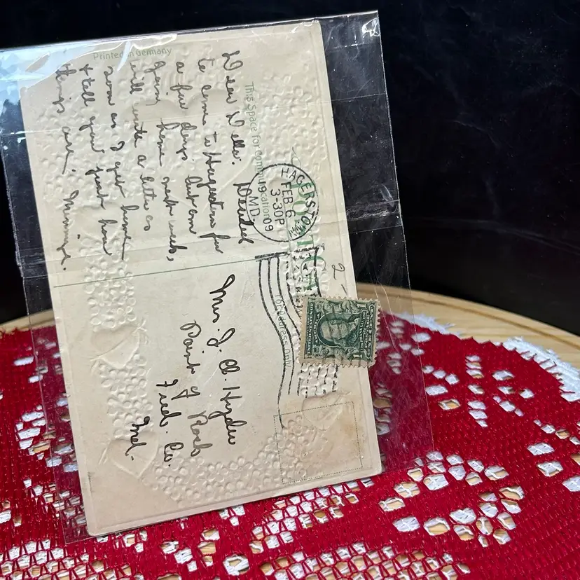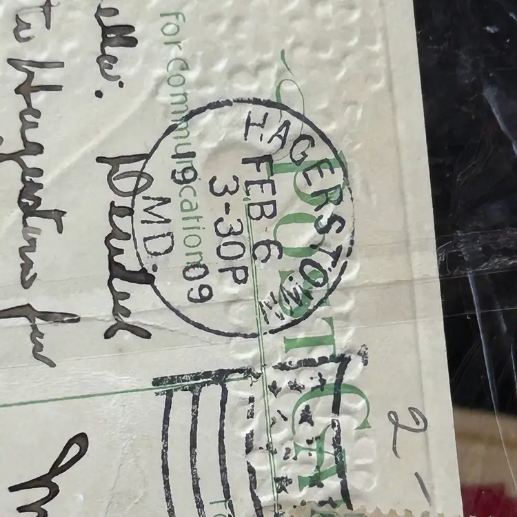 Postmarked 1909, Hagerstown, MD. Card has message written on it, as well. Excellent antique, used condition.