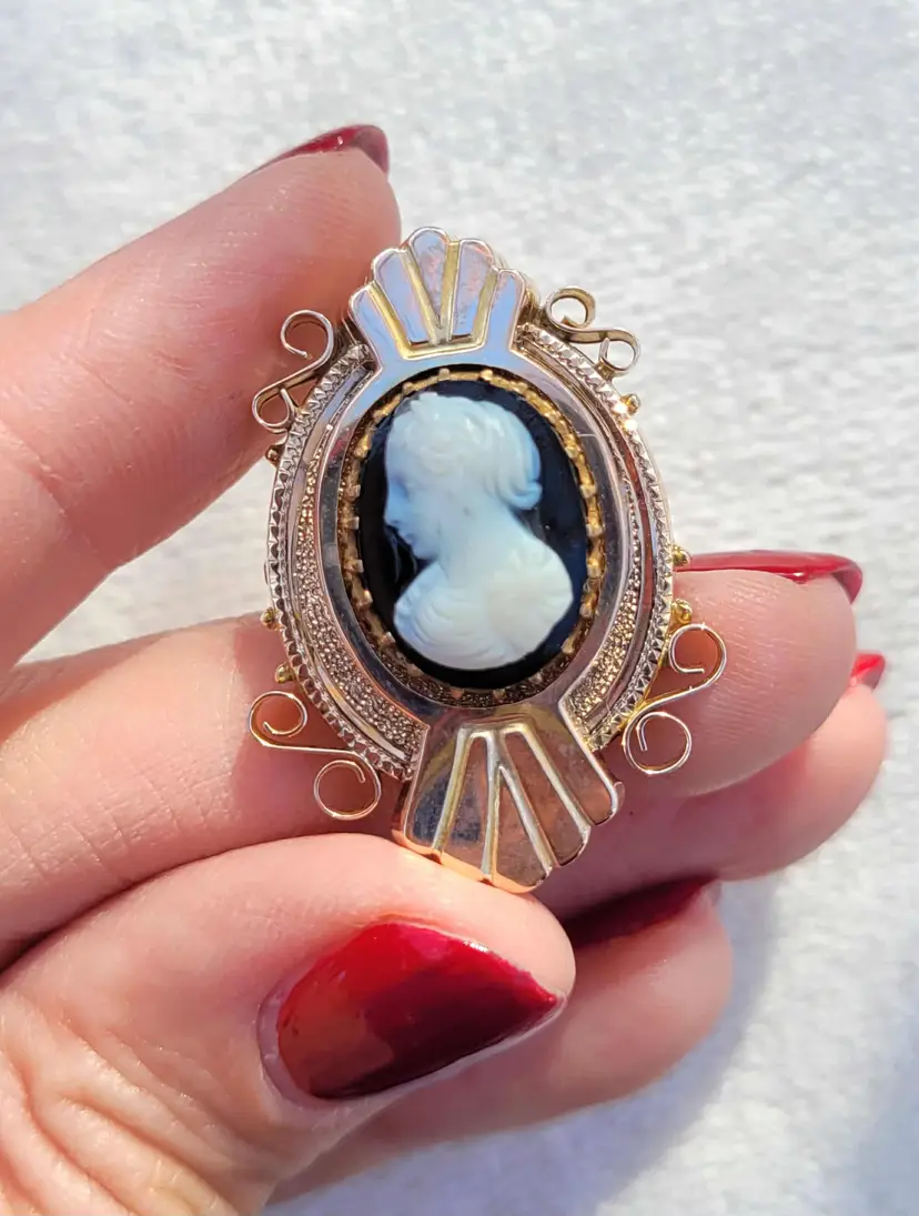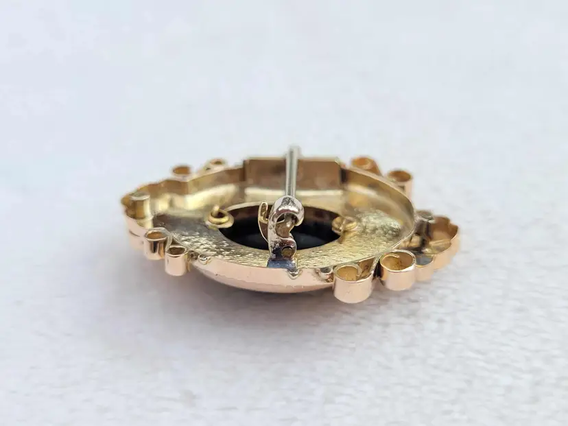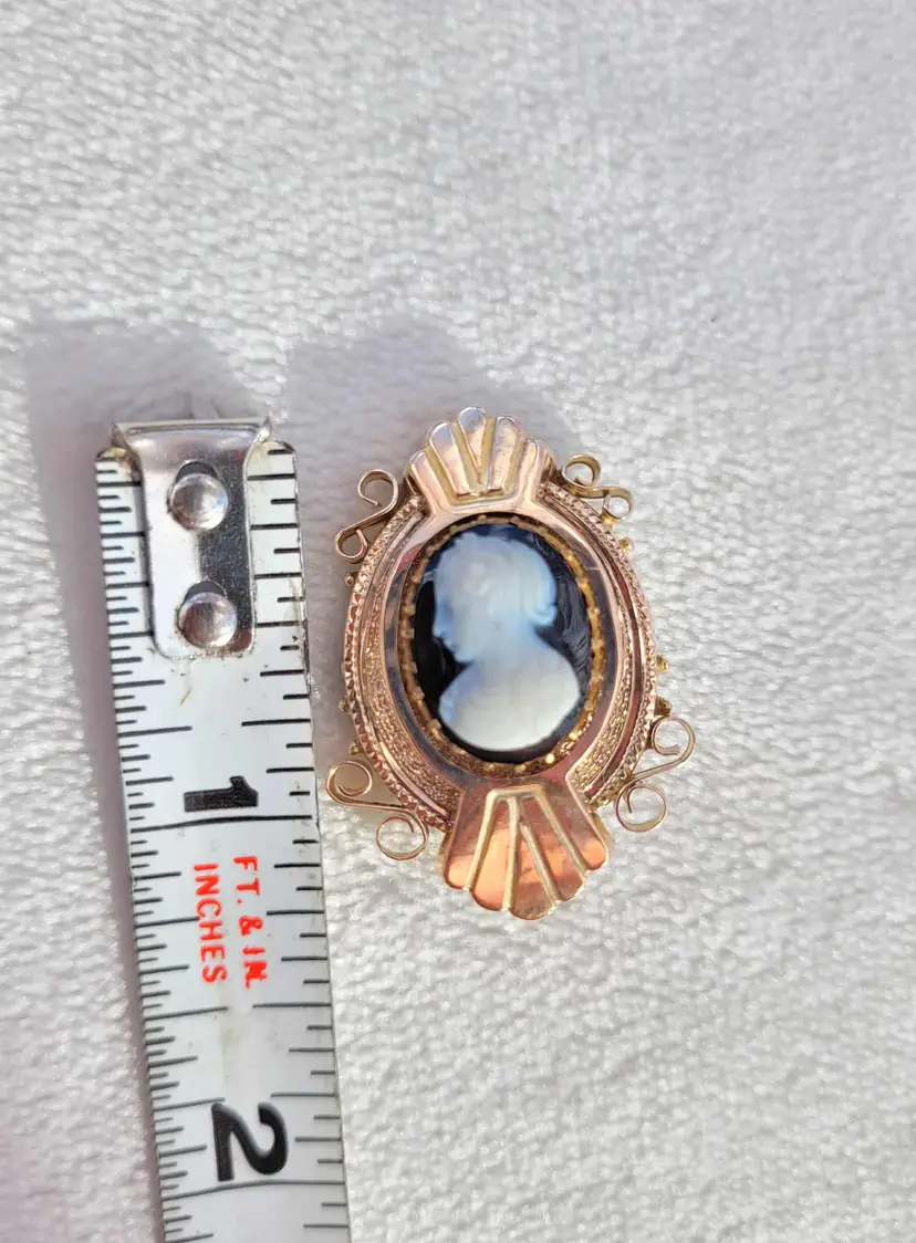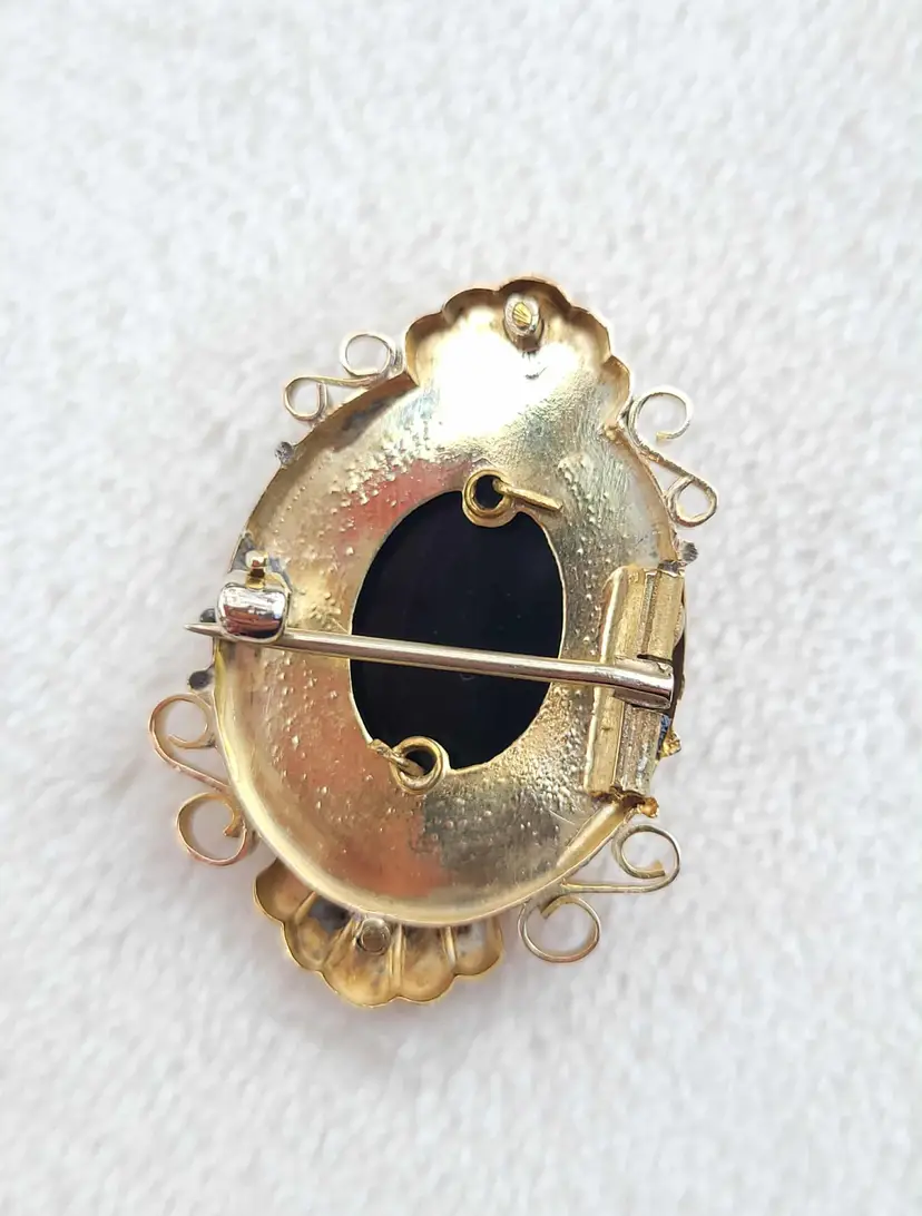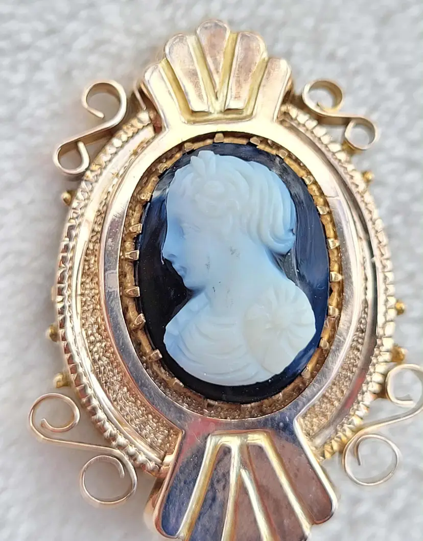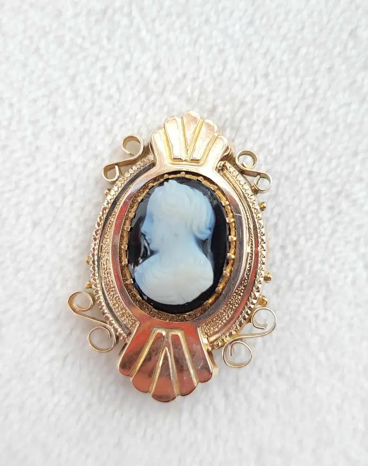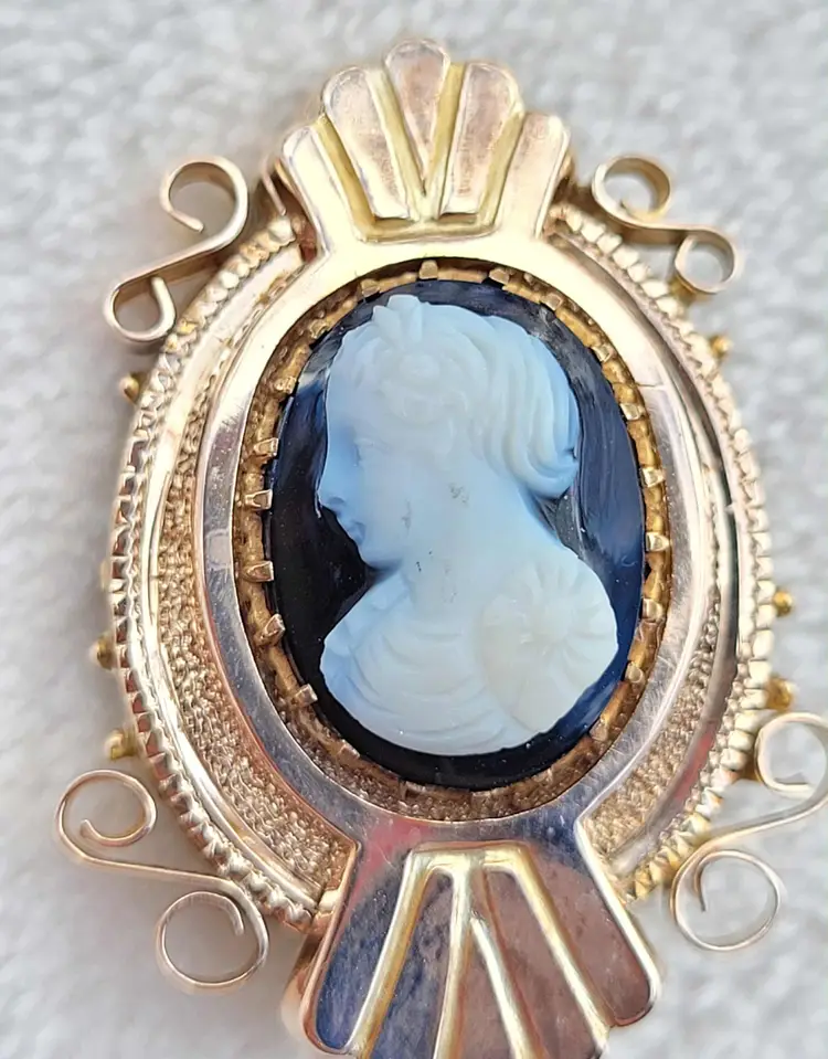 Absolutely gorgeous original 1880s/90s Victorian Etruscan style hardstone cameo brooch, comprised of solid 10k yellow gold. It is unmarked so the gold content has been verified via Auracle tester and acid testing. It appears to have had the pin replaced at some point; there's some evidence of heat exposure on the gold on the back side. It's in good condition, please see pictures for details and measurements.