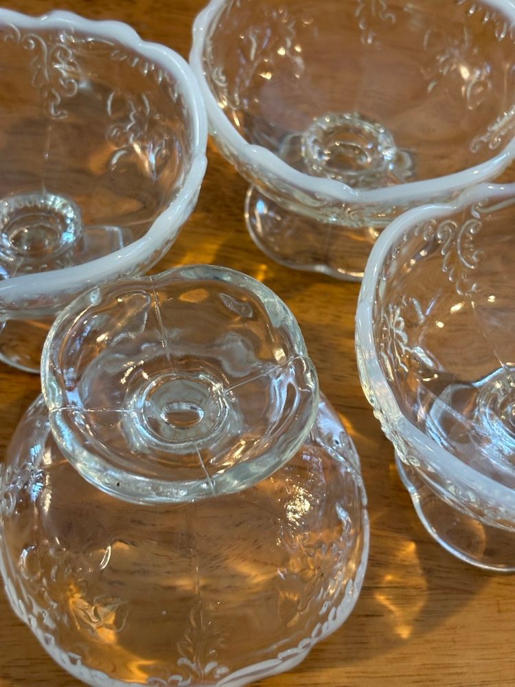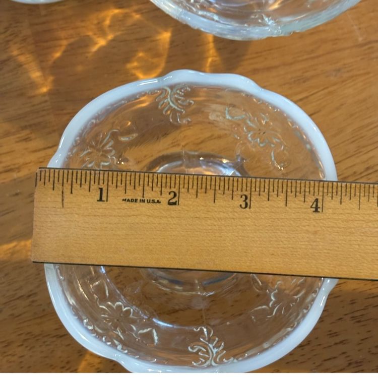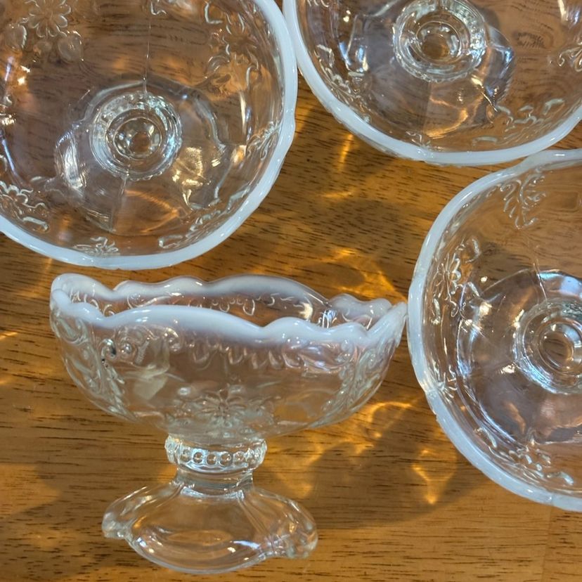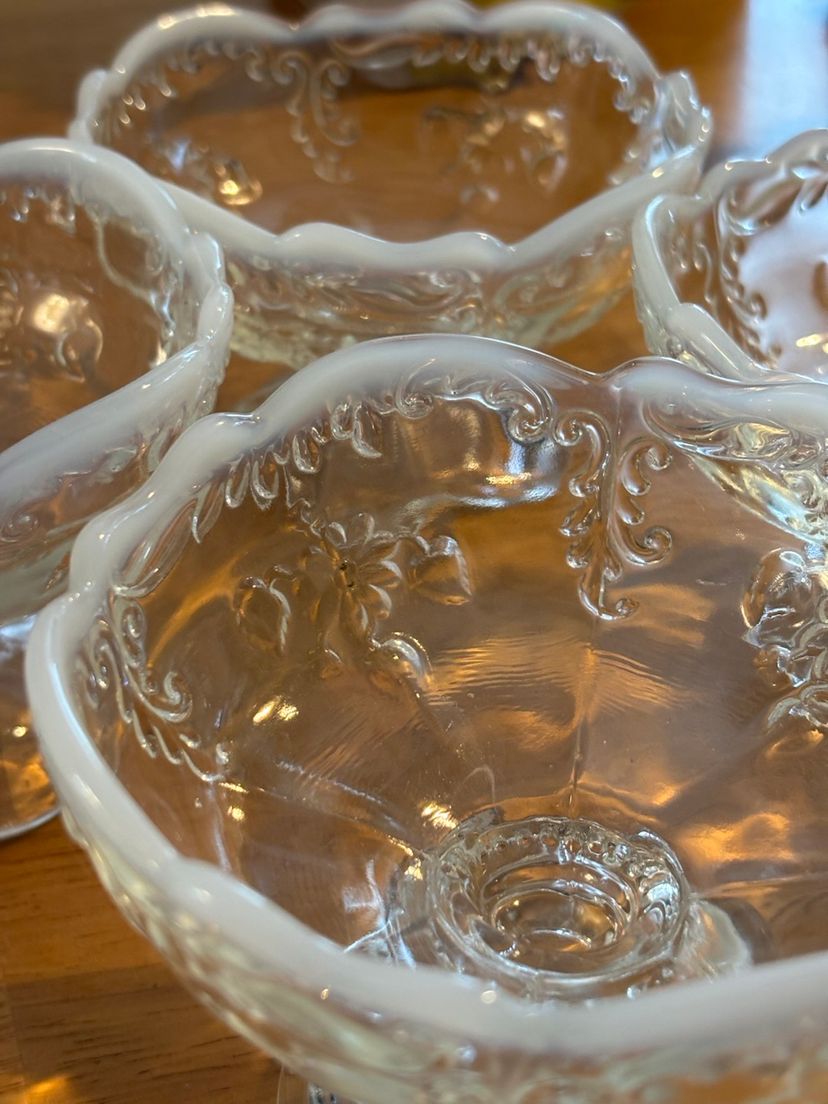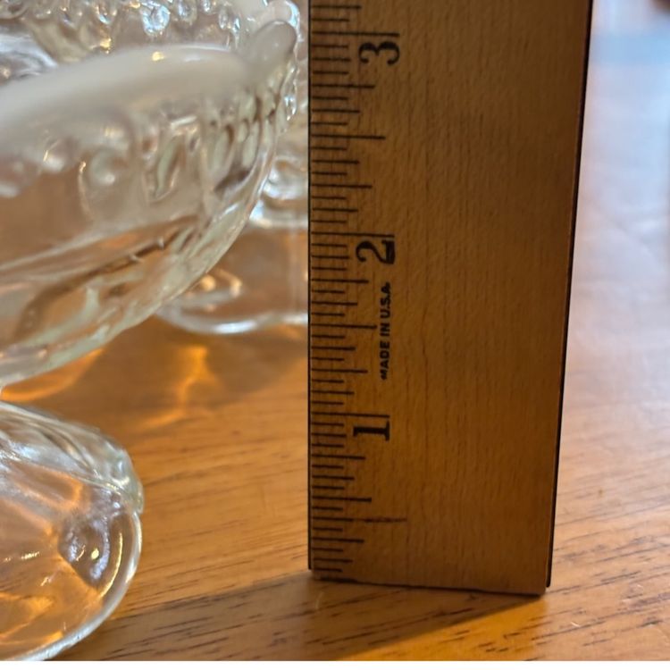 Approx. 4.25” across 3”tall Antique Victorian Era 1850-1910 Opalescent Scalloped Top Edge Beaded Pedestal Dish Compote Floral Foliage Mint condition No chips or cracks Absolutely beautiful!
