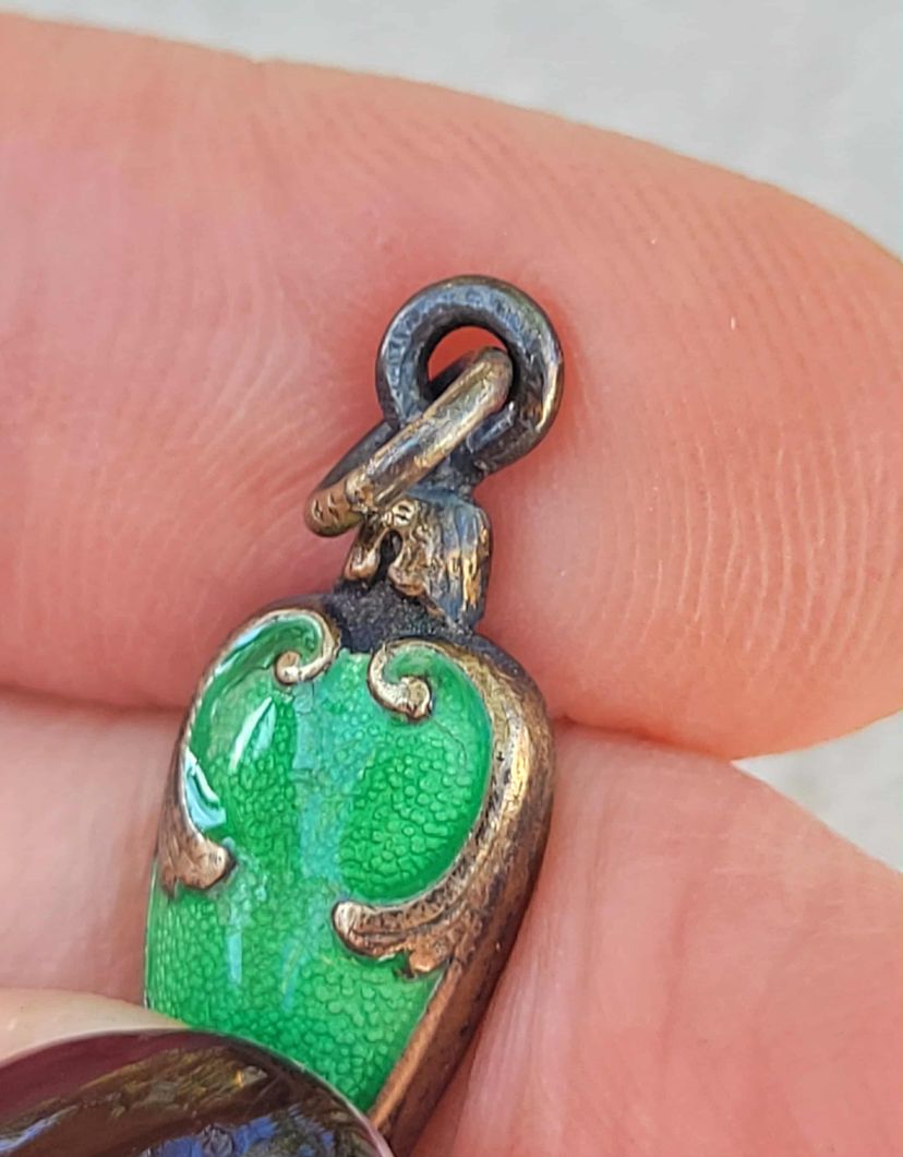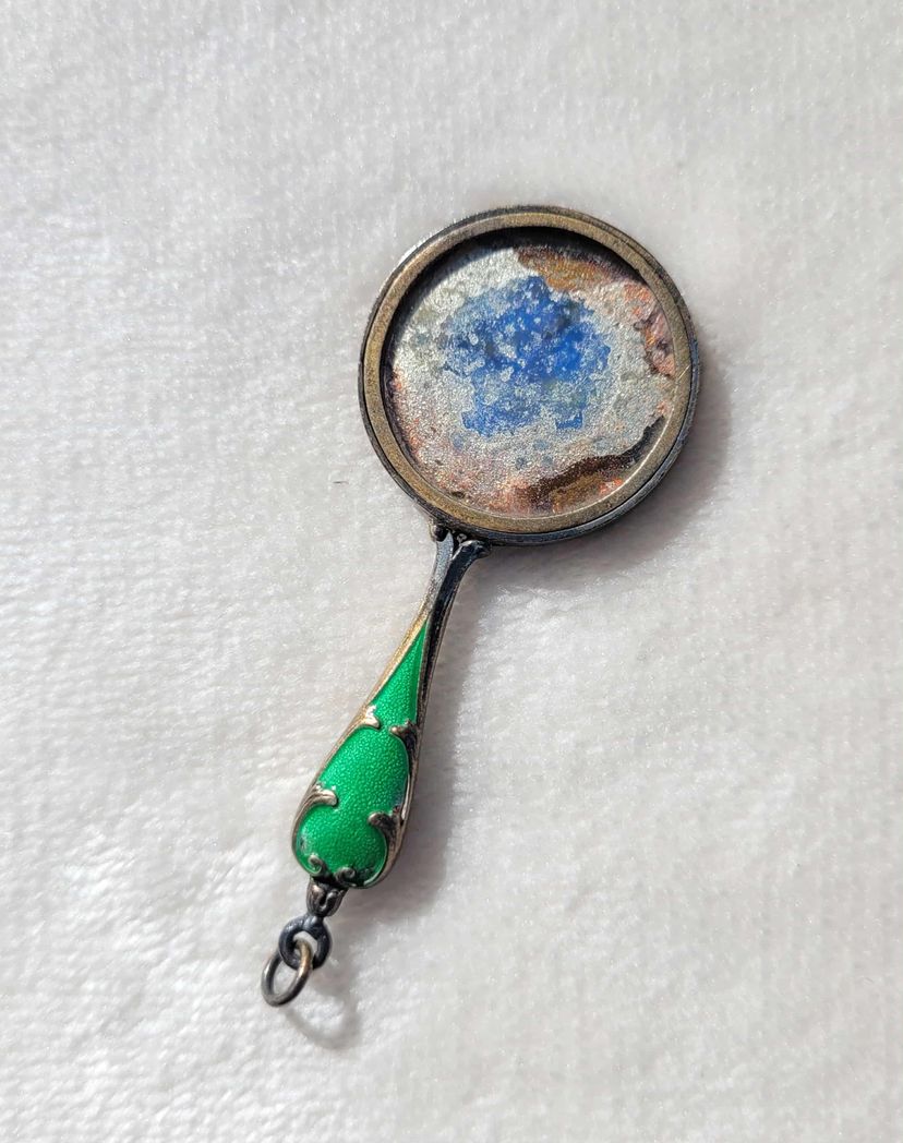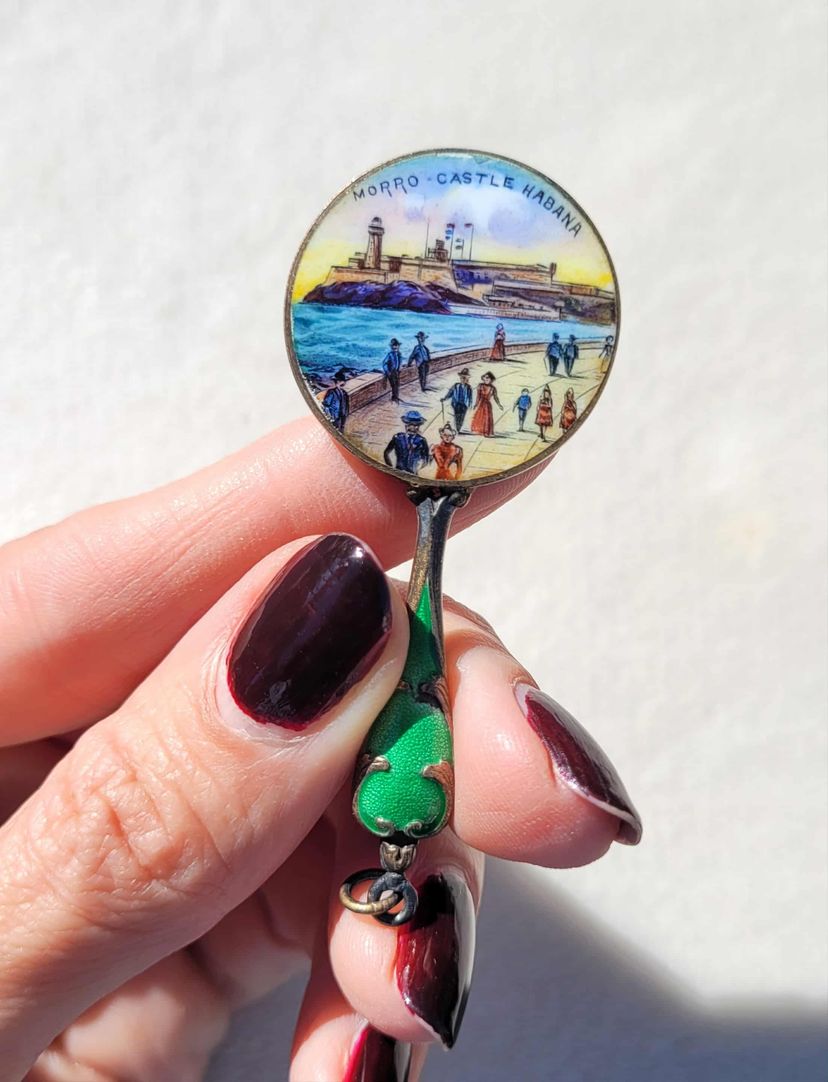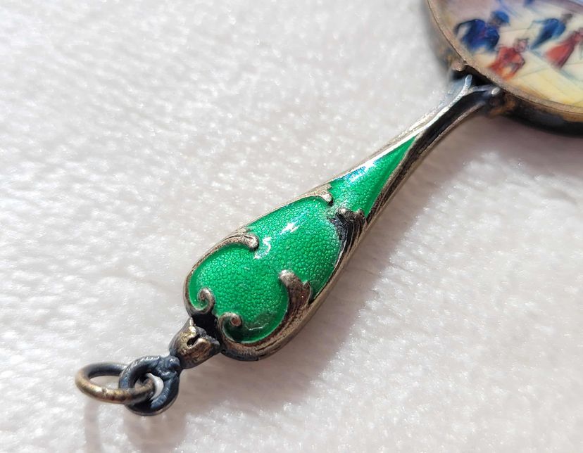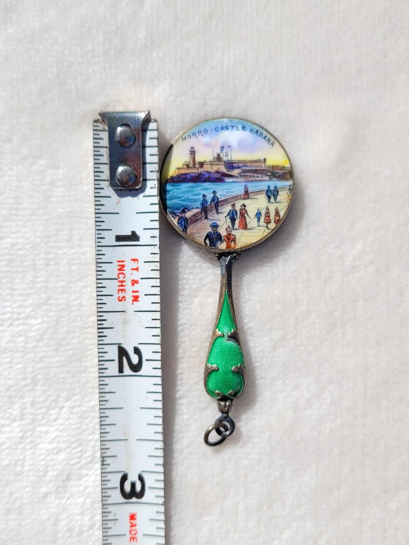 This is a beautifully intricate miniature hand mirror with a green guilloche enamel handle. One side has an enameled seaside scene in Cuba, the other has a mirror that's degraded over the years. I think this may have been a decorative tourist item that could have hung on a chatelaine. It's in good condition other than the mirror part, please see pictures for details and measurements.