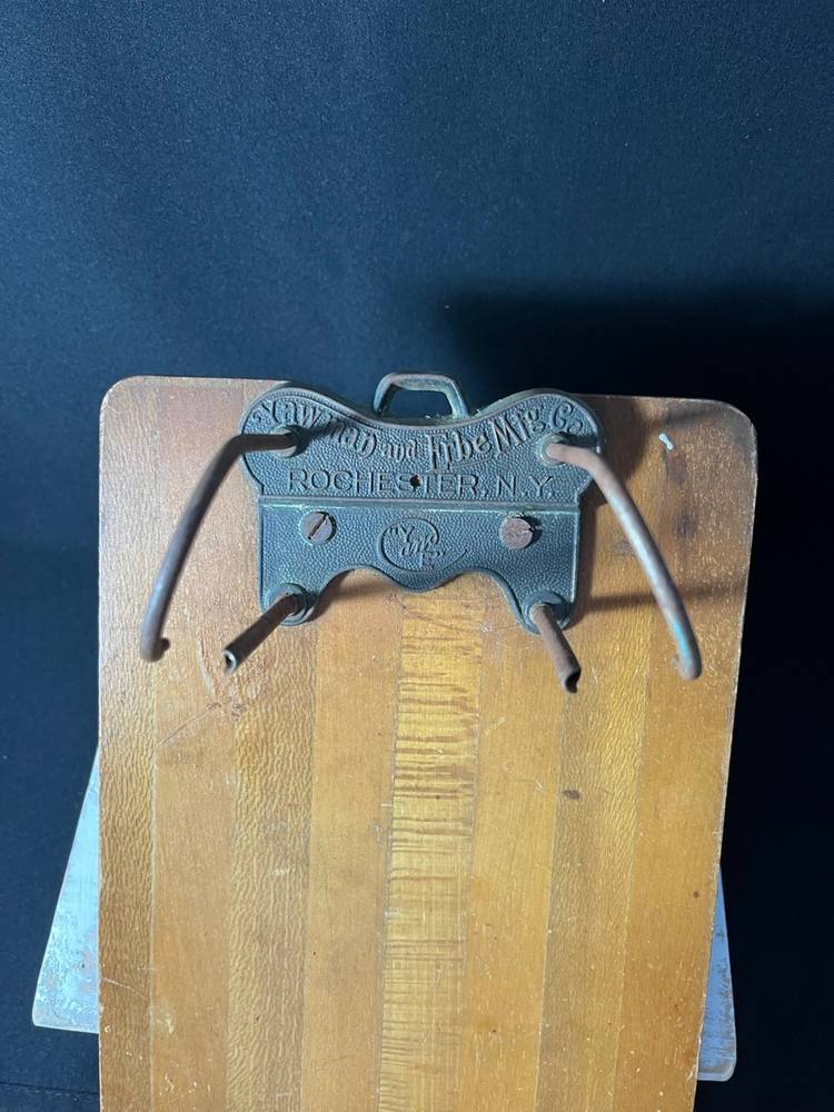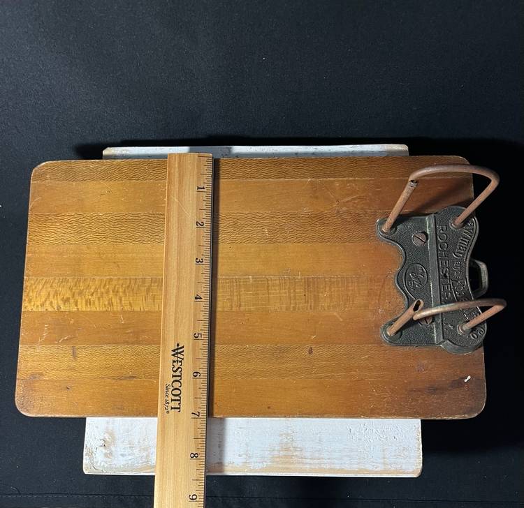 #980 Antique Wood Butcher Block Style Yawman & Erbe Mfg Co Rochester NY Clip Board with metal hardware. Measures 12” x 7”.
