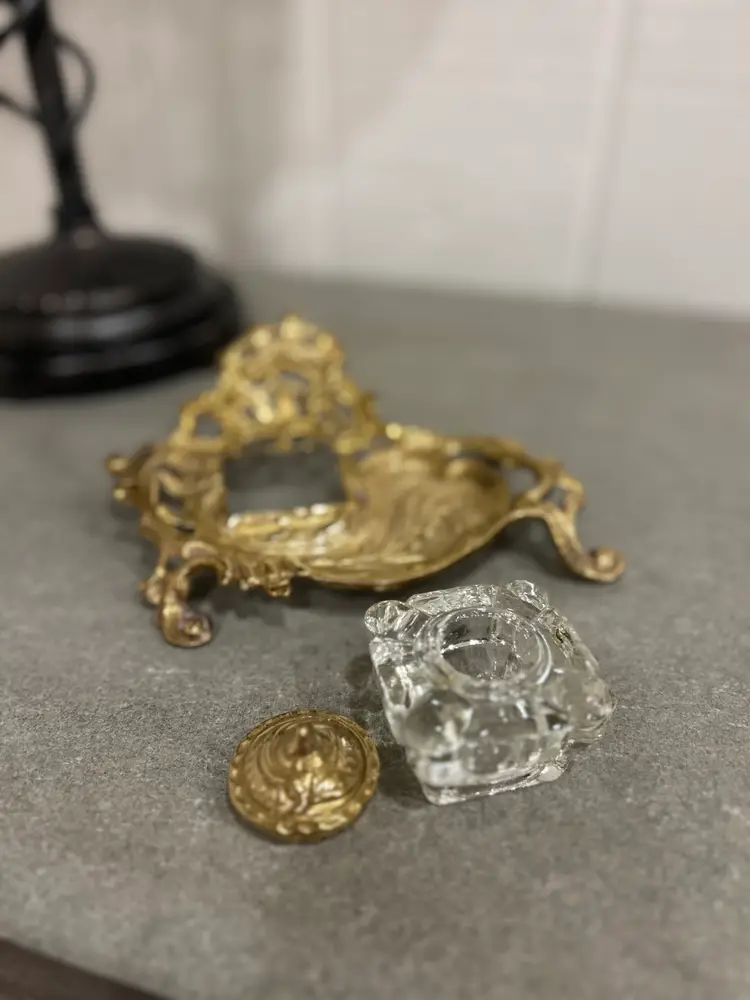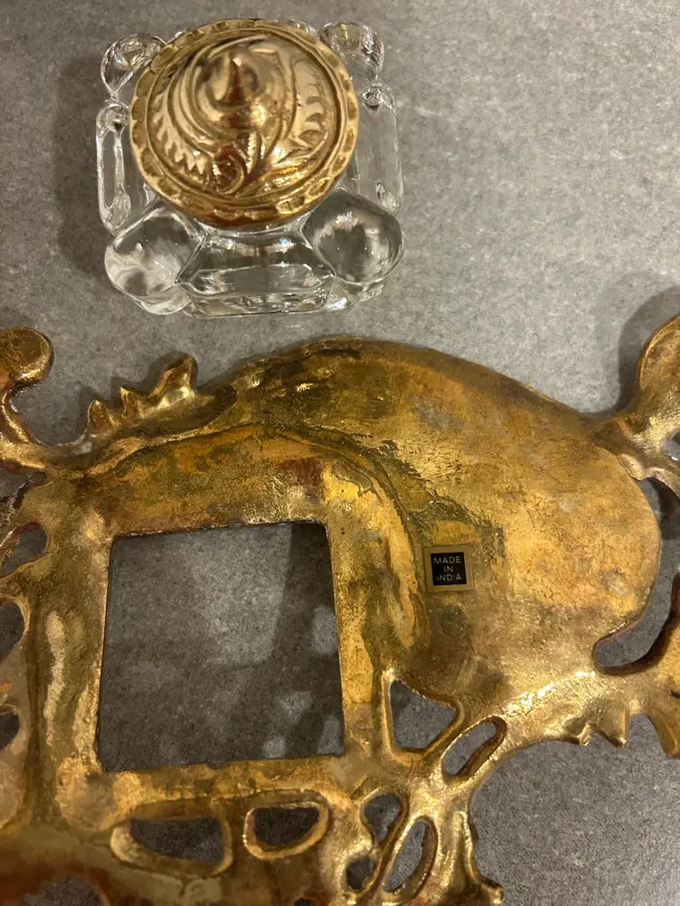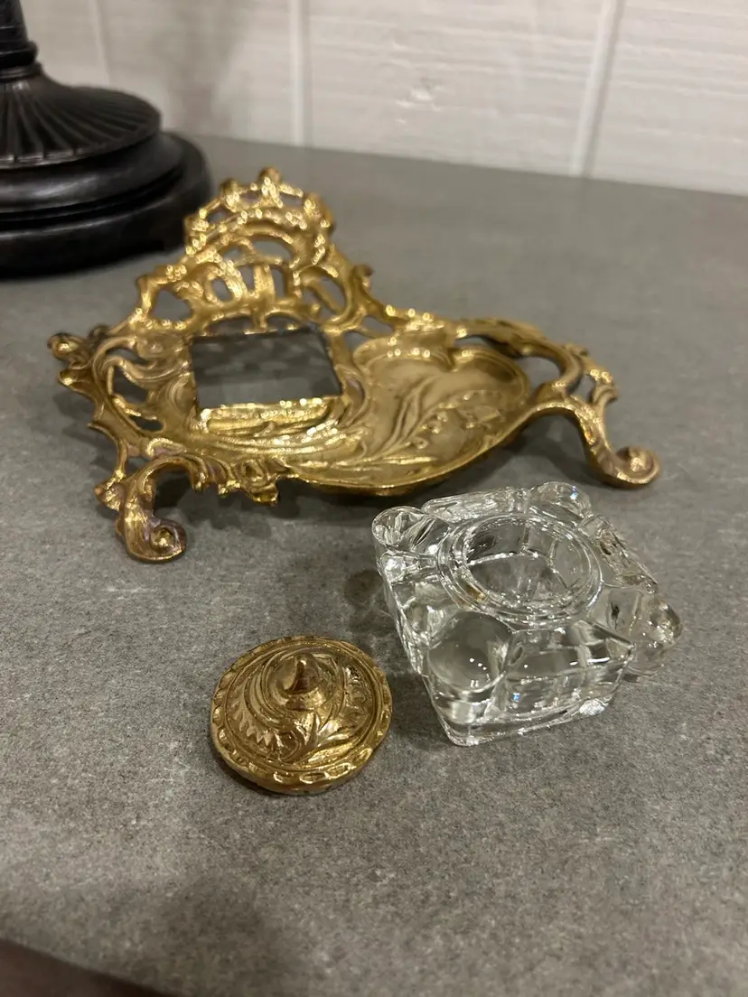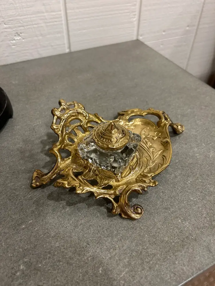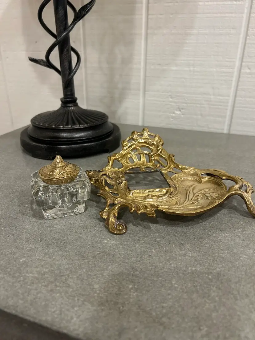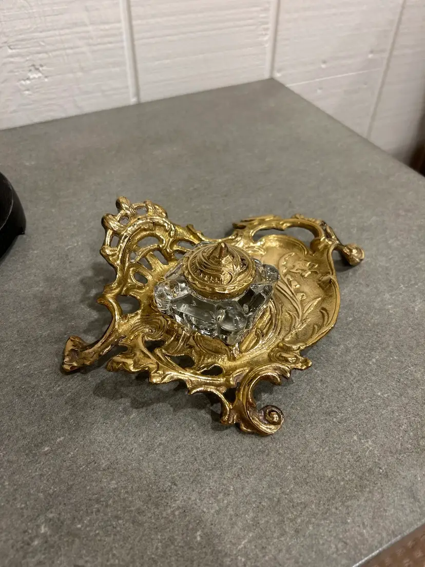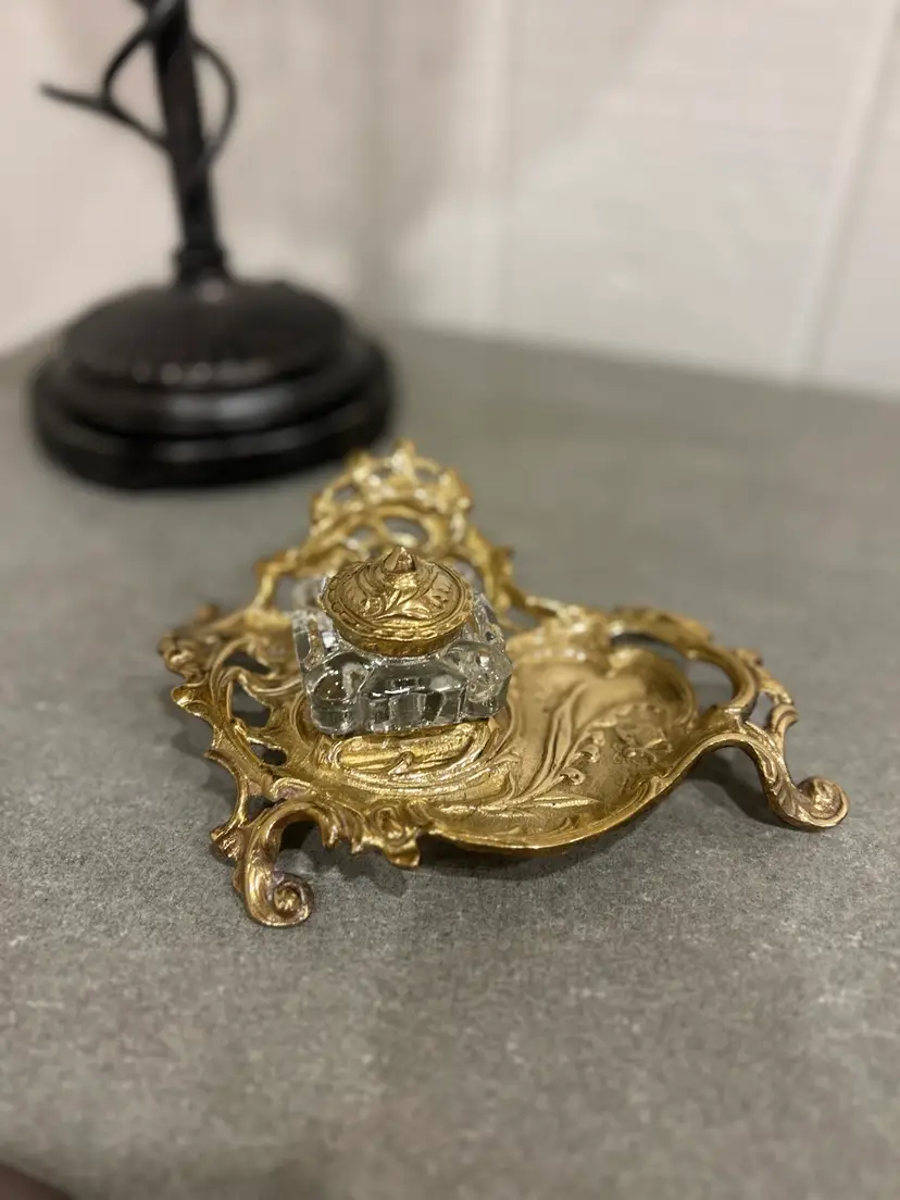 Gorgeous antique/vintage brass inkwell made in India. Beautiful scroll and floral brass detail on pen holder and inkwell lid. Inkwell is a glass insert. This is a stunning piece. Glass inkwell has no chips or cracks.