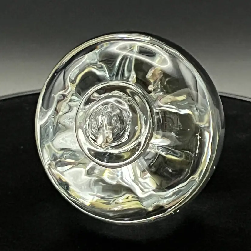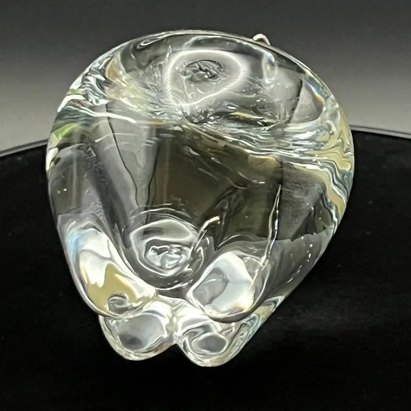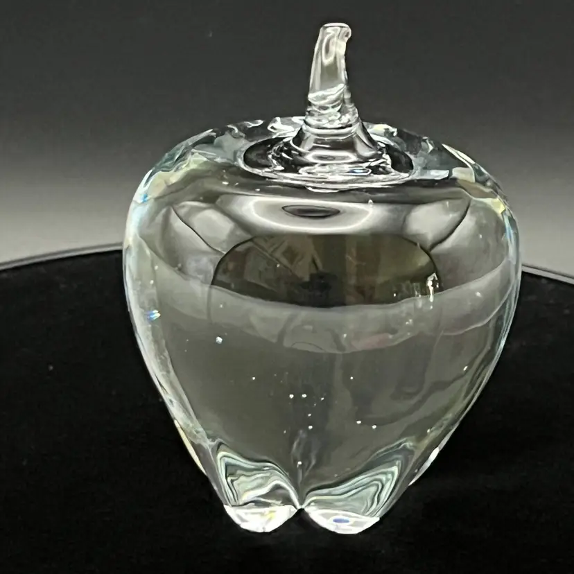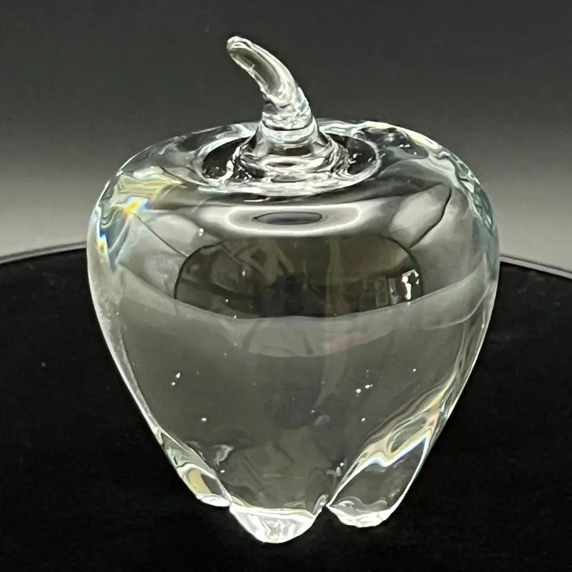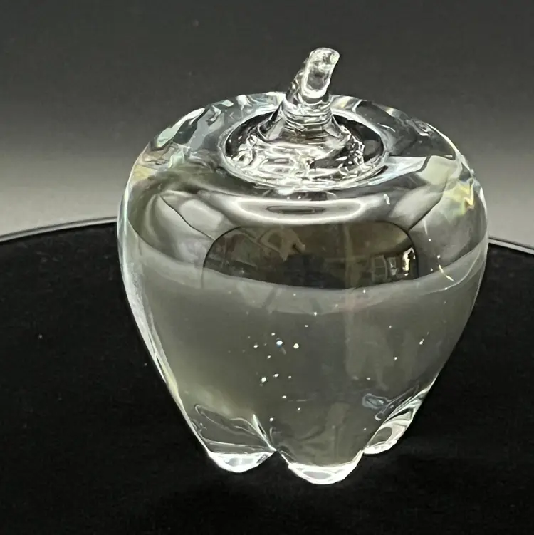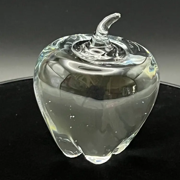 This is an adorable apple paperweight with a base shaped like the bottom of an apple. The only surface imperfection is a tiny bubble or inclusion on one side. The paperweight measures 3.25” tall and 2.5” in diameter.