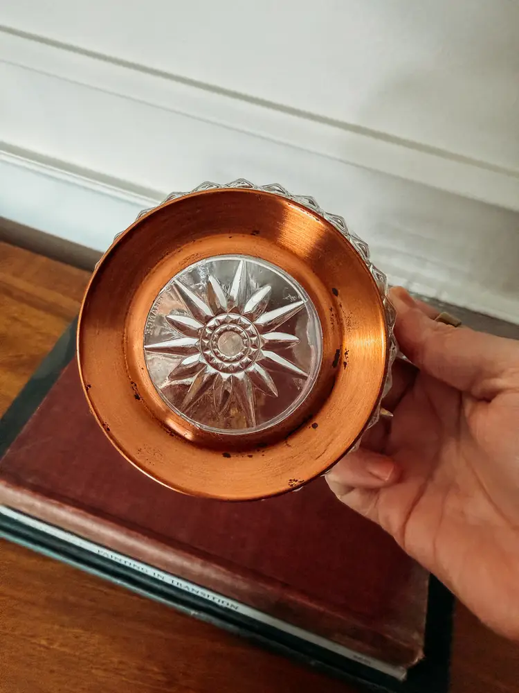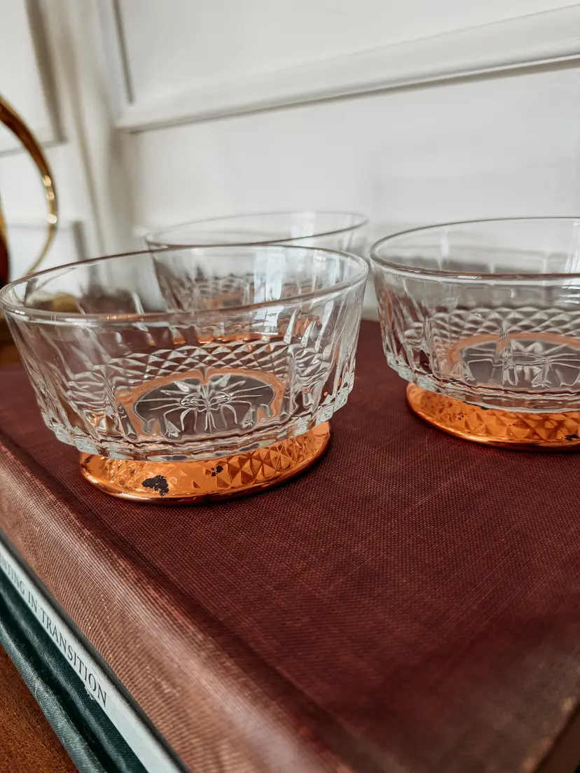 NOTE: This listing is for ONE bowl! Arcoroc France glass bowls with a Coppercraft Guild copper-plated base, featuring a "starburst" or "diamant" pressed glass pattern. Some patina on the copper but otherwise in great condition. Makes a great candy or nut dish or pillar candle holder.