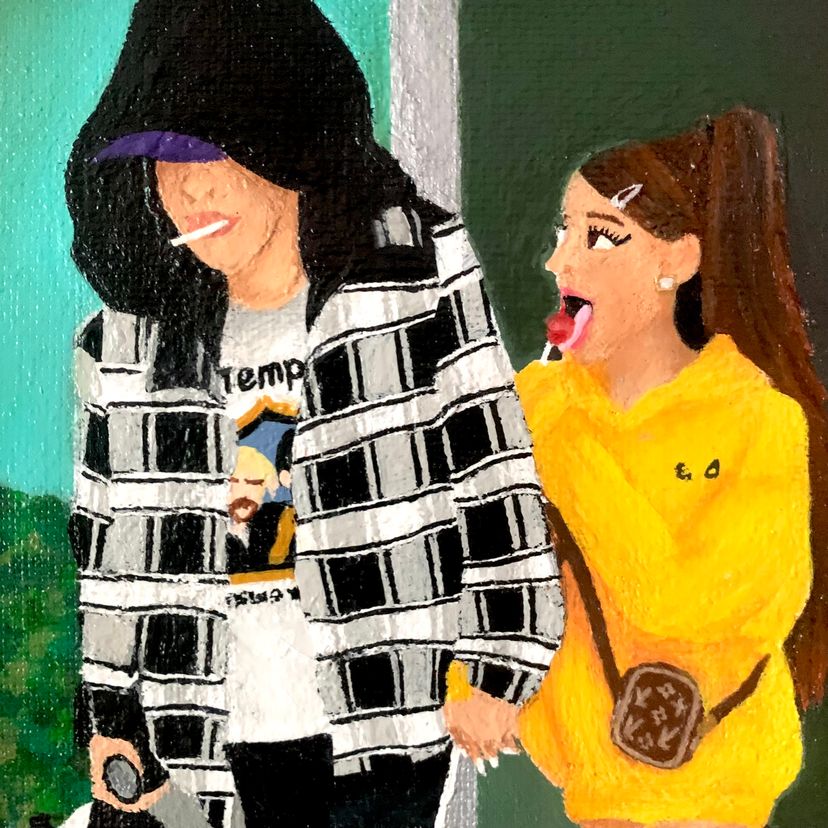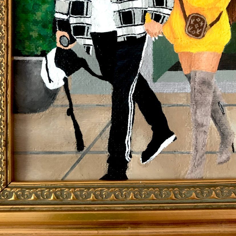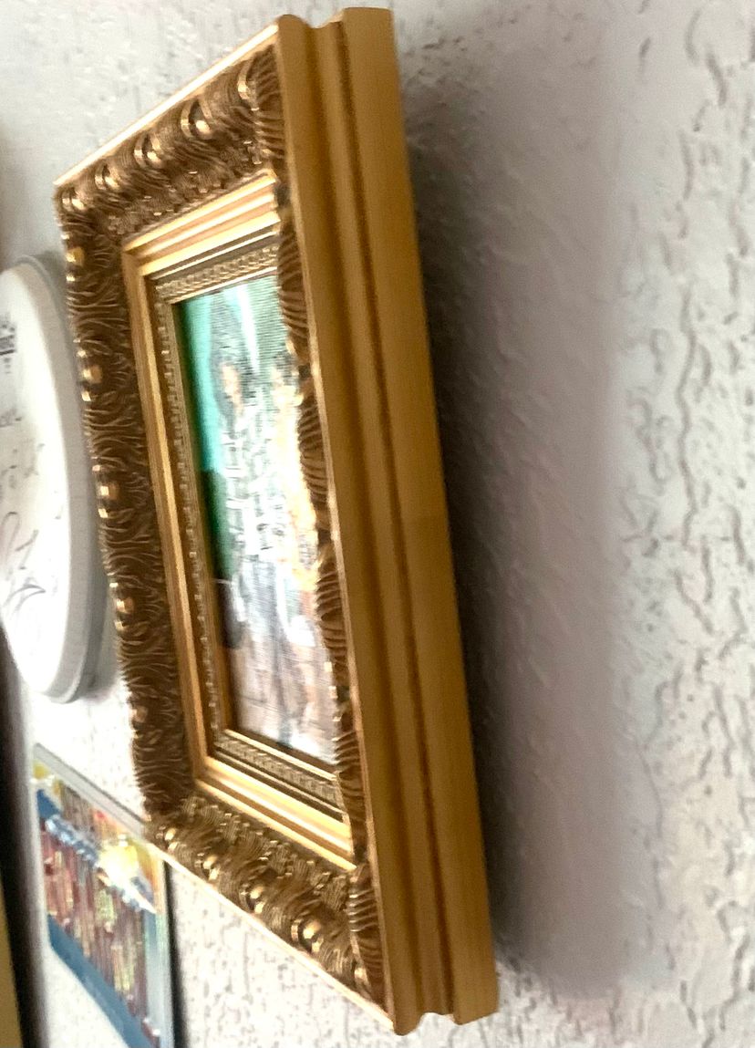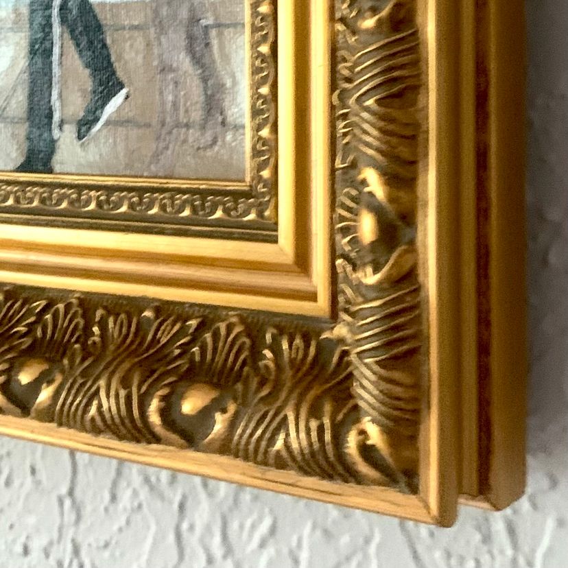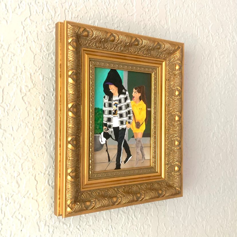 -“Pop Life #2” by Candace Bryant (2025) -Acrylic paint on back-stapled canvas. Sealed with a gloss varnish. -Measures 5x7" in a metallic gold frame; there is nothing covering the top of the painting. -The frame has a wire for wall-hanging, but there is no tabletop option. The painting is raised slightly off of the back of the frame (see last pic). -Signed and titled on the back of the canvas.