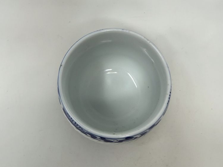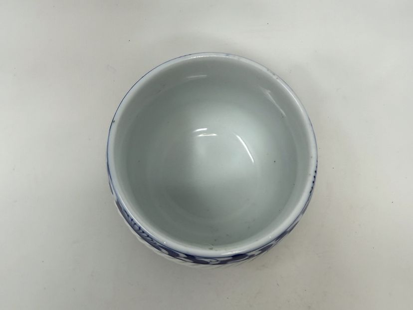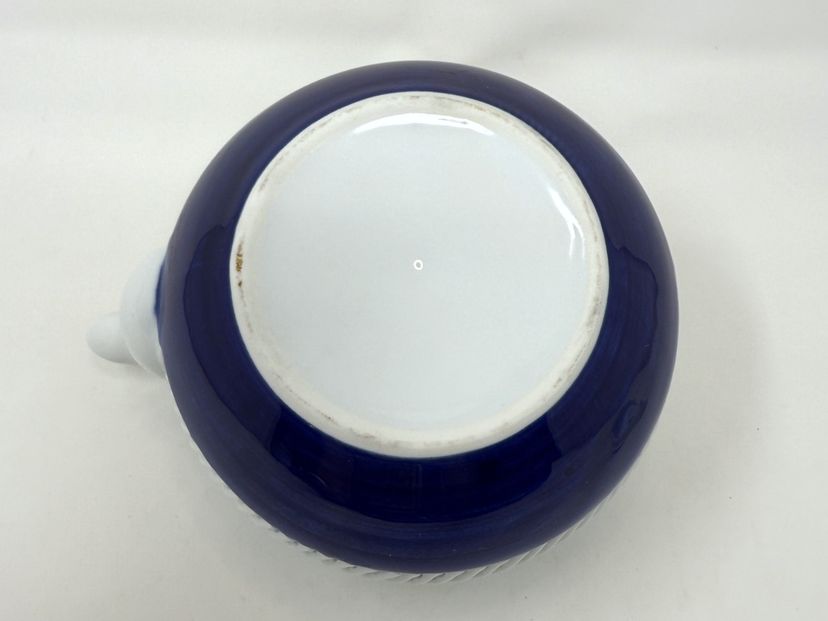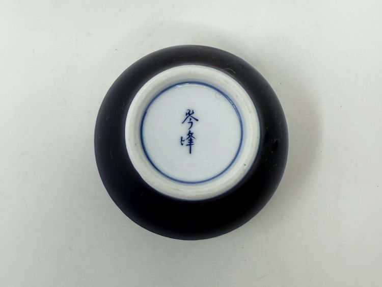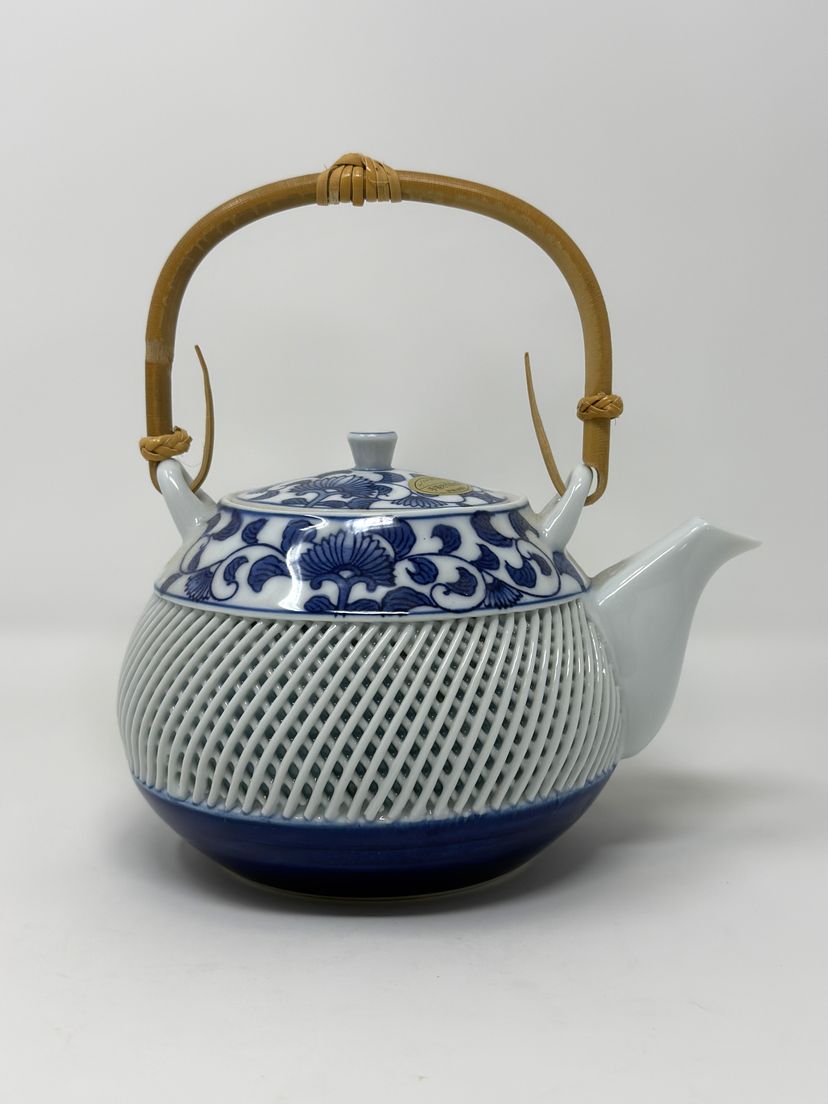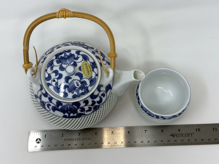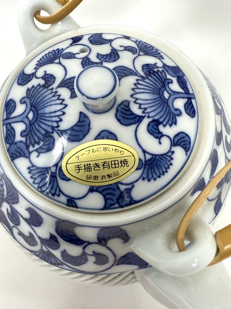 DETAILS: • Manufacturer: Arita Yaki, Arita Japan • Markings: Signature inside teapot lid and on bottom of cups, and original label on teapot lid • Era: c1980s • Material: Porcelain with bamboo handle on teapot • Dimensions: Teapot 7″ W × 5″ H; Cups 2.75″ H × 2.75″ diameter