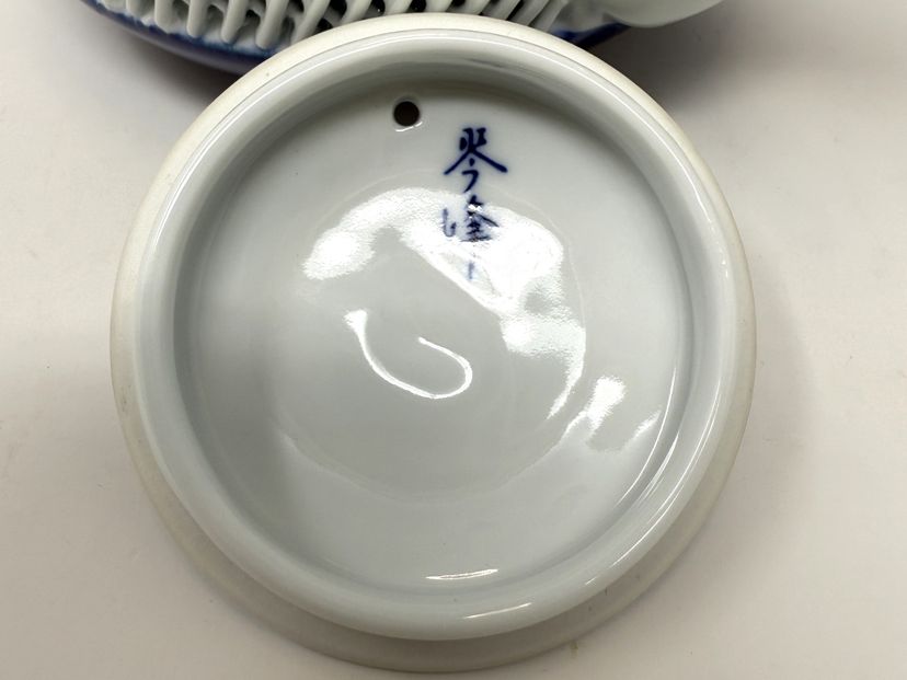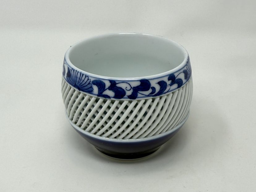 Each piece showcases delicate blue under-glaze painting over a distinctive white lattice porcelain body. The set is in excellent unused condition.