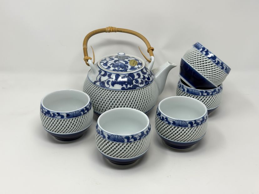 Vintage Arita Yaki porcelain teapot set with 5 hand-painted blue floral lattice cups—perfect for Japanese tea ceremonies, cottagecore décor & thoughtful gifting.