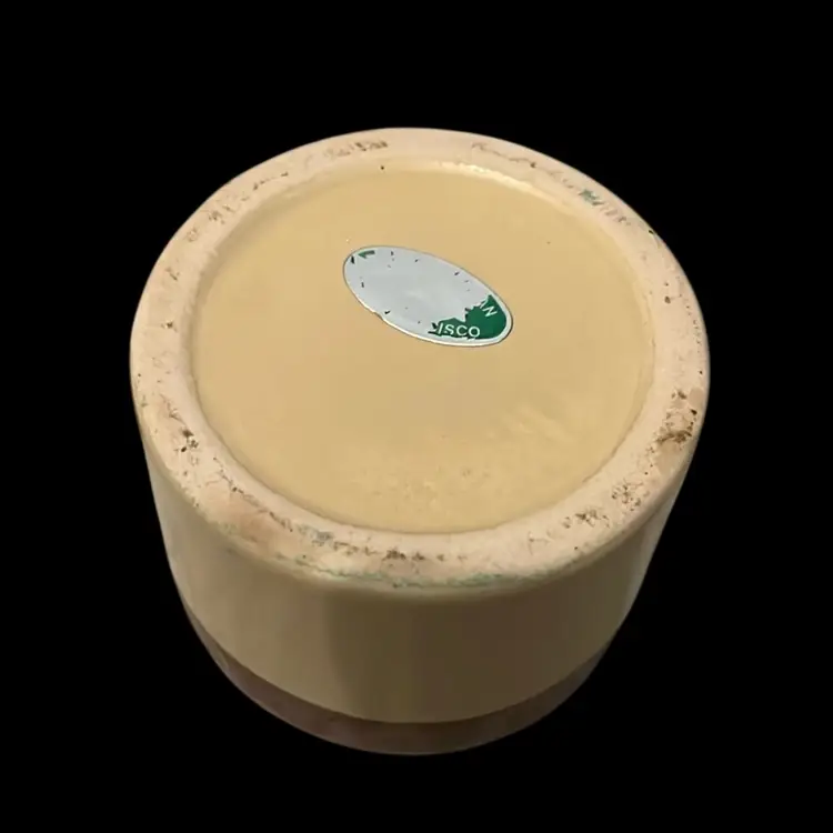 Features a glossy, two-tone glaze with a dark brown top section and a lighter tan or beige bottom section. 4 inches tall with lid and 2 1/2 across Partially sticker on bottom, suggests its maker is Armbee San Francisco and made in Taiwan. Probably from 1970’s