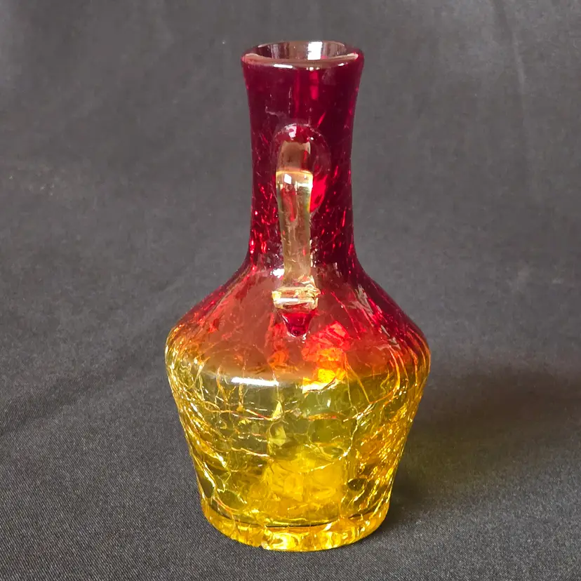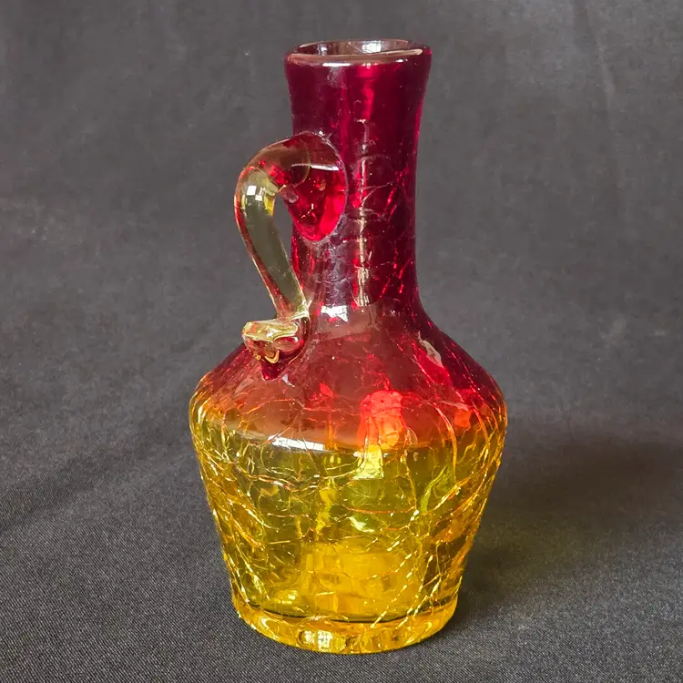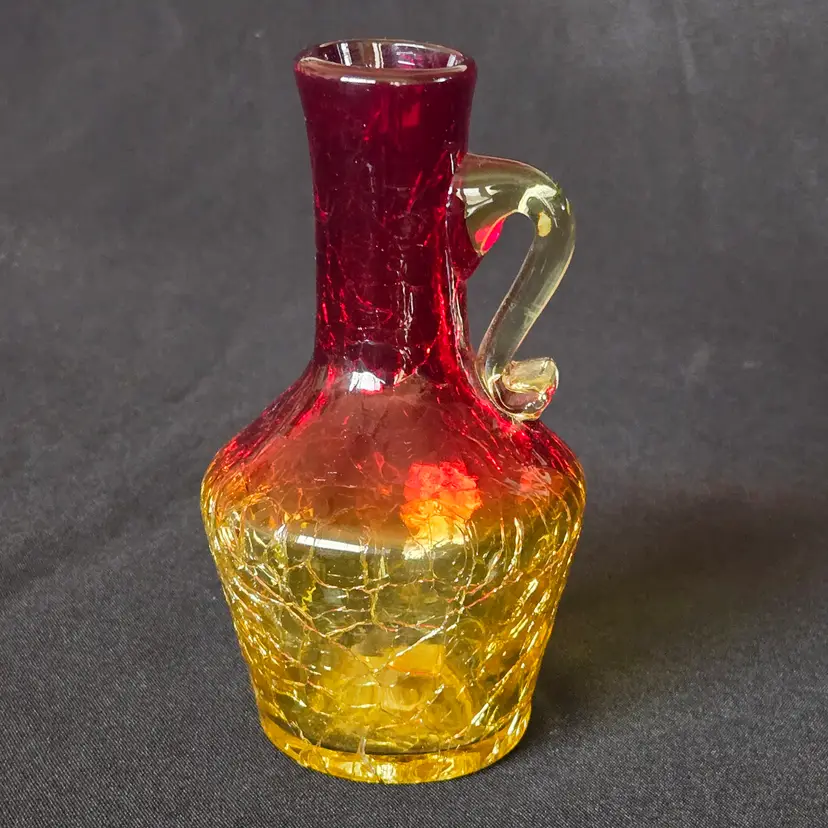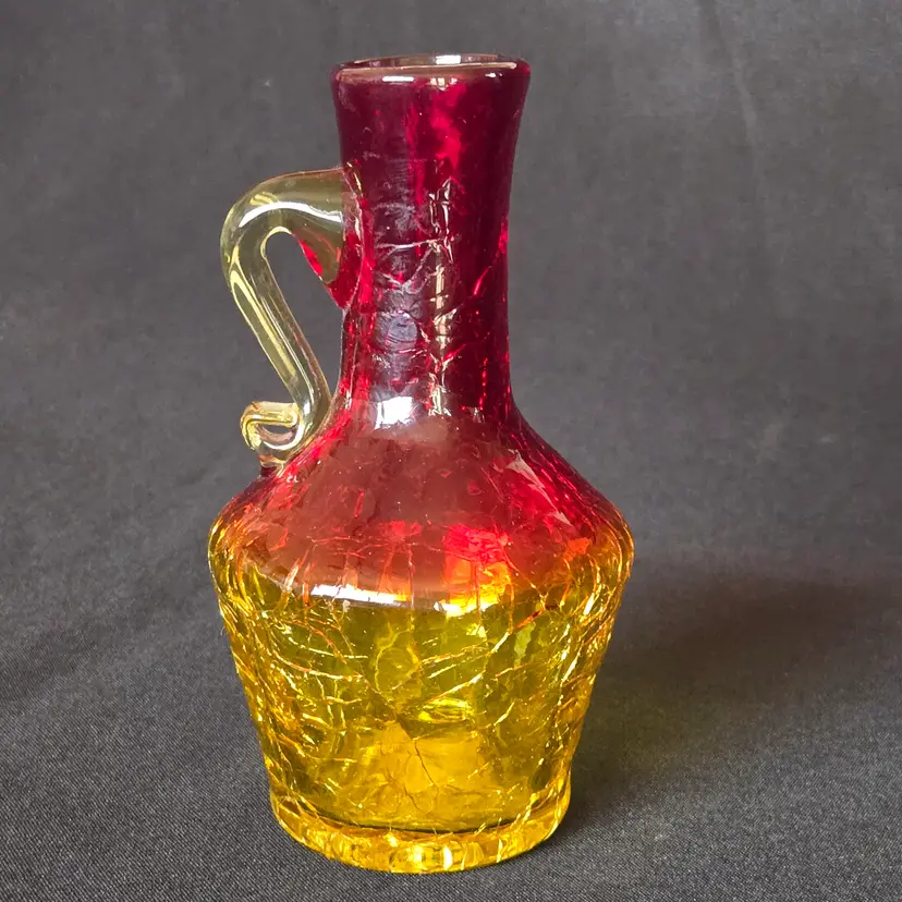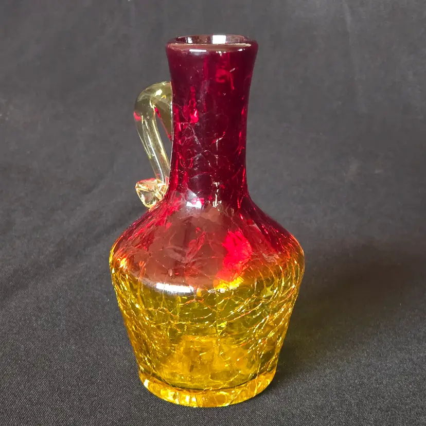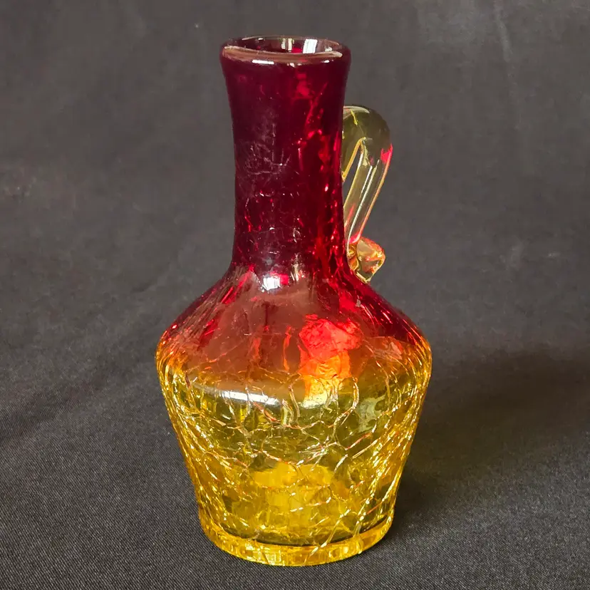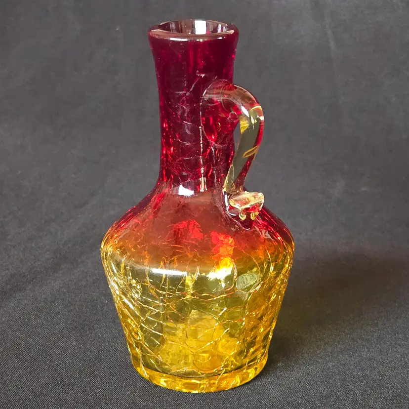 Art Crackle Glass Handblown Amberina UV Glowy Handled Pitcher Applied Clear Handle 4⅞" Tall Vintage. Used condition with dust, rough and dark pontil, etc. Please view all the photos and read the entire item description and please ask any questions prior to purchase when possible. The amberina red to yellow color gradient and applied clear handle make it a unique piece. The pitcher is 4⅞ inches tall.