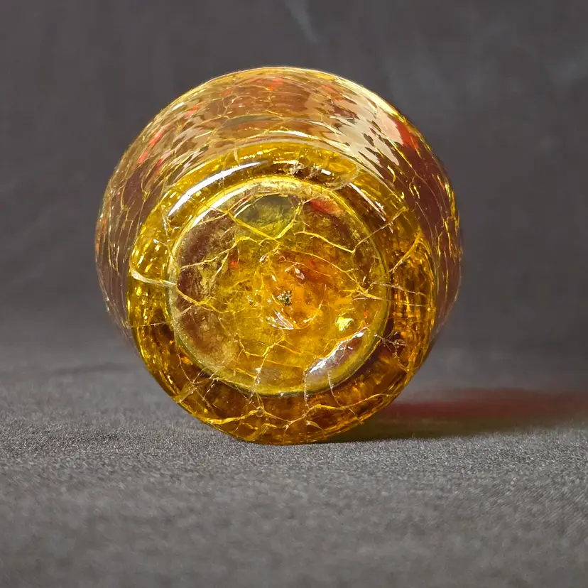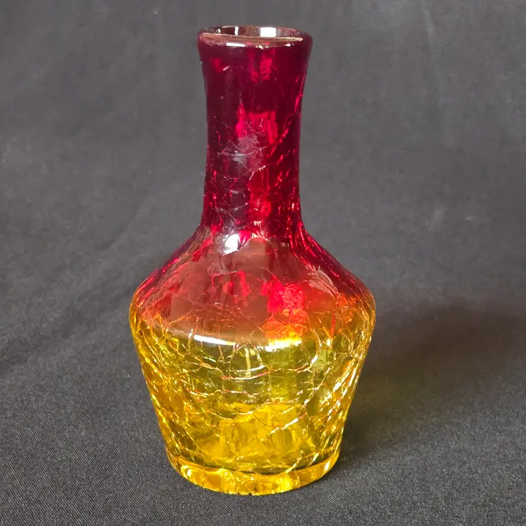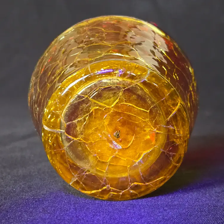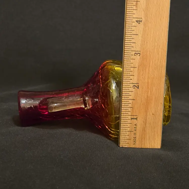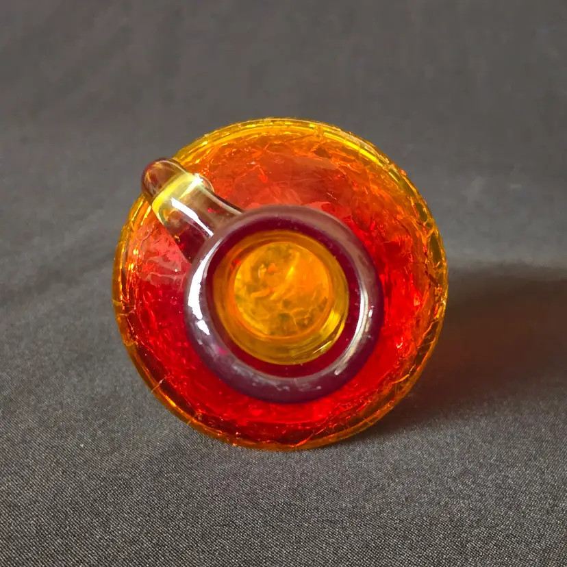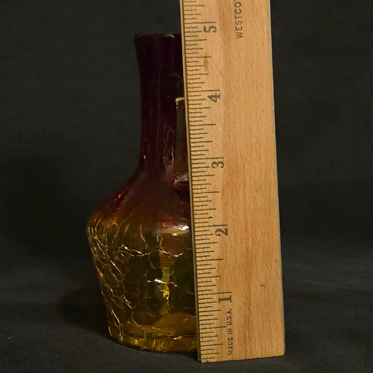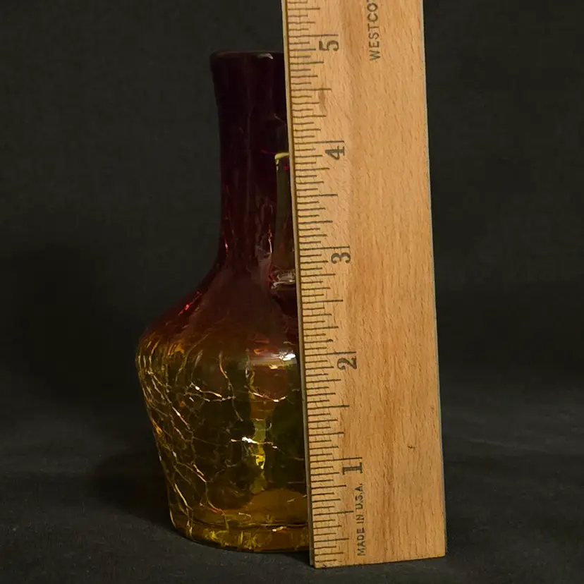 Art Crackle Glass Handblown Amberina UV Glowy Handled Pitcher Applied Clear Handle 4⅞" Tall Vintage. Used condition with dust, rough and dark pontil, etc. Please view all the photos and read the entire item description and please ask any questions prior to purchase when possible. The amberina red to yellow color gradient and applied clear handle make it a unique piece. The pitcher is 4⅞ inches tall.
