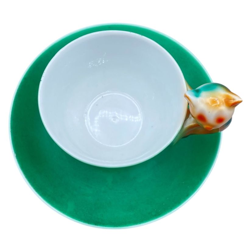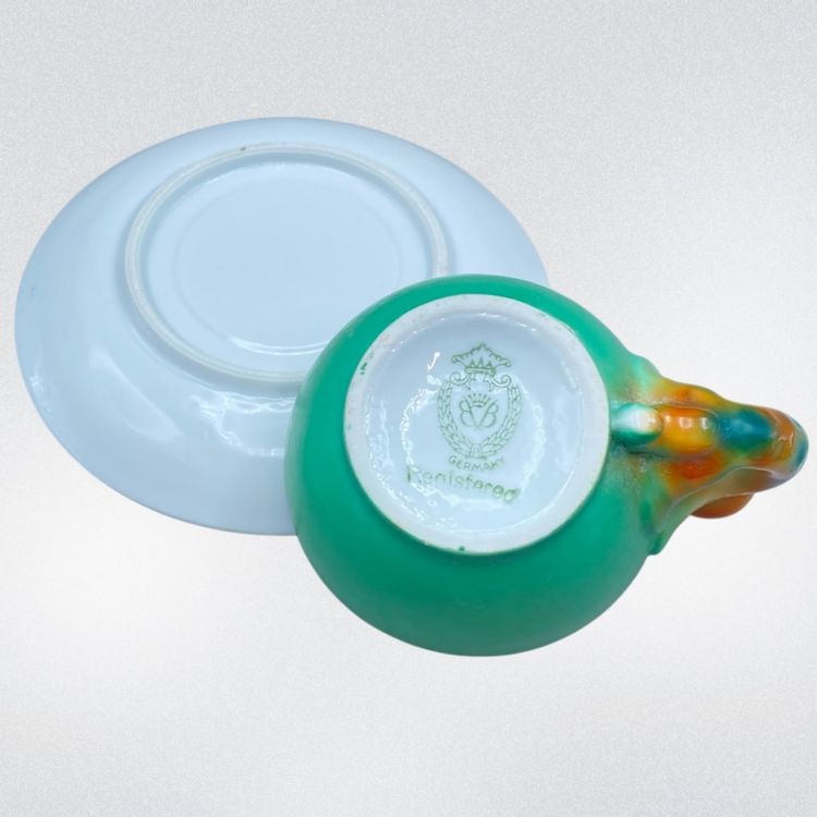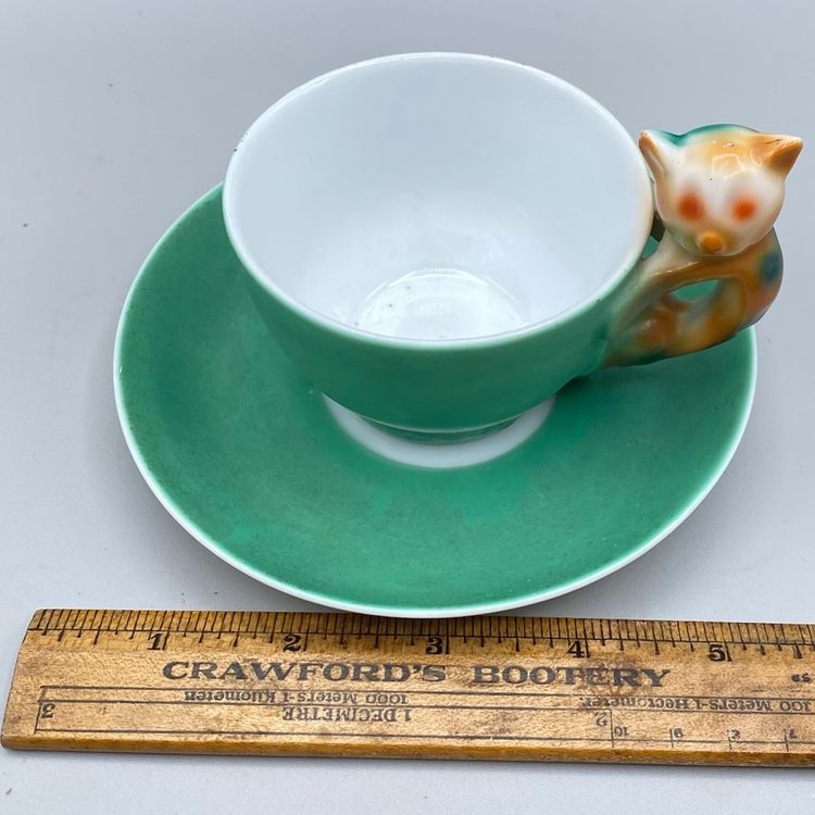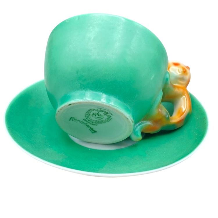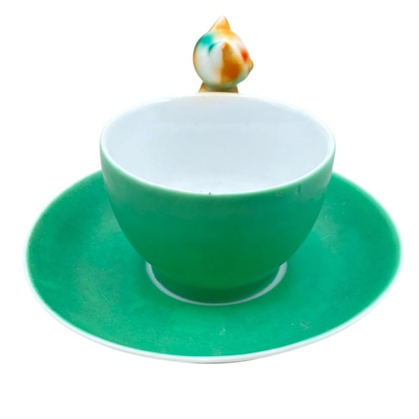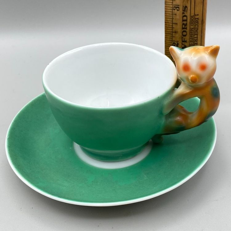 Art Deco Beyer and Boch Cat Handle Porcelain Teacup and Saucer Antique Delicate Whimsical