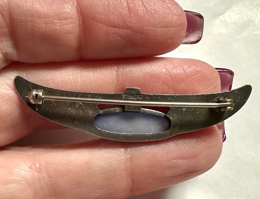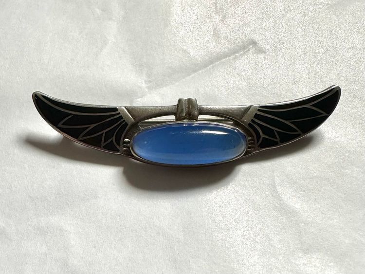 Wonderful art deco brooch in Egyptian Revival style. It is sterling with black enamel and set with a moonstone. It measures 2 1/8”. It is in excellent condition.