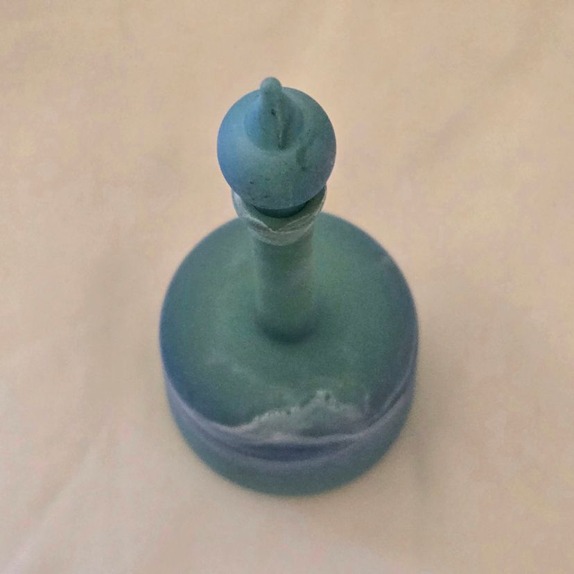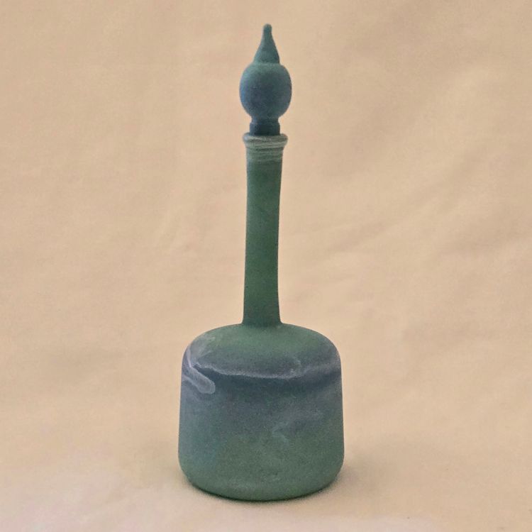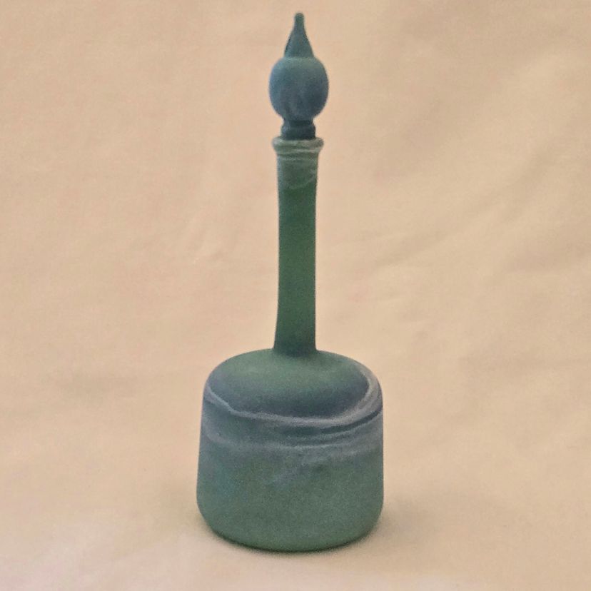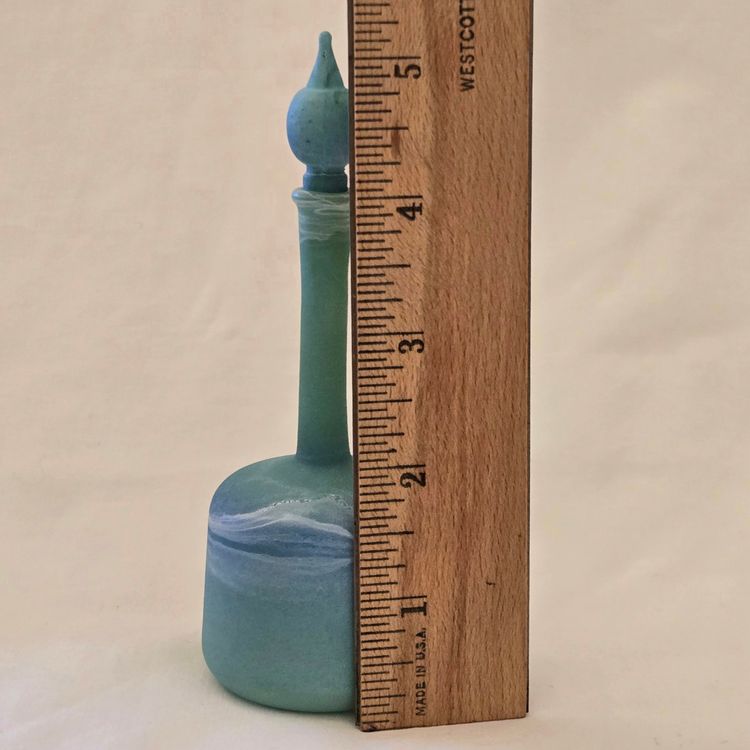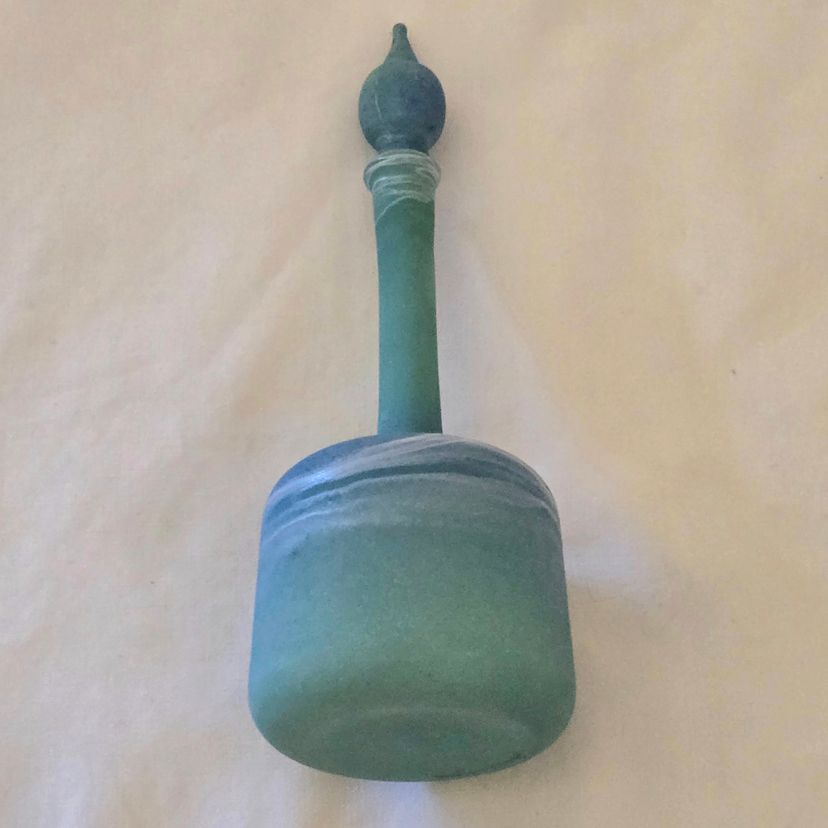 Art Glass Bottle Lidded Handmade Turquoise w/ Decorative Swirl 5" Tall Unbranded. Used condition with blue painted color thinning and missing spots of color, inside stopper seems to be rough, long stem appears to be a bit crooked. Please view all the photos and please ask any questions prior to purchase when possible.