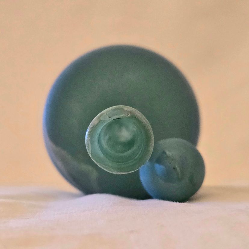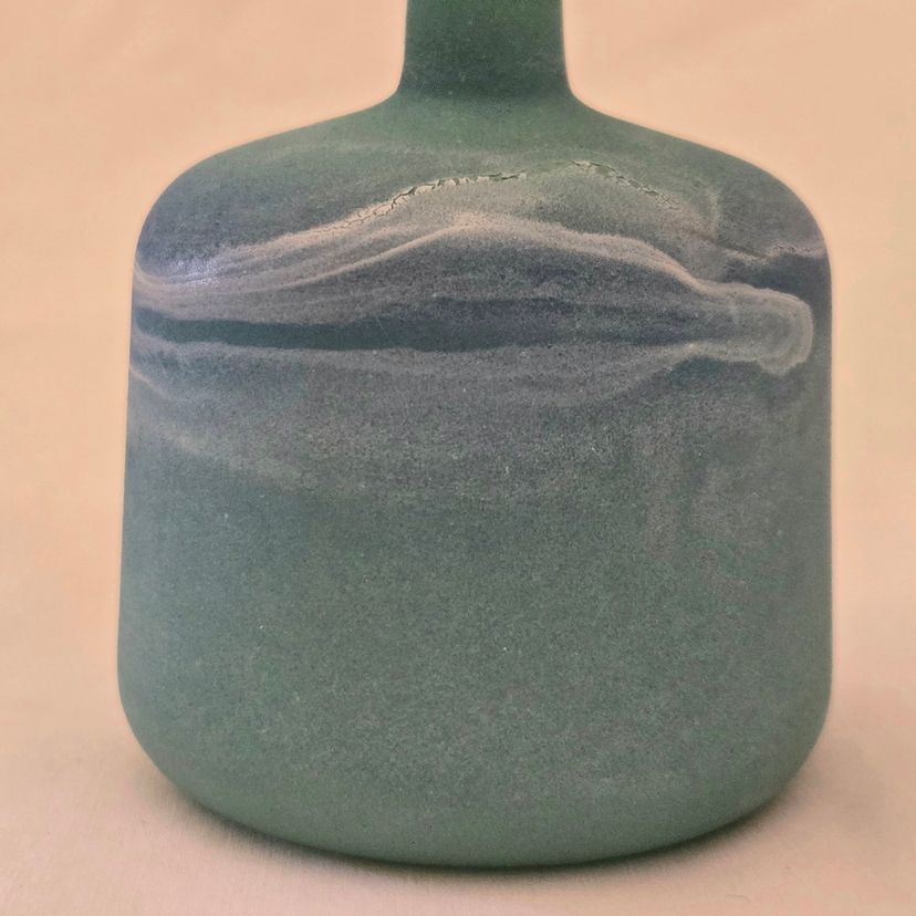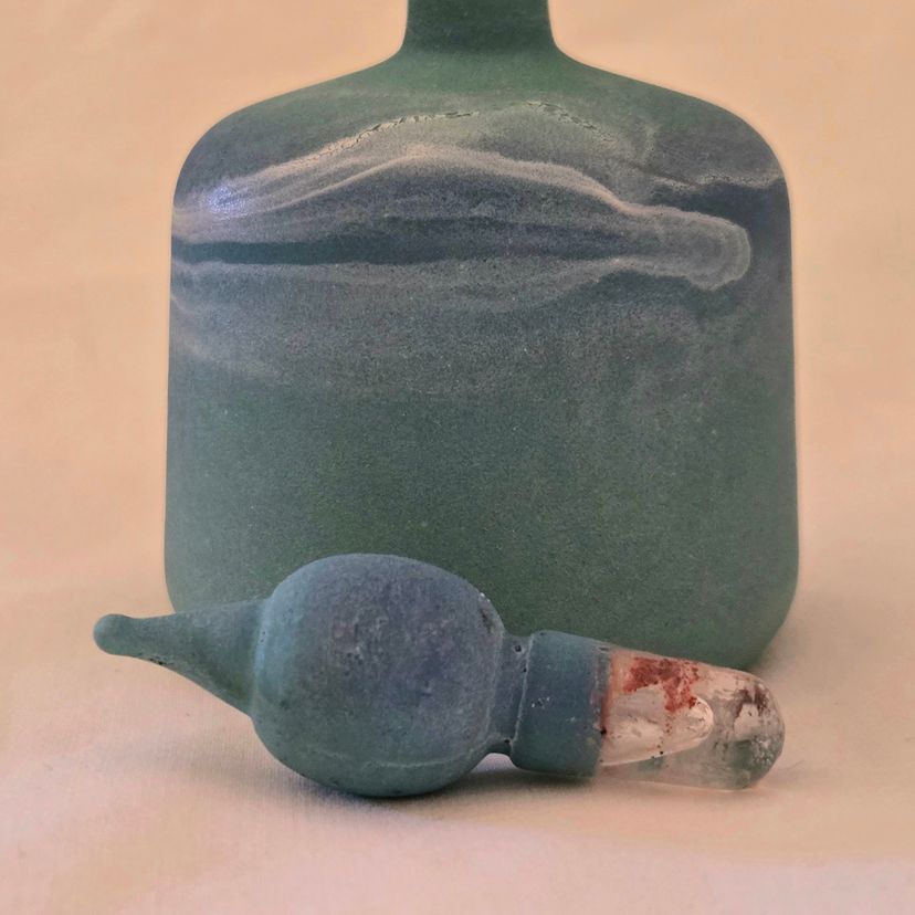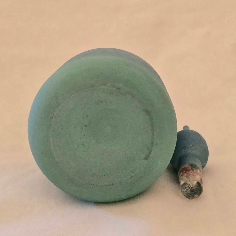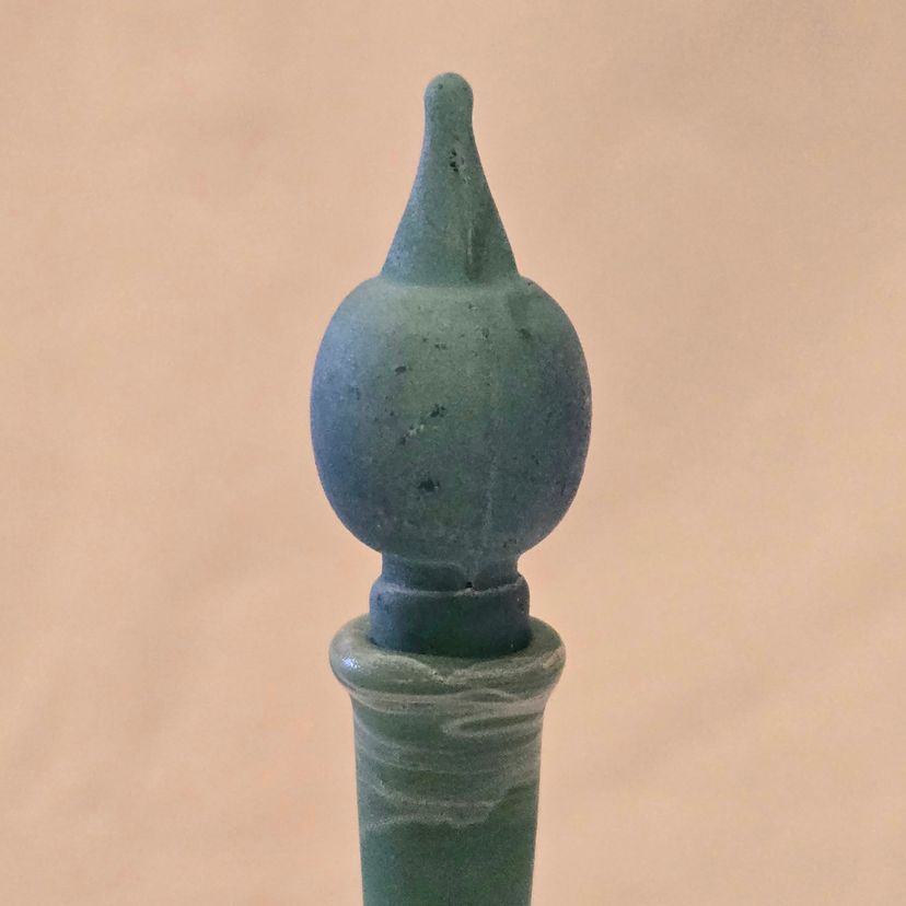 Art Glass Bottle Lidded Handmade Turquoise w/ Decorative Swirl 5" Tall Unbranded. Used condition with blue painted color thinning and missing spots of color, inside stopper seems to be rough, long stem appears to be a bit crooked. Please view all the photos and please ask any questions prior to purchase when possible.