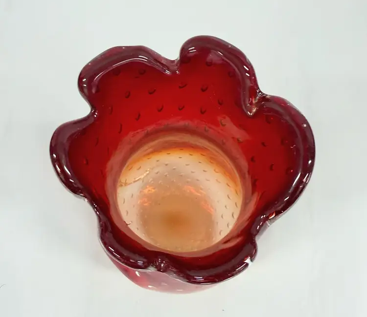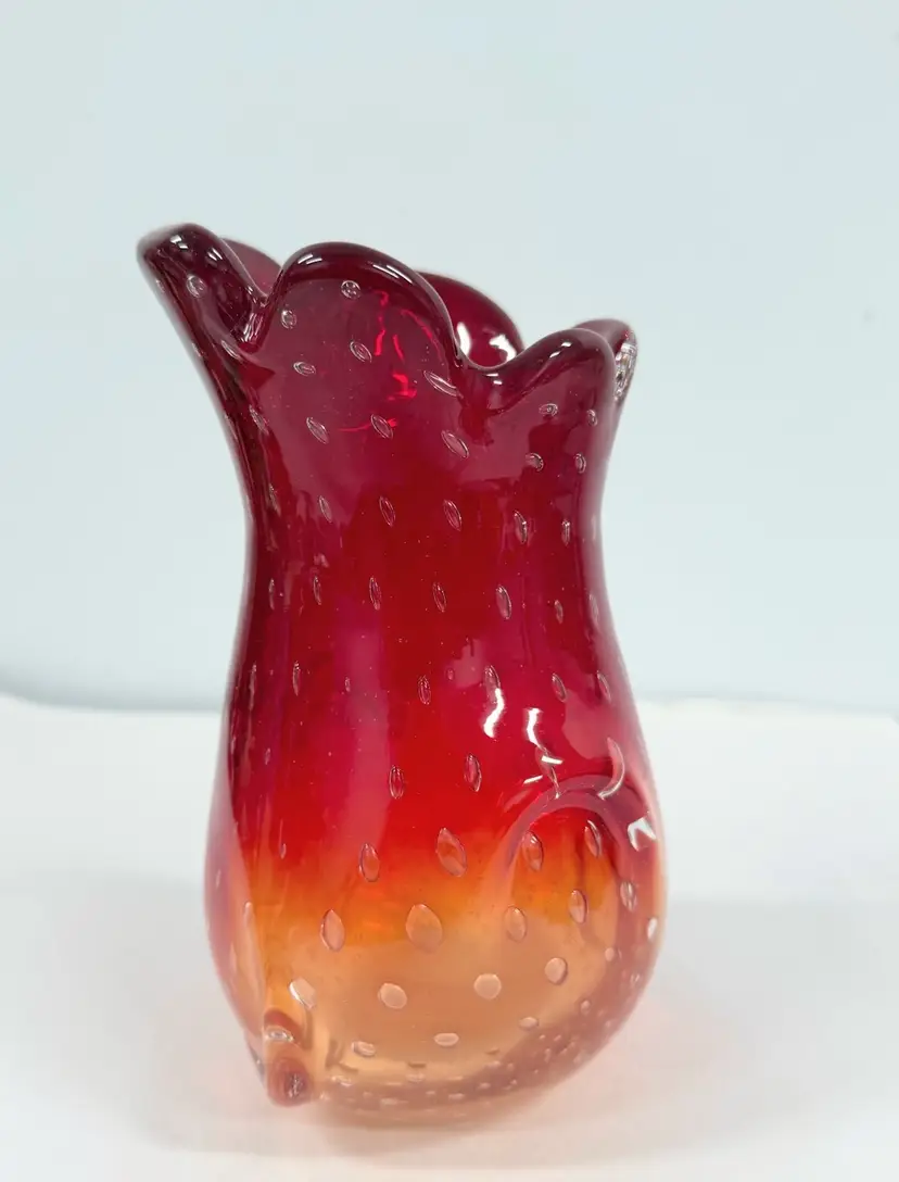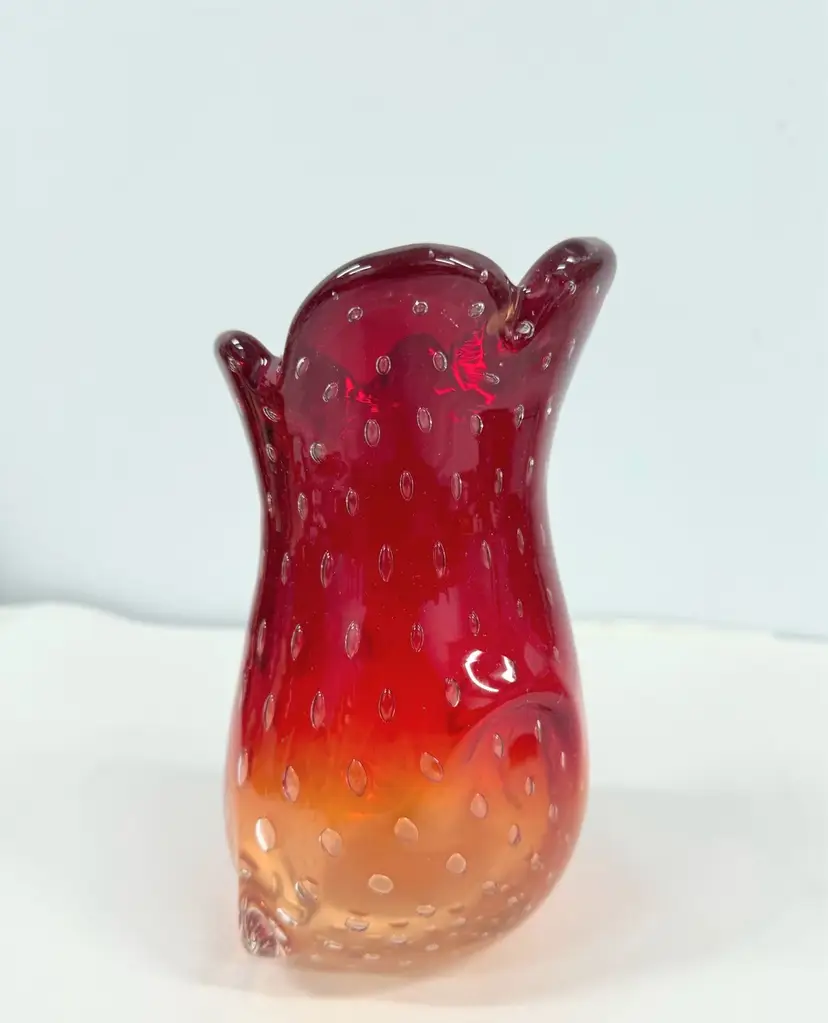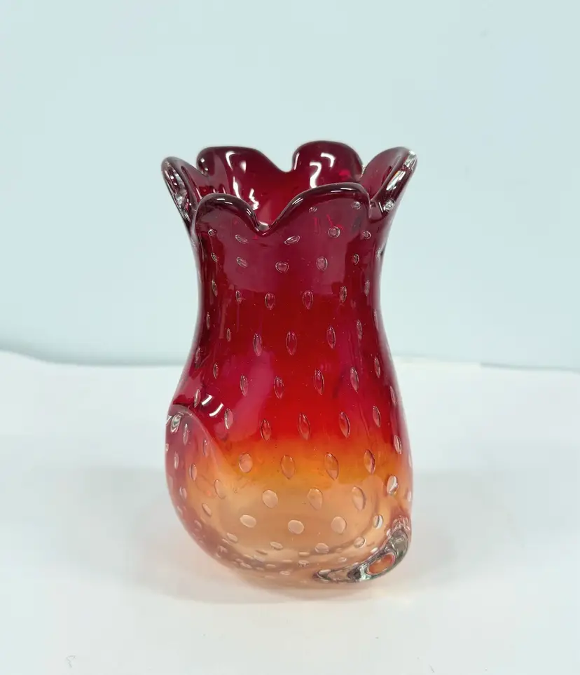 This beautiful vase is a stunning example of art glass at its finest. The intricate bullicante pattern in red ombre bubbles is sure to catch the eye of anyone who sees it. The vase is hand blown and pulled, creating a unique and one-of-a-kind piece.