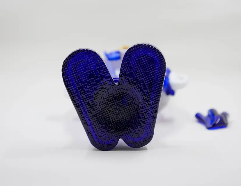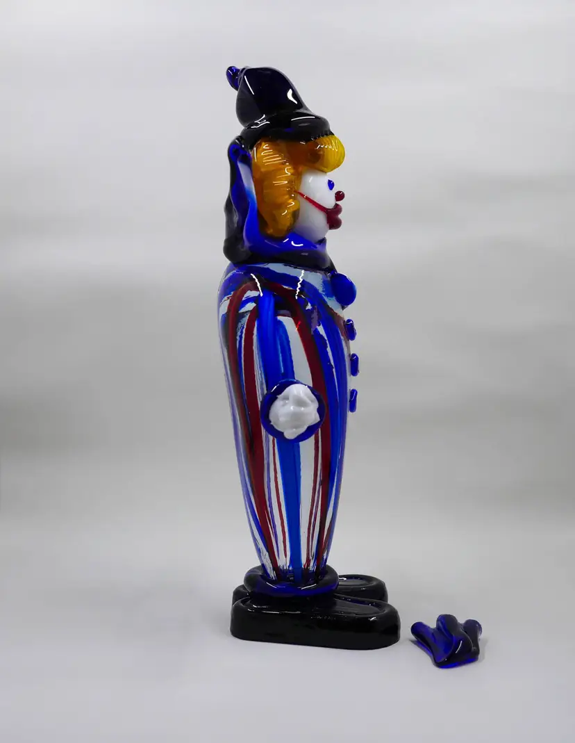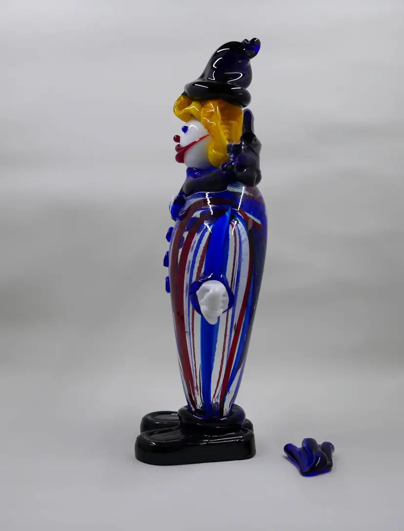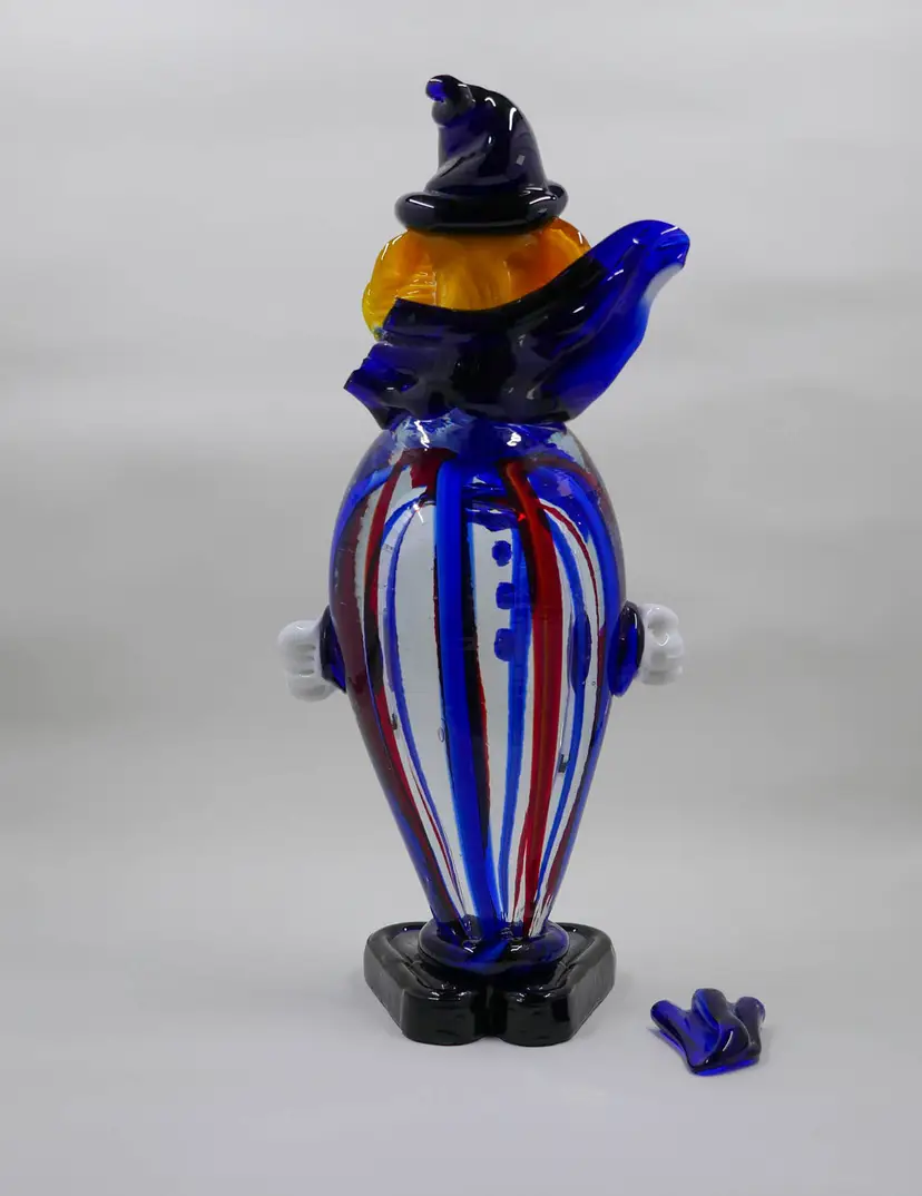 A hand-blown glass clown figurine with a clear body, red and blue striped pants. The bow-tie, collar, shoes and hat are cobalt blue. There is a visible break on the right frill of the collar, as noted in the photographs. The broken off glass piece will be included should the buyer wish to make the repair. It appears to be a clean break and should be easy to piece back together, but I did not want to repair it poorly. The figurine is heavy and has no other chips or cracks. There's no sticker or signature that I can find, references point to Murano, but I cannot confirm, so it is being sold as an art glass piece in as-is condition due to the broken collar frill. Approx. size: 10.5" tall x 5" wide.