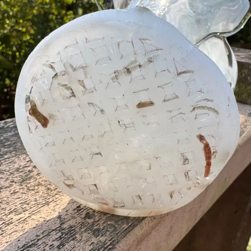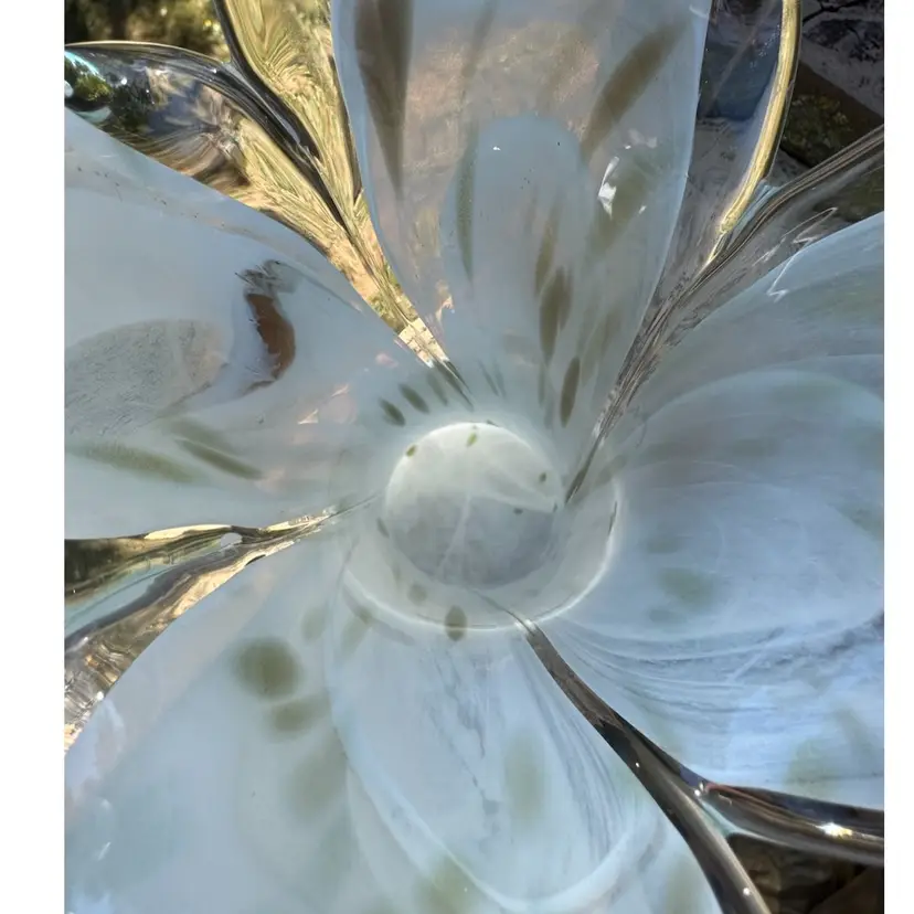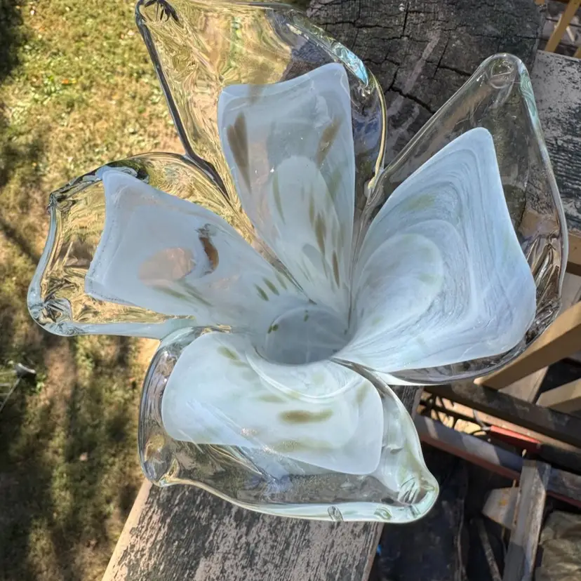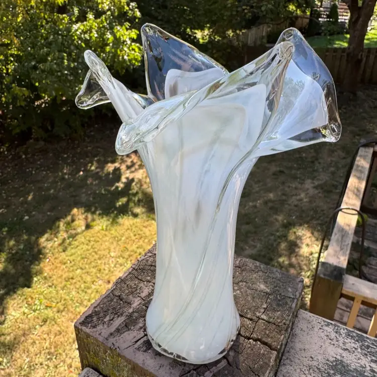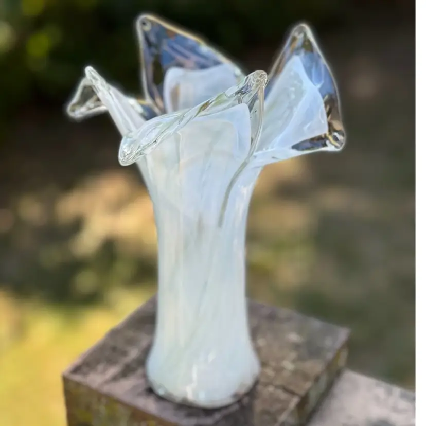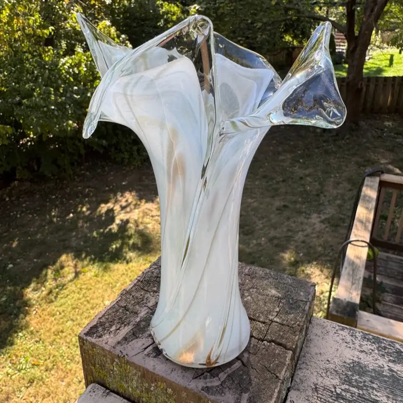 Amazing art glass vase with shimmery gold throughout. Would be beautiful with fresh Christmas greens and flowers or all white flowers for a winter floral display. Tiny crack on top, but not noticeable. Measures 8.5” tall.