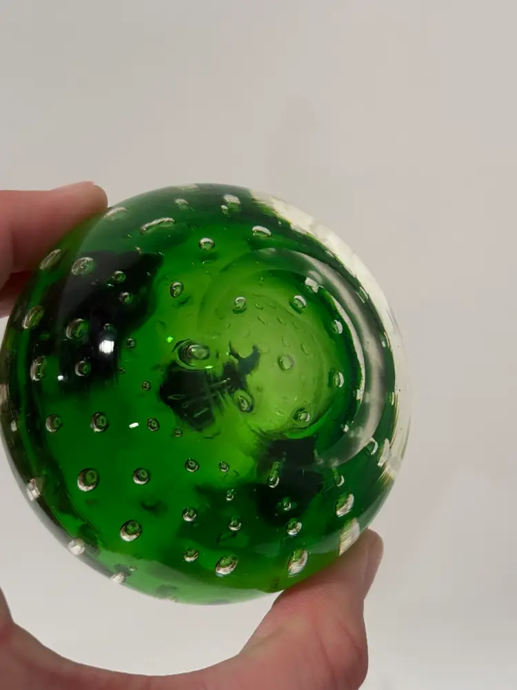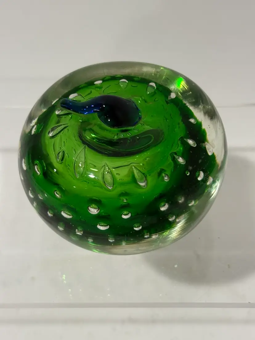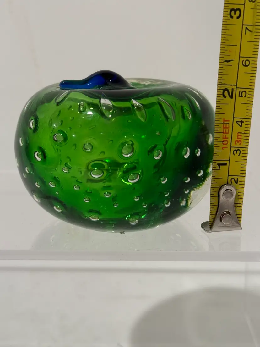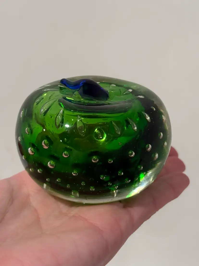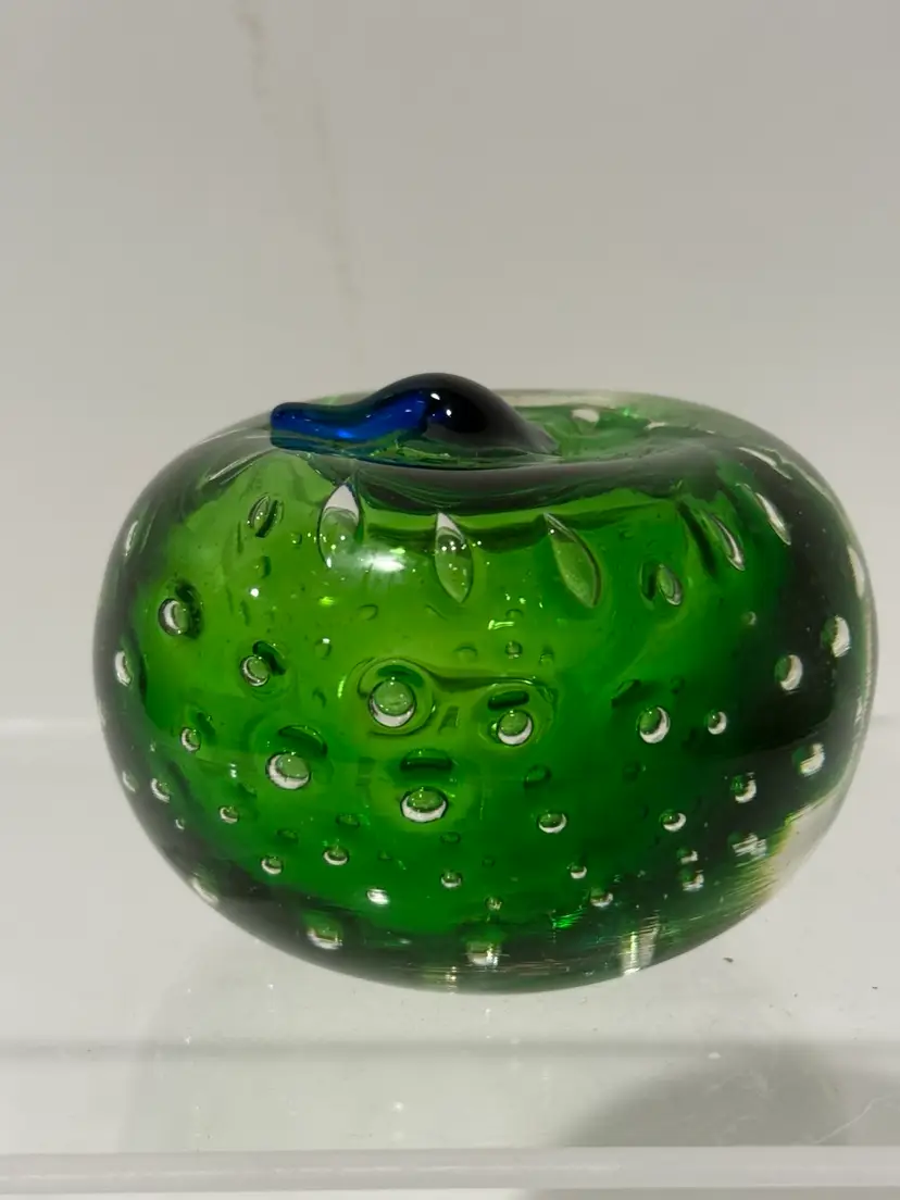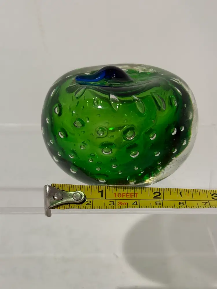 Add a touch of elegance to your desk with this stunning green art glass paperweight. The apple shape is beautifully detailed with a blue stem that makes it look like a real apple. The green color is rich and vibrant, making it a perfect addition to any office or home decor.