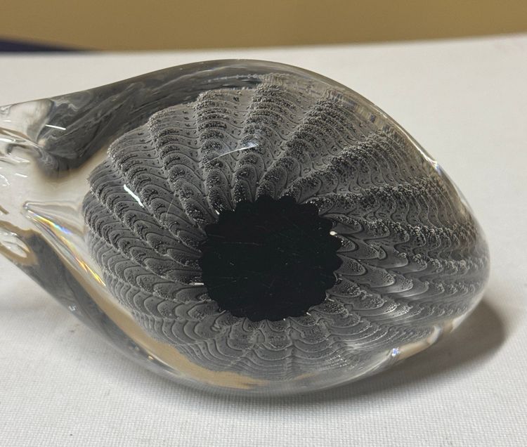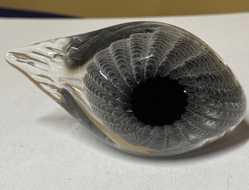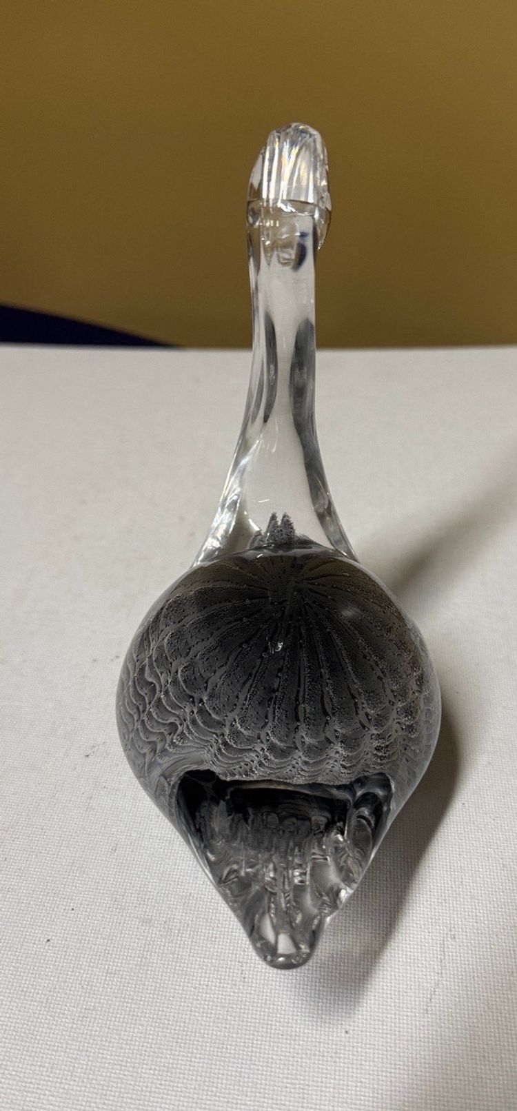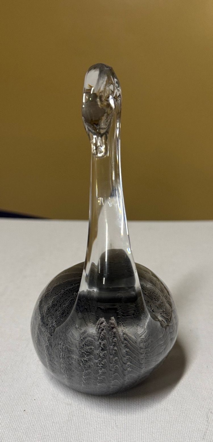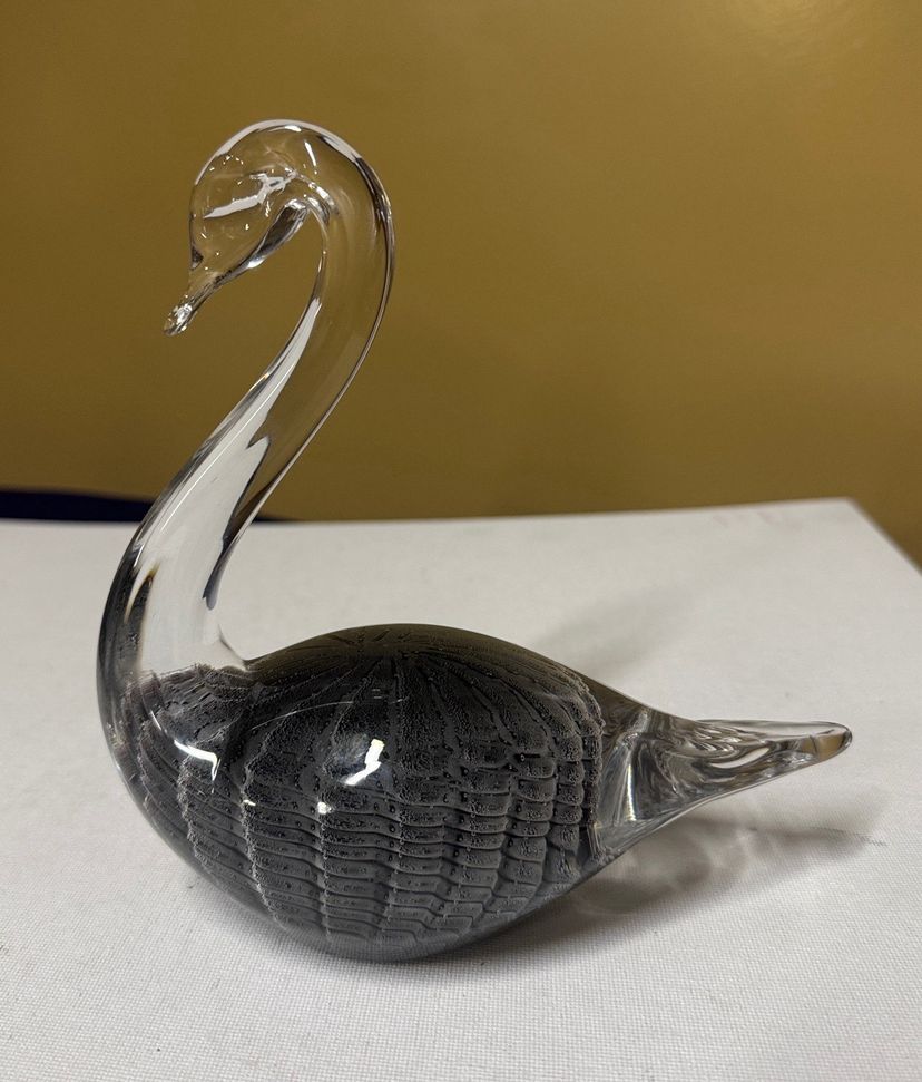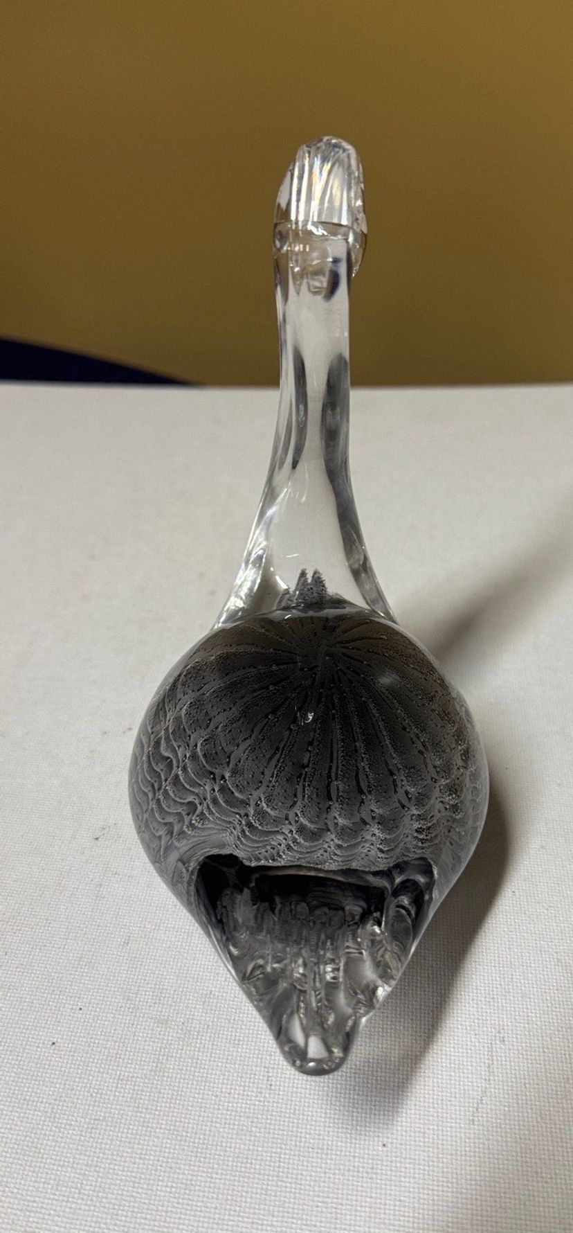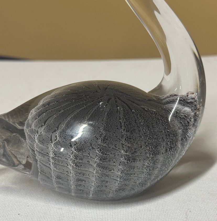 Beautiful glass swan figurine with a sleek design. Features a clear and gray color scheme. Art Glass Swan - Fumato Effect clear with gray 6.5” tall 6” long Beautiful and in excellent condition with no breaks chips or bruises (11391020252)