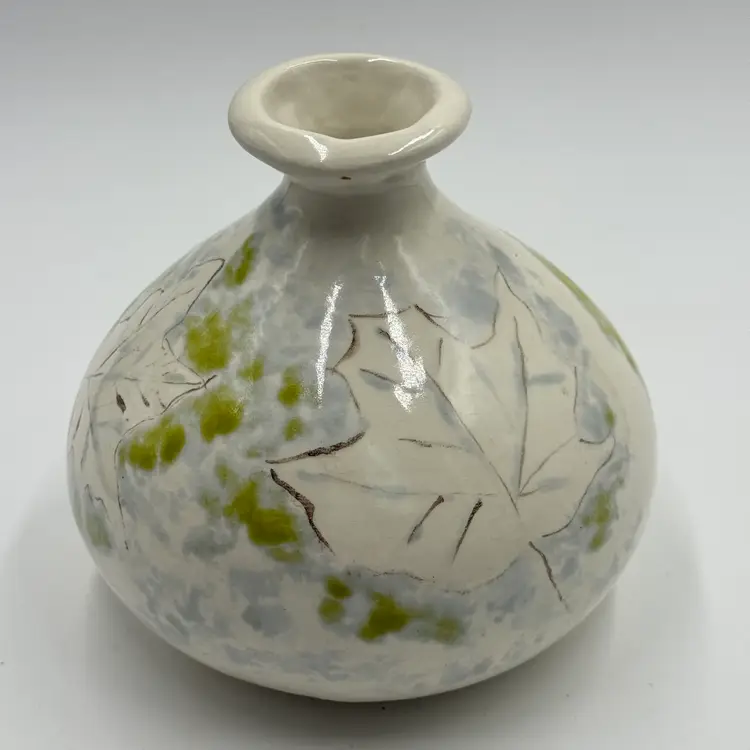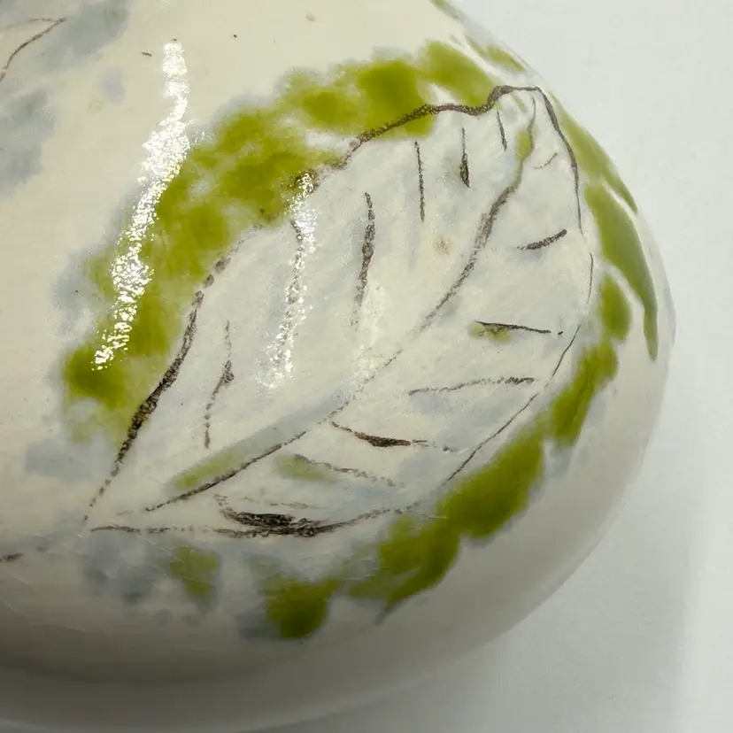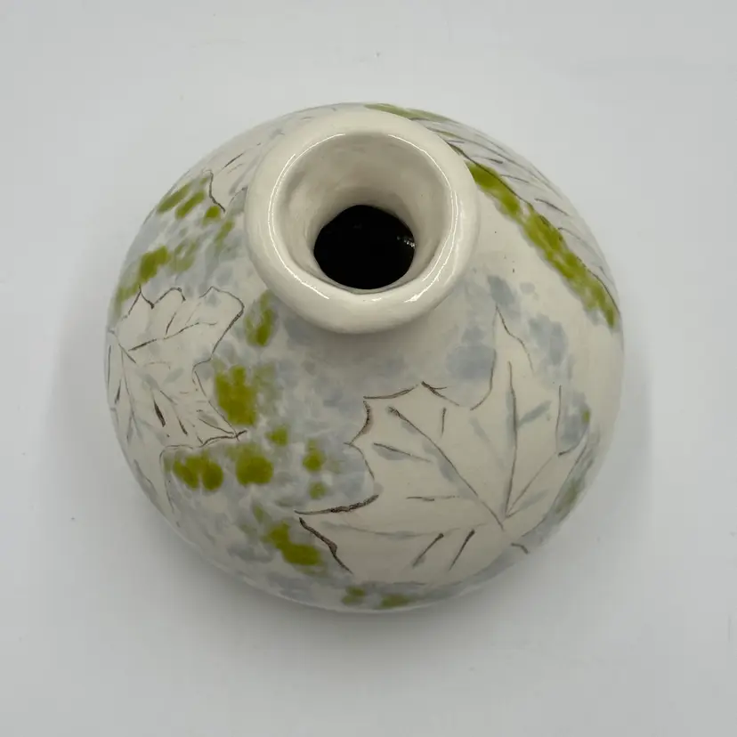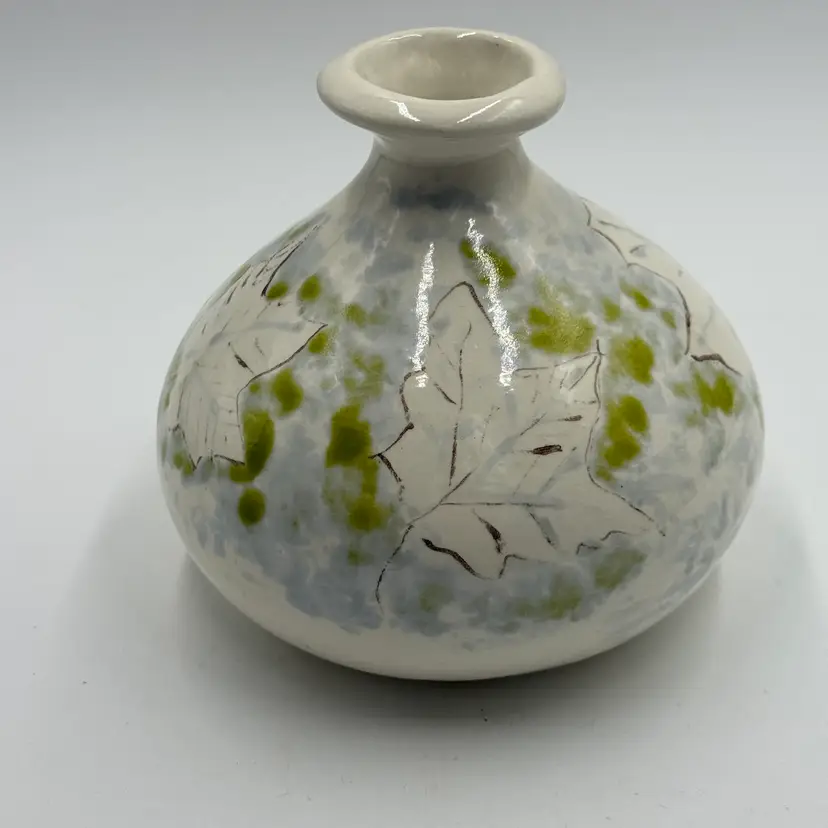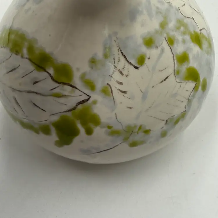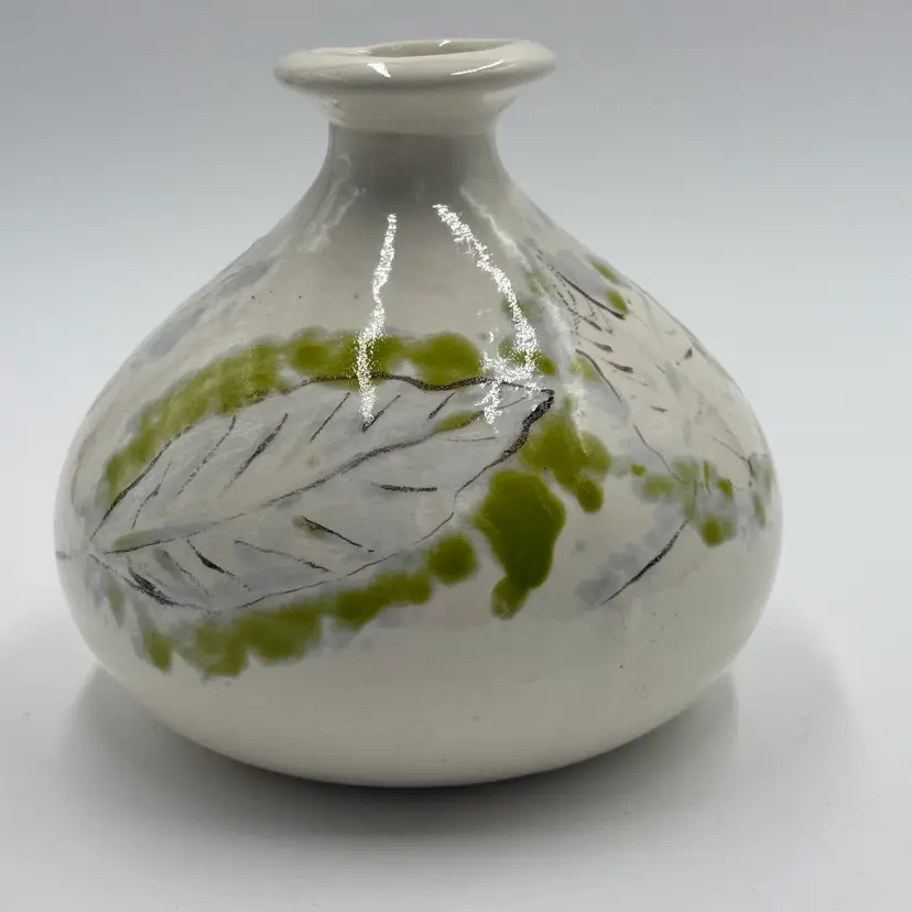 Art Pottery White Bulbous Round Bud Vase Hand Painted Botanical Green Leaf Motif