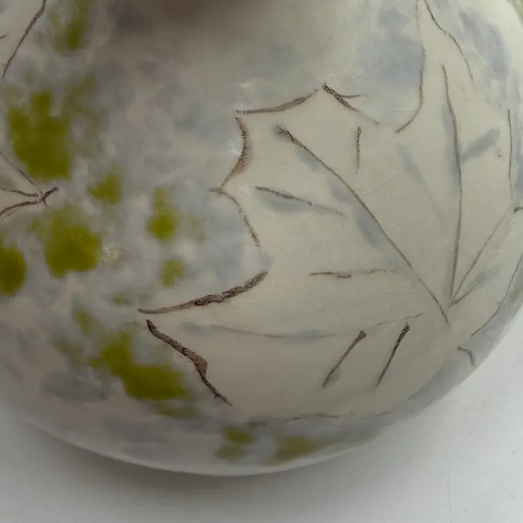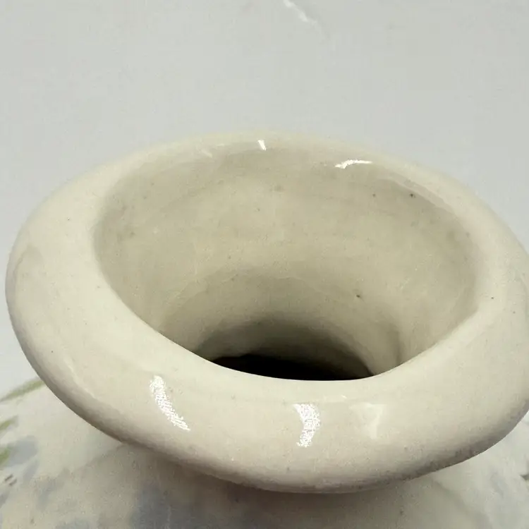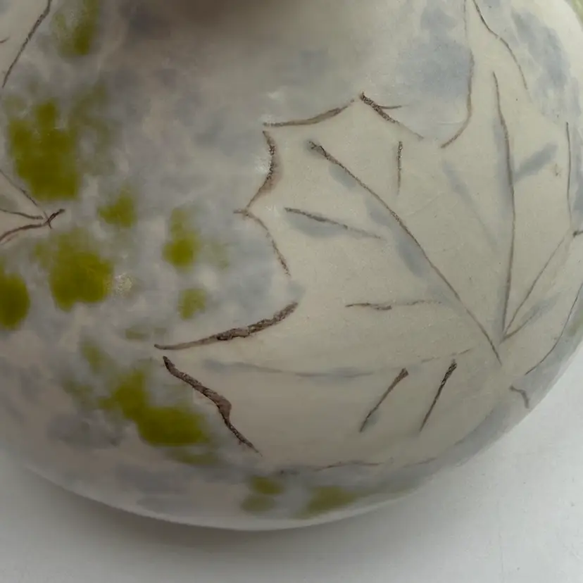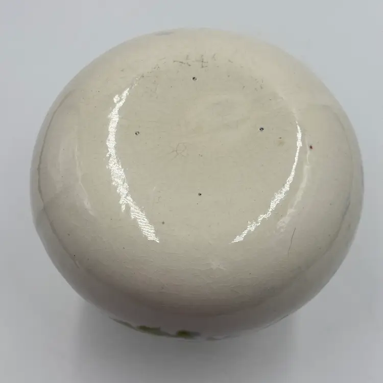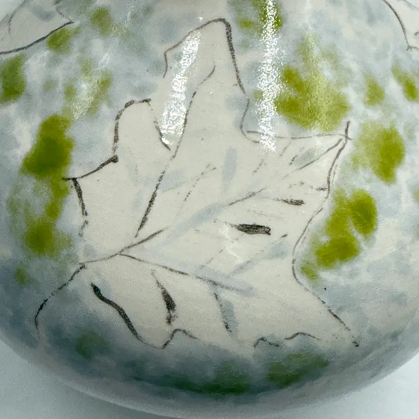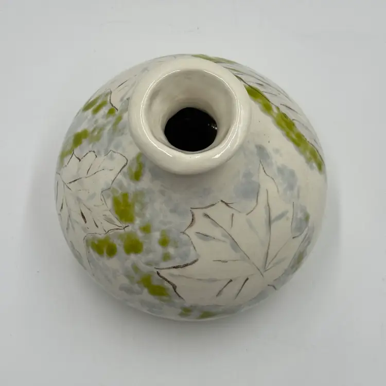 Art Pottery White Bulbous Round Bud Vase Hand Painted Botanical Green Leaf Motif