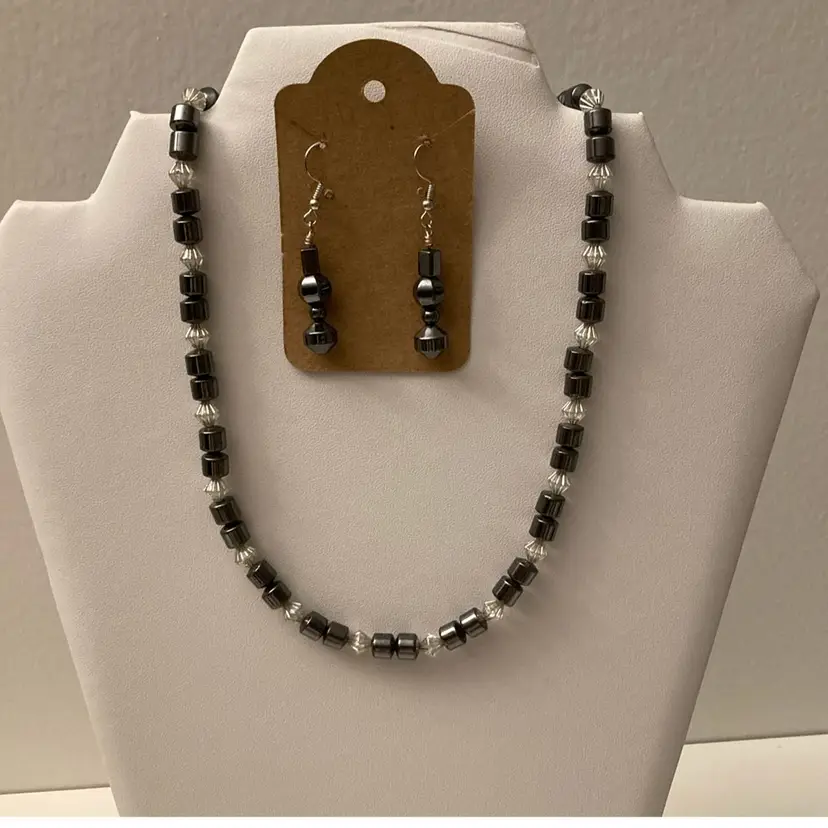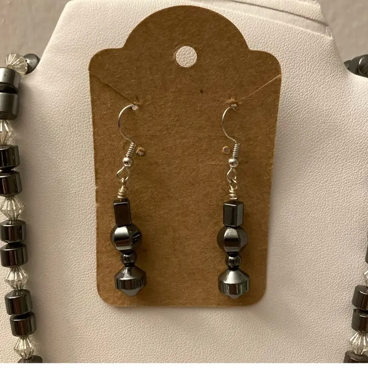 Artisan Hematite and silver tone beaded necklace with matching earrings. The necklace measures 19” and fastens with a lobster cloure. The earrings just have the Hematite beads and dangle down 2”.