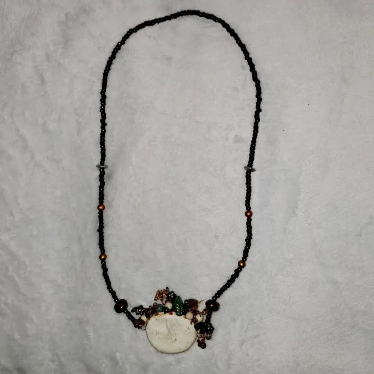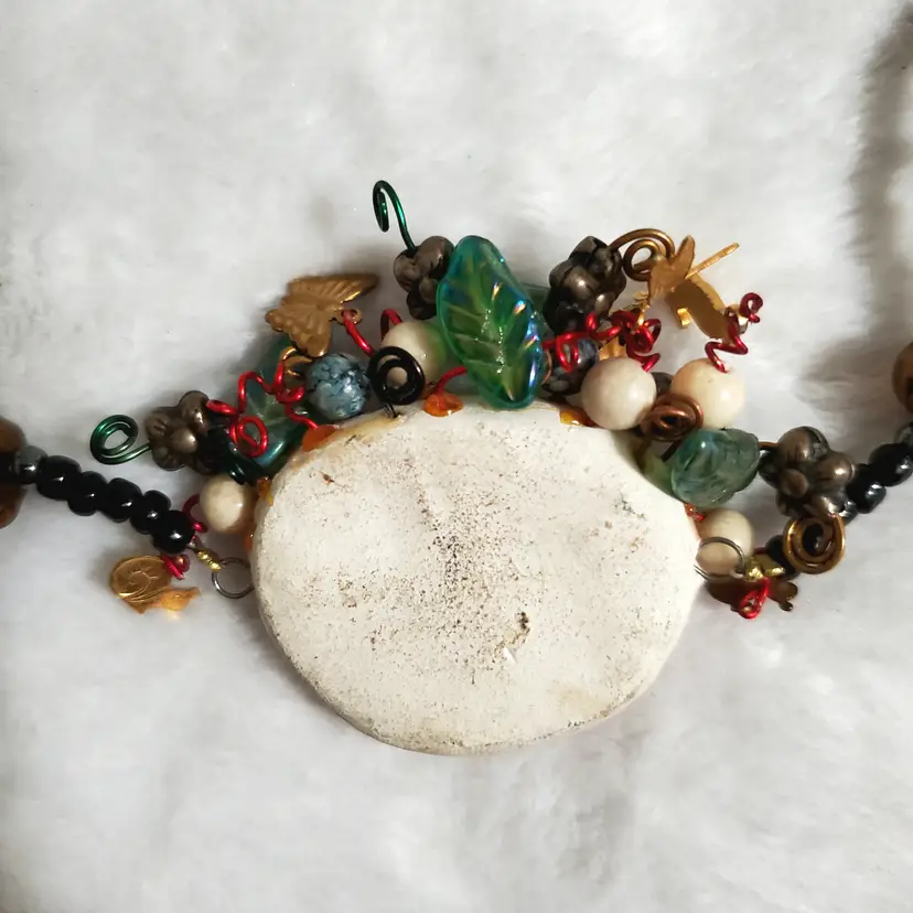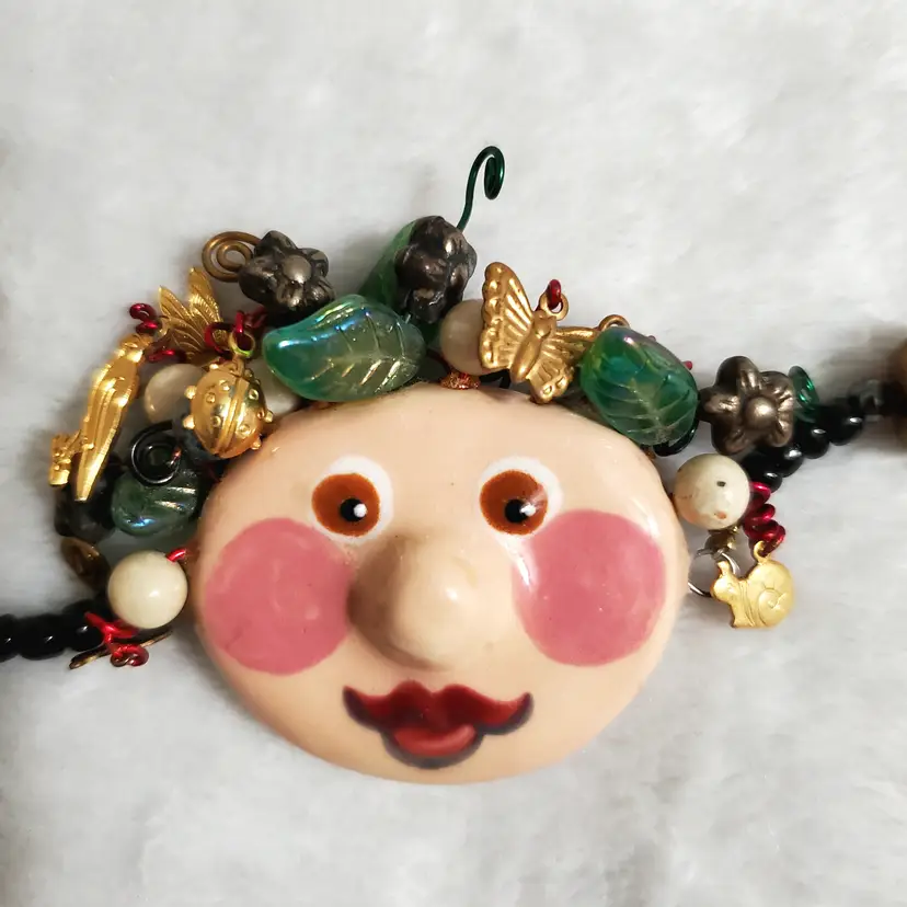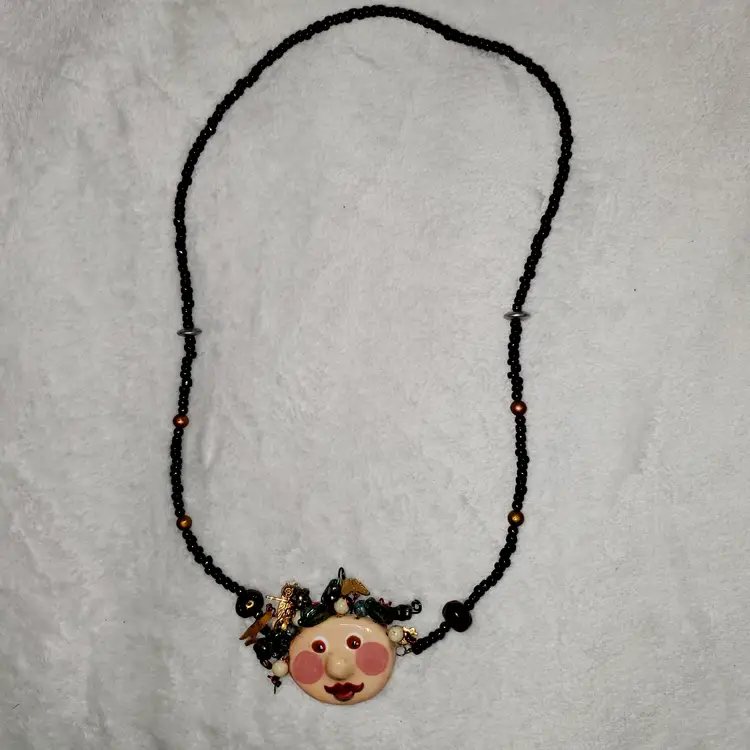 Very unique, handmade, beaded necklace with a woman's face as the centerpiece. I am not sure what her face is made of, maybe painted clay, and her hair is made of wire, beads, leaves, and small charms.
