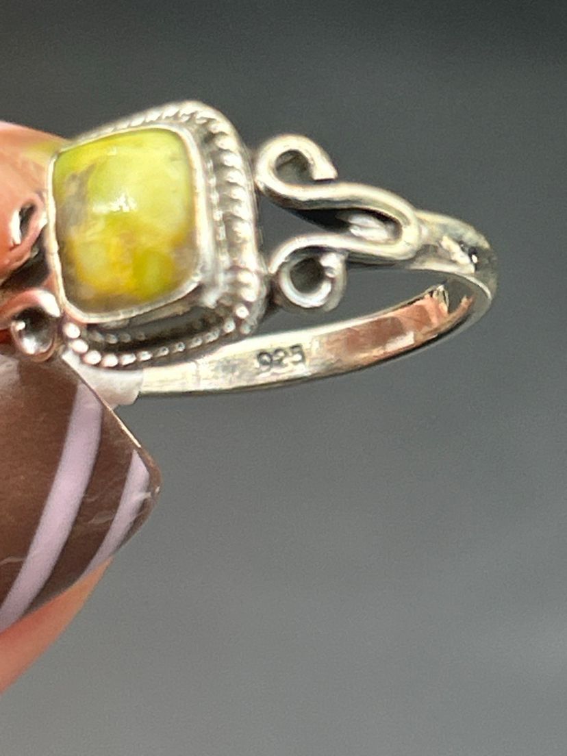 Notable Details: • Material: Sterling Silver (marked 925) • Gemstone: Yellow turquoise with natural matrix • Design: Handcrafted swirl shoulders with rope-edge bezel • Ring Size: 7 • Stone Shape: Square cabochon, approx. 8mm • Condition: Excellent; no cracks or visible wear