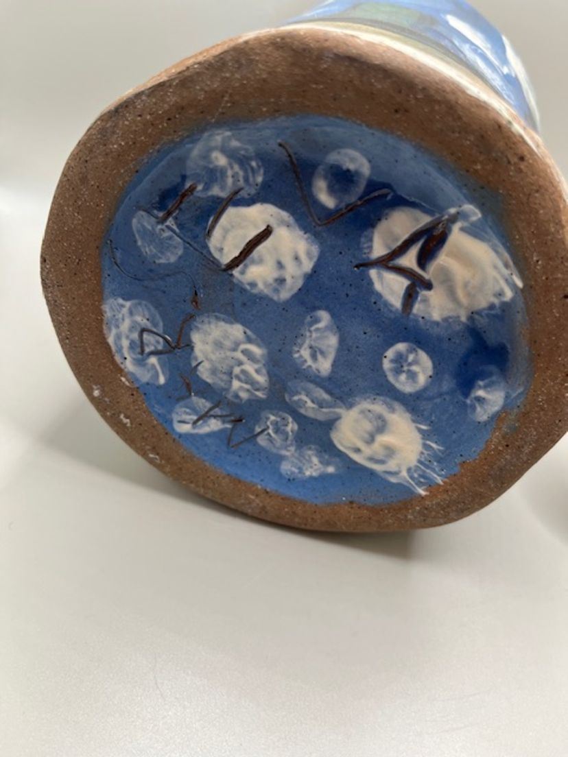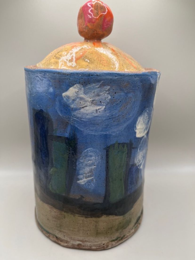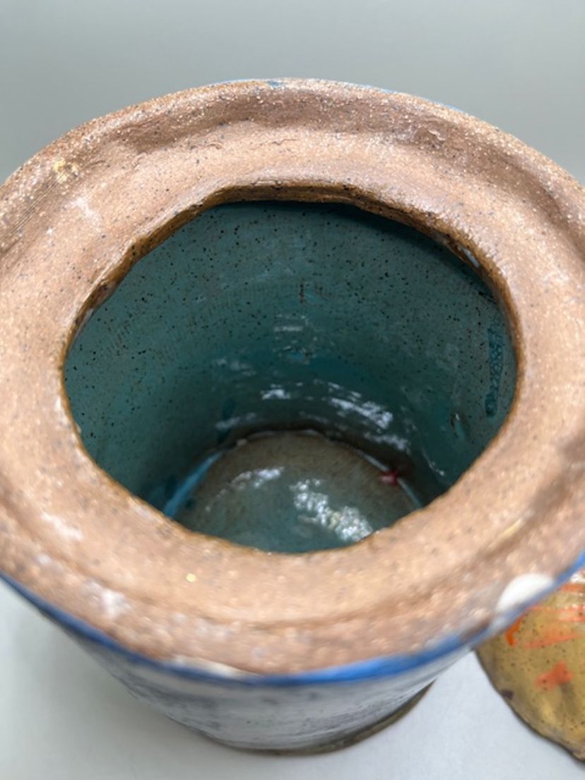 This piece is similar to the tsubo style jars, with a lid topped by a decorative finial. Decorated with abstract blue, white, red, yellow and salmon glazes, giving it a unique, artistic appearance. A charming hobbyist piece! Measures 9.5 inches tall with lid.
