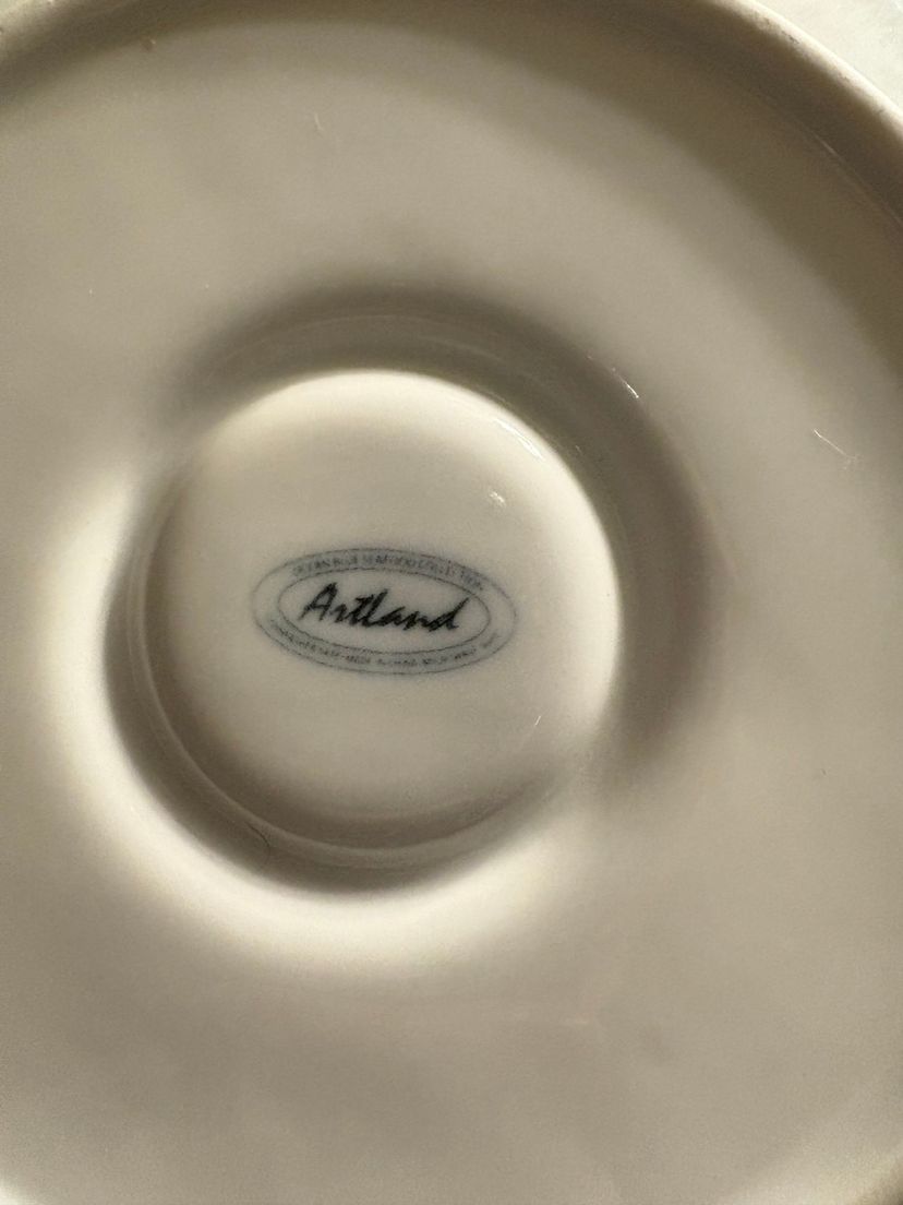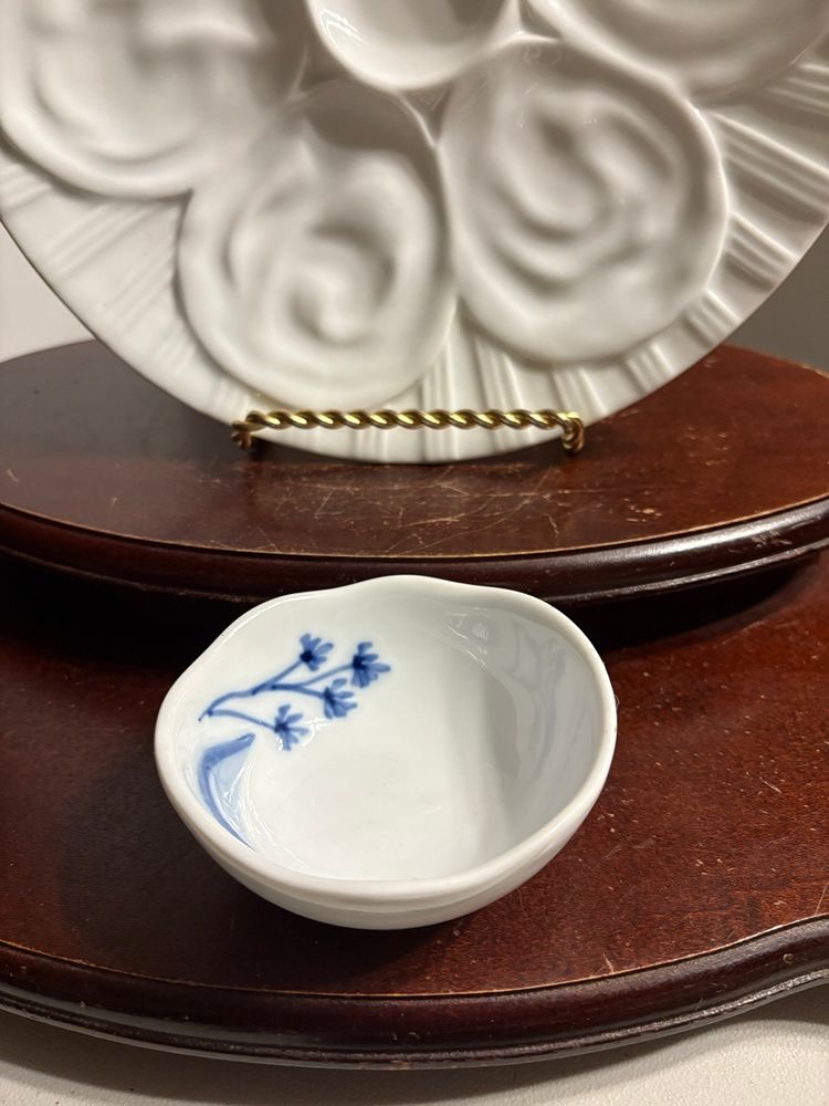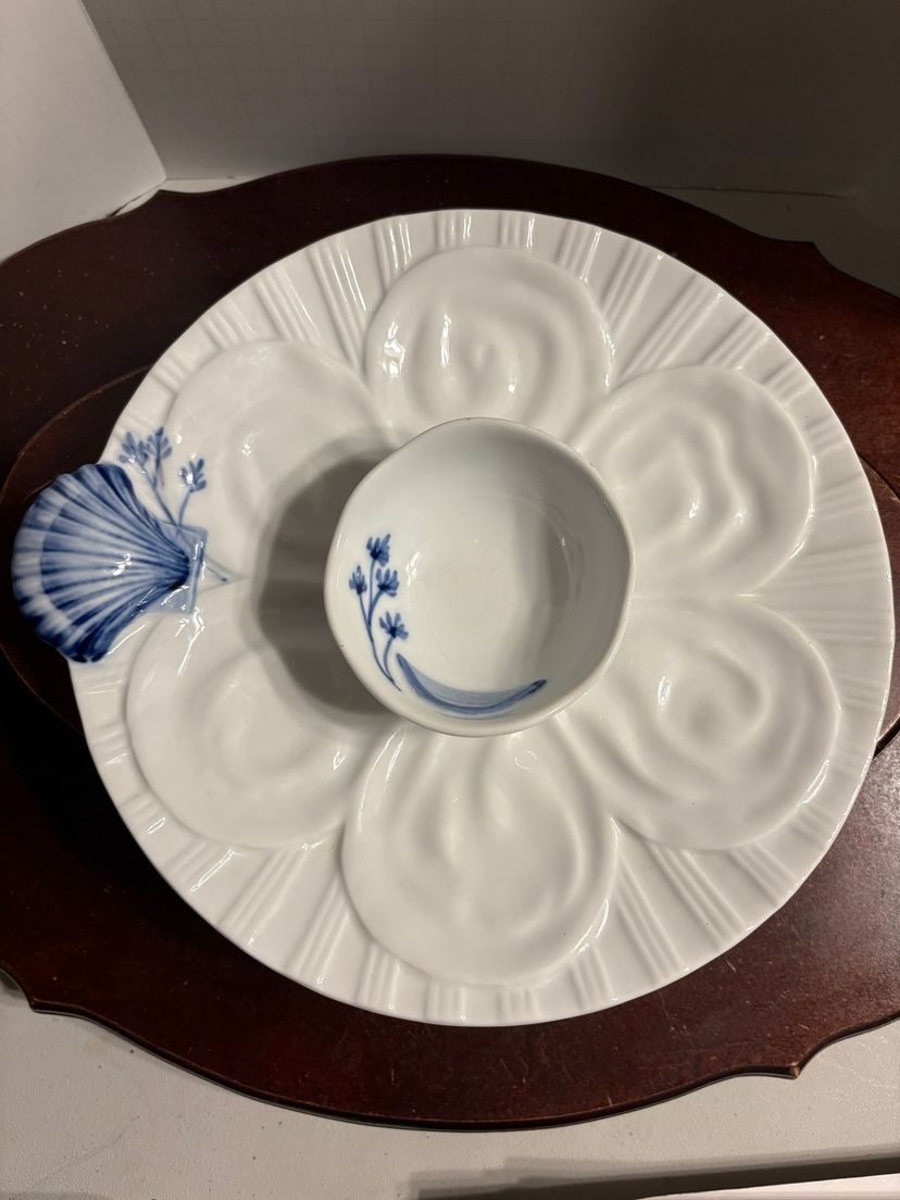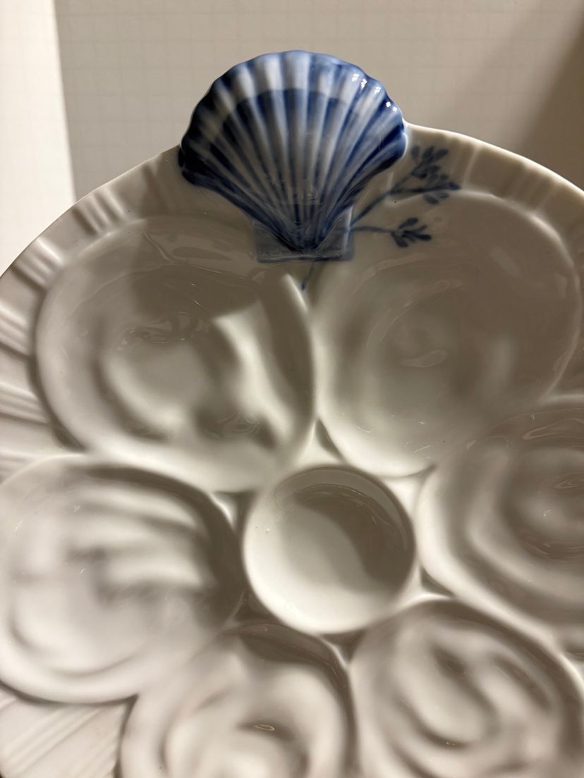 Includes sauce dish. Plate is 10.25” in diameter with 6 oyster wells and 1 sauce well. Sauce dish is 3.5” in diameter. Blue shell and floral design, made in Japan.