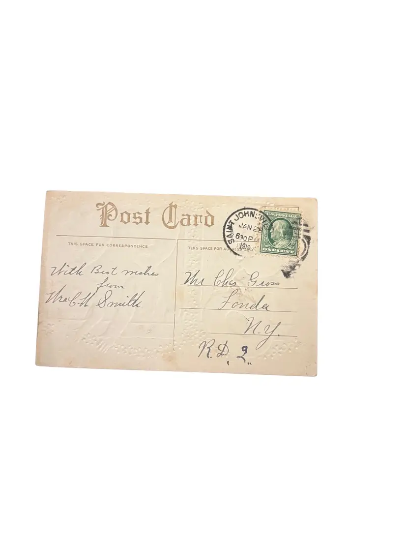 This listing is for one antique postcard with comedic and romantic themes. The front depicts an image of the Disturber of Peace Horn Player and a choir couple with heart shaped heads. The colors on the image are still vibrant. The postcard is embossed. On the back, the original 1 cent stamp is attached. It is also postmarked for 1910. The postcard was used. Overall, it is in great antique condition. It does have light staining, a tiny corner chip and minor creasing- as seen in photograph. Ships top loaded for protection.