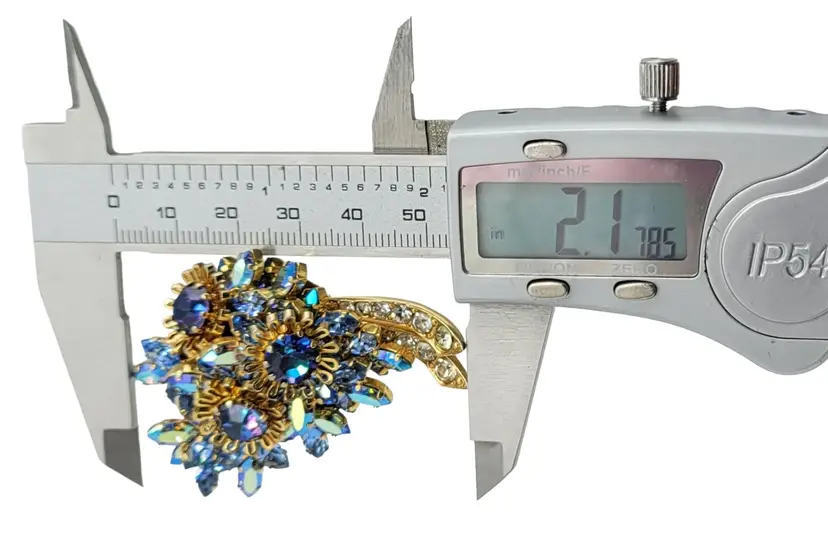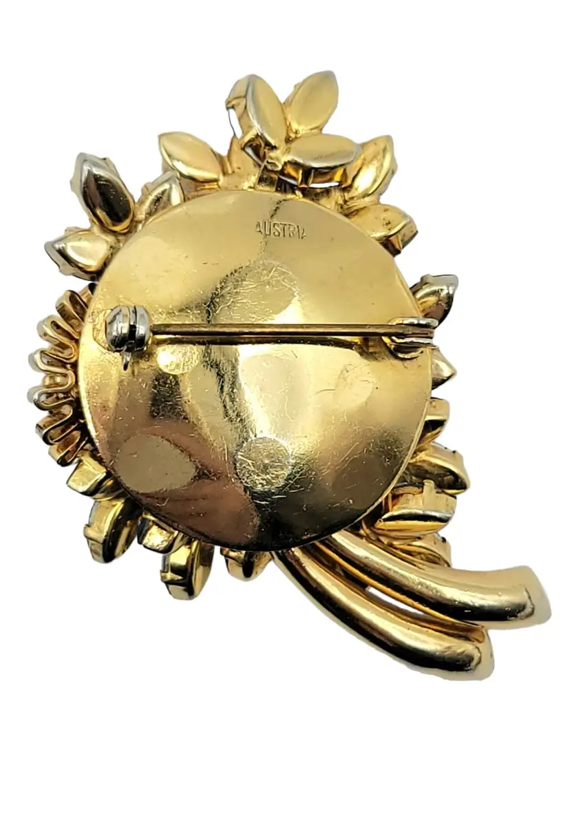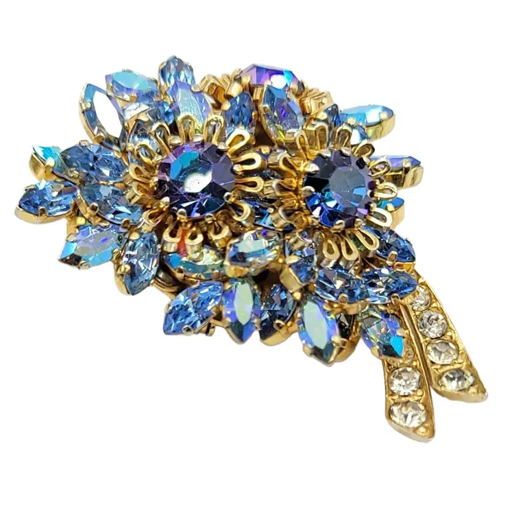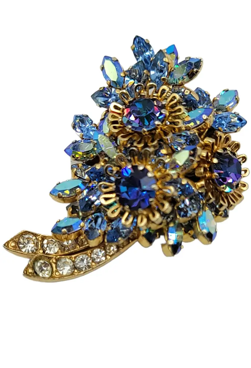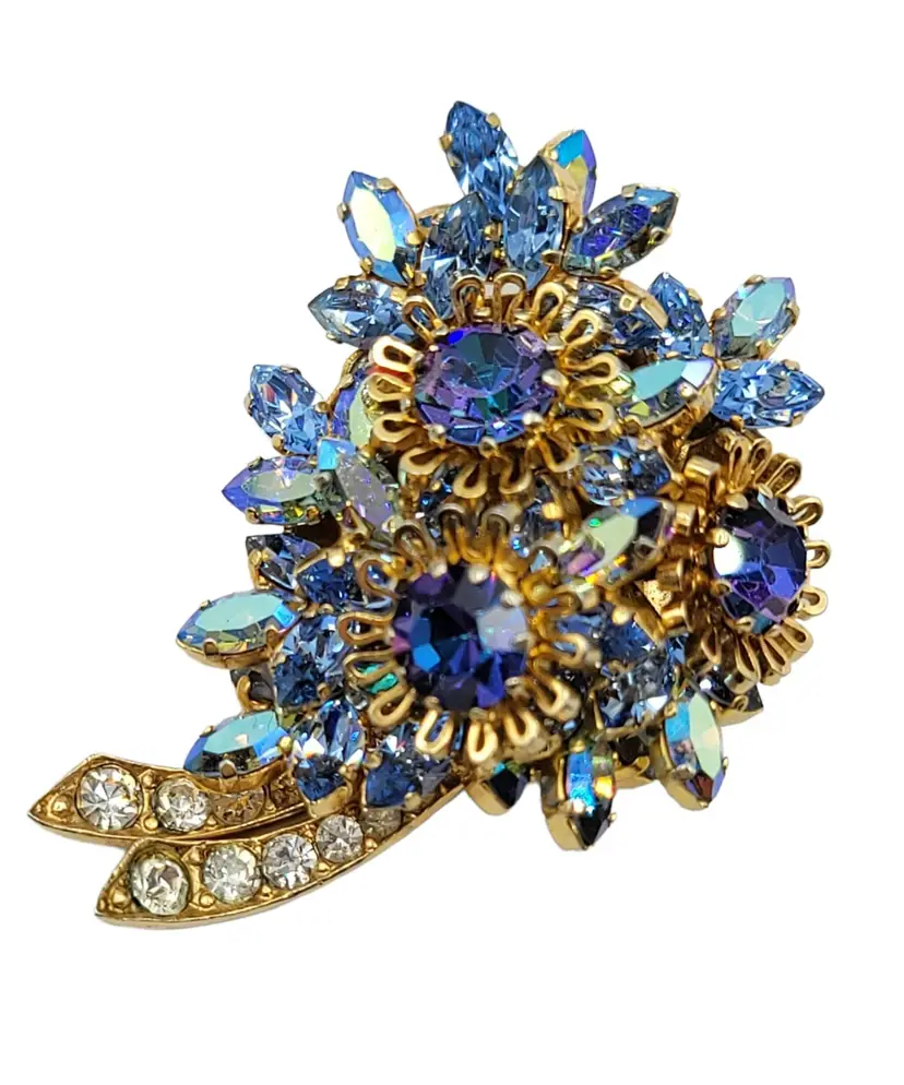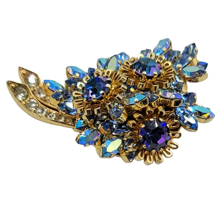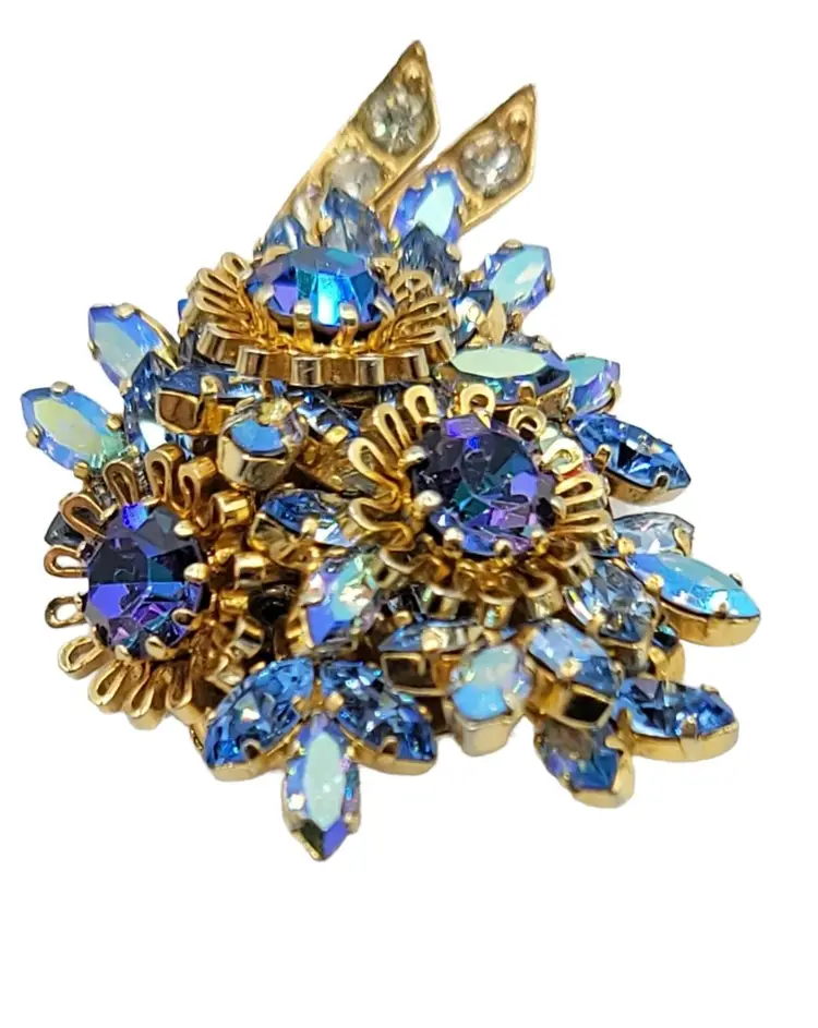 Austria-stamped jewelry that is produced is quite lovely and sought by collectors. This flower brooch features very impressive details, set in goldtone tone metal with rich dark and light blue crystals, Aurora Borealis navettes, chatons, and clear rhinestones. Signed AUSTRIA at the back. Measure approximately 2.1-inch high. The pin functions properly and is in good vintage condition.