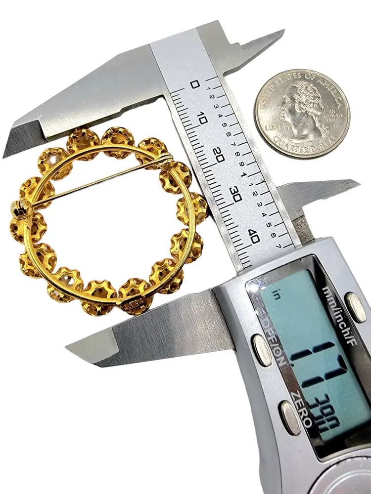 You will feel like a queen in this gold tone filigree brooch, featuring bright blue rhinestones prong-set in a rich gold tone setting. This stunning brooch measures 1.7-inches in length, perfect for day or evening wear. Marked AUSTRIA at the back. This piece will make a proud addition to your collection of quality vintage jewelry.