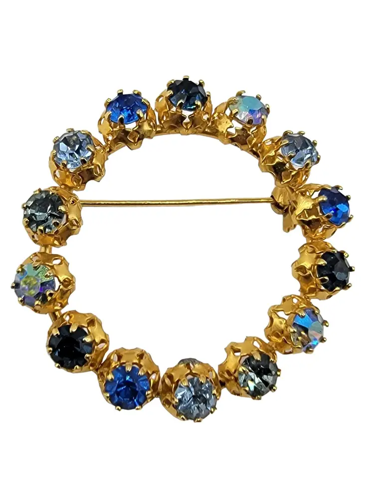 Austria Gold Tone Blue Rhinestone Open Round Filigree Brooch Pin