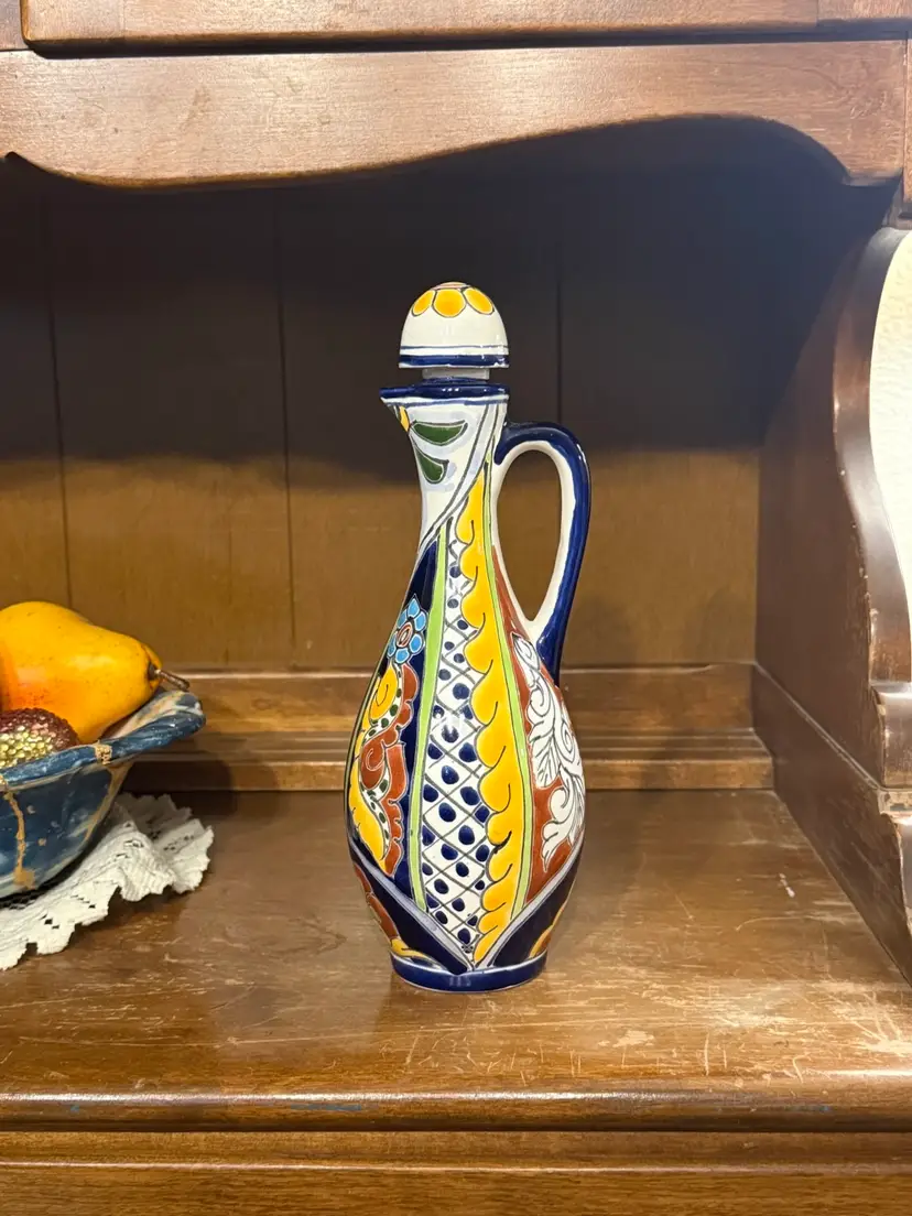 Marked on the base “Talavera Lead Free – Hand Painted and Made in Mexico for Terra Fina,” this piece is both decorative and functional. The elegant curved shape, sturdy handle, and fitted lid make it perfect for olive oil, vinegar, or infused oils while adding a colorful, handcrafted touch to your countertop.