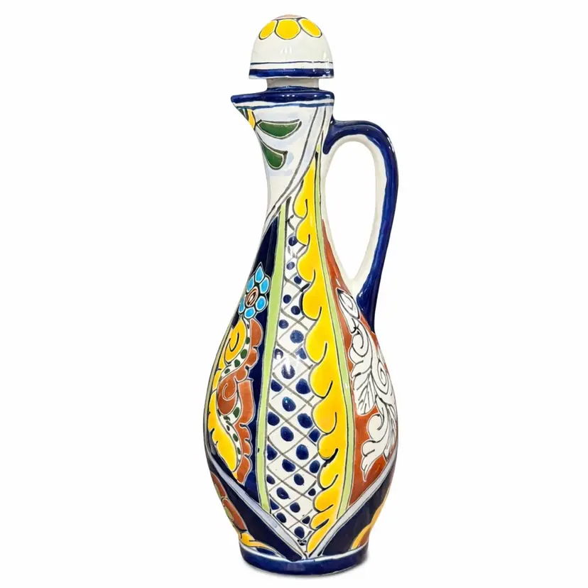Bring the warmth of a Mexican artisan kitchen to your home with this authentic Talavera olive oil pourer. Hand-painted in vibrant cobalt blue, golden yellow, terracotta, and green, each brushstroke reflects the traditional craftsmanship Talavera pottery is known for.