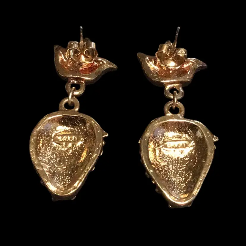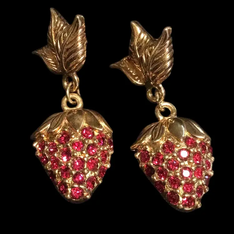 Pave’ set dangle red rhinestones on gold tone, pierced. 1-1/2” drop. #598