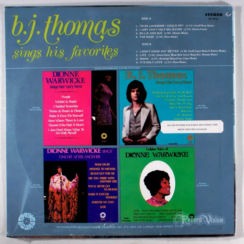 Sings His Favorites, by B. J. Thomas, contains the songs I'm So Lonesome I Could Cry, Mama, I Just Can't Help Believing, The Mask, among others.