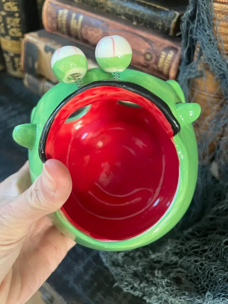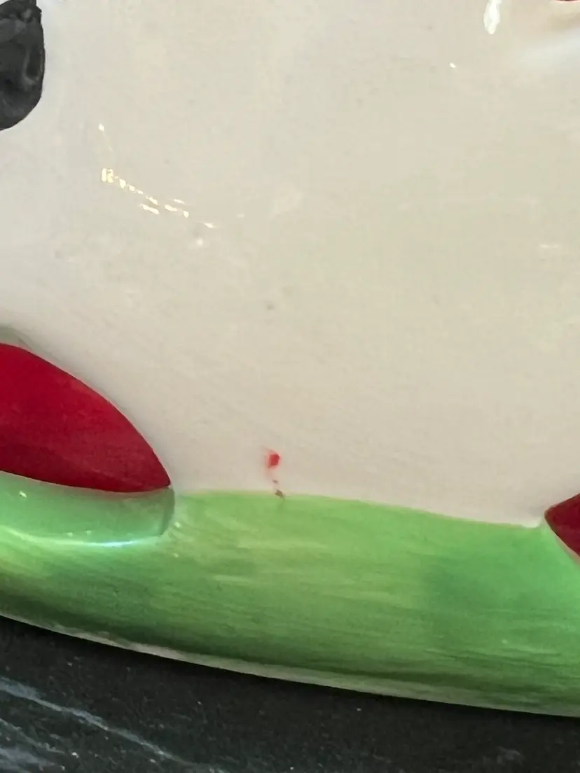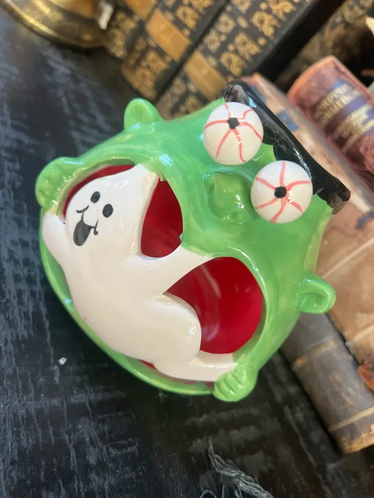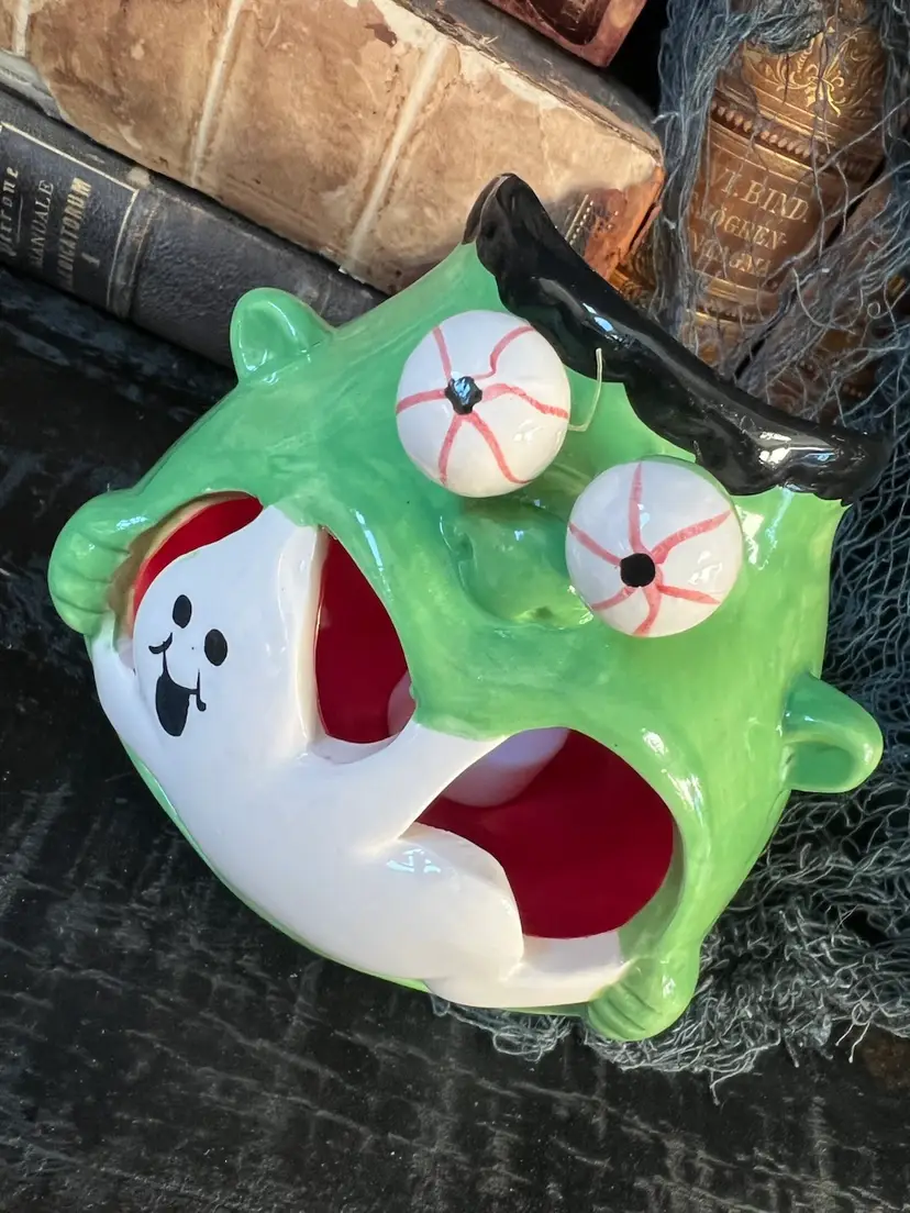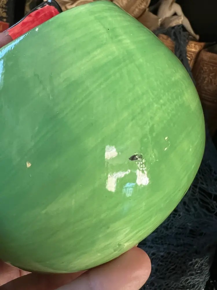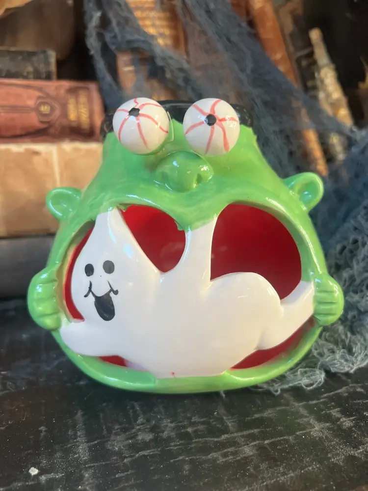 Wonderful condition stands approximately 4 1/2 inches tall there is one area on the back where there’s a little black mark. It is in the glaze and a little red mark on the Ghost that is also in the glaze.