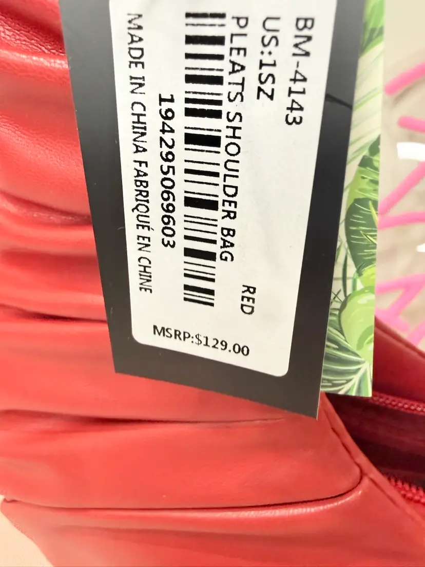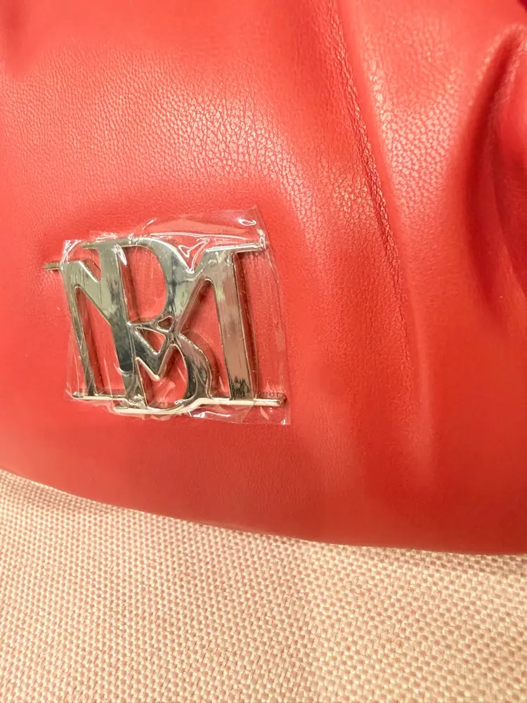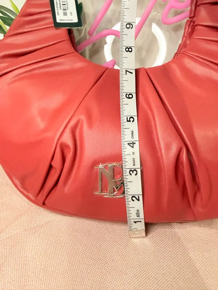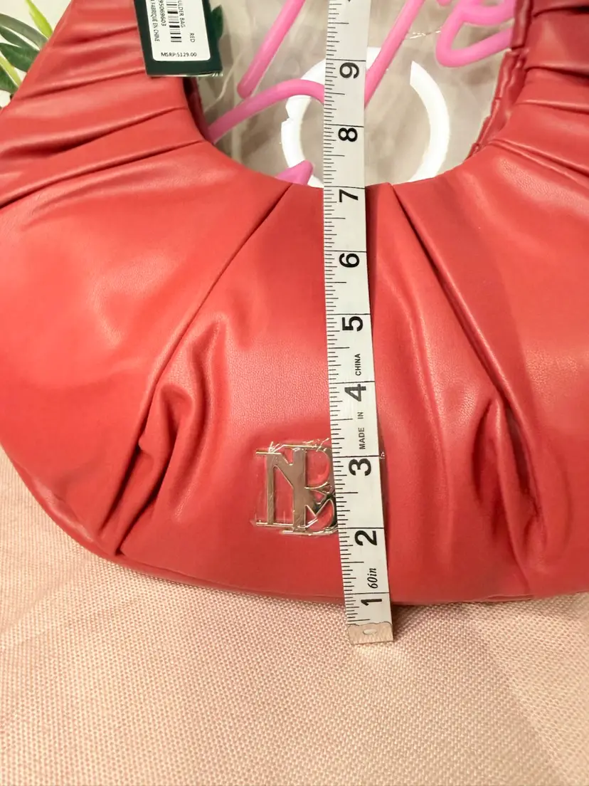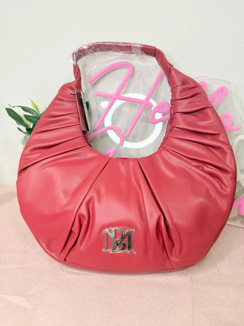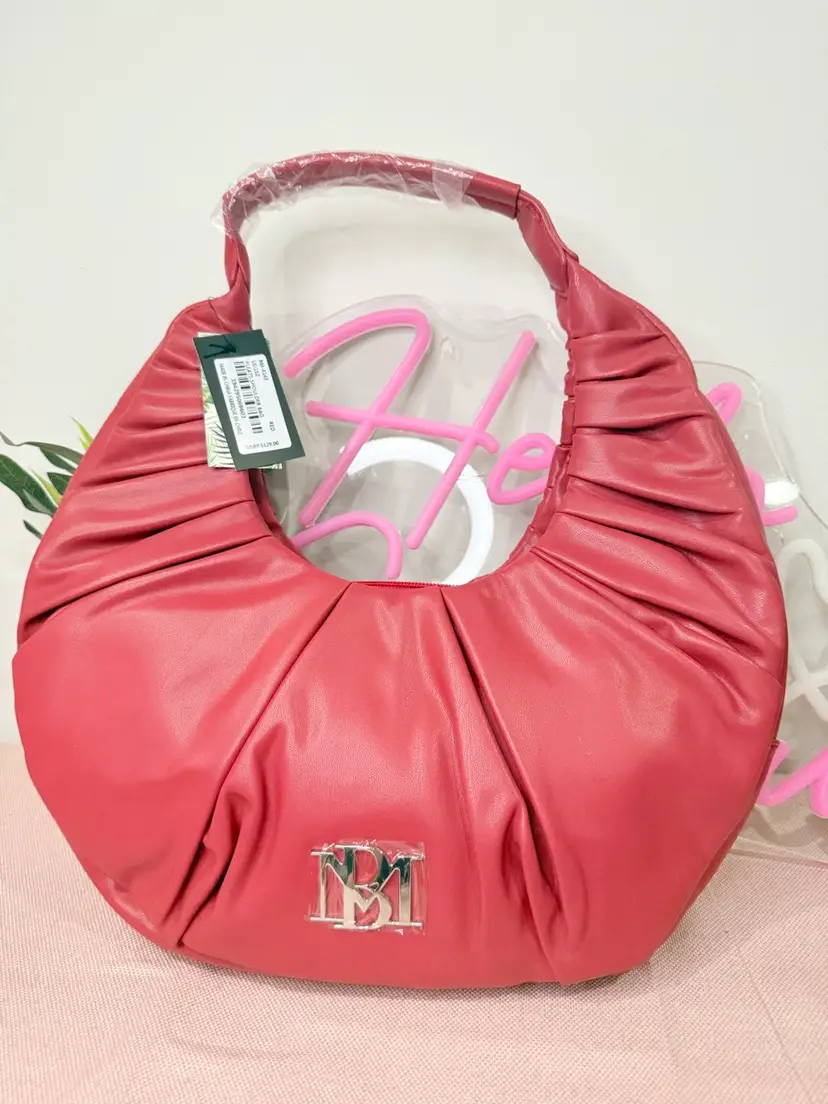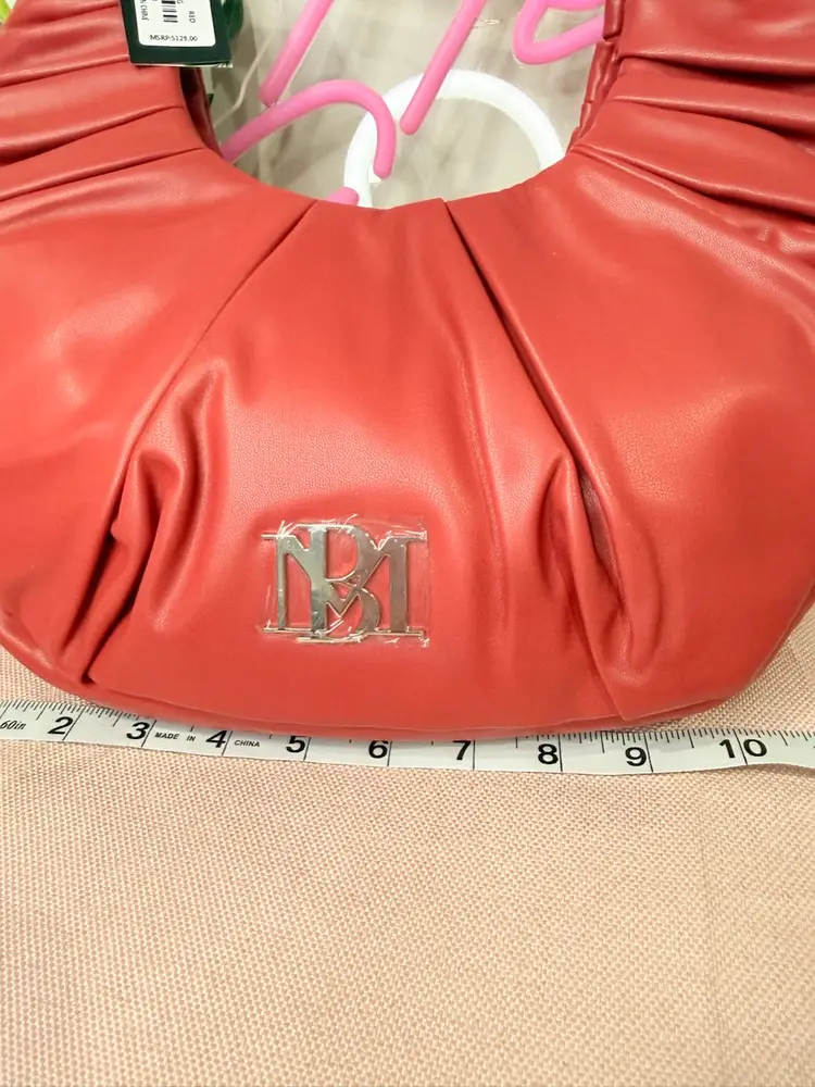 Brand: Badgley Mischka Exterior material: Vegan Leather Style: Hobo Bag Exterior color: Red Department: Women Features: Spacious interior, Comfortable shoulder strap, Logo embellishment