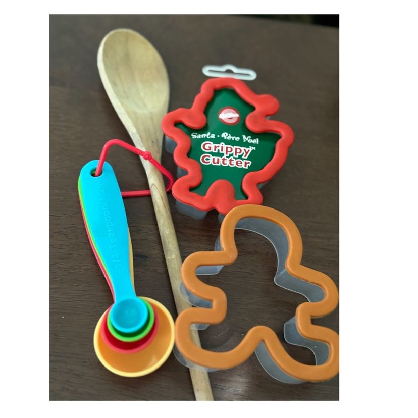Adorling fruit topped tin in fall colors 7 x 3 Colorful measuring spoons, wooden spoon Handmade potholder Cookie cutters: gingerbread person and Santa