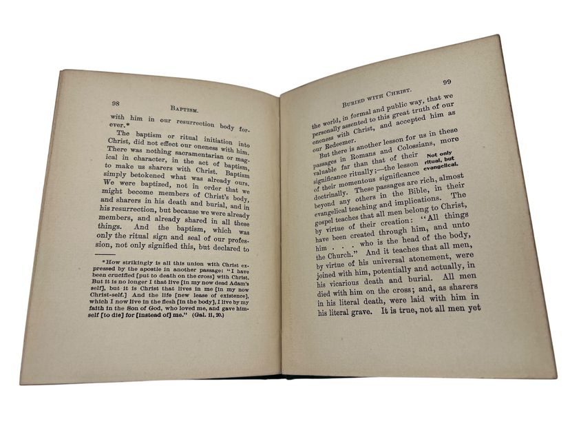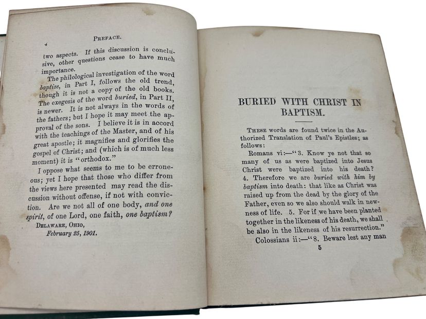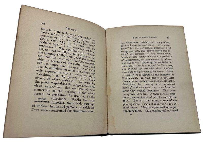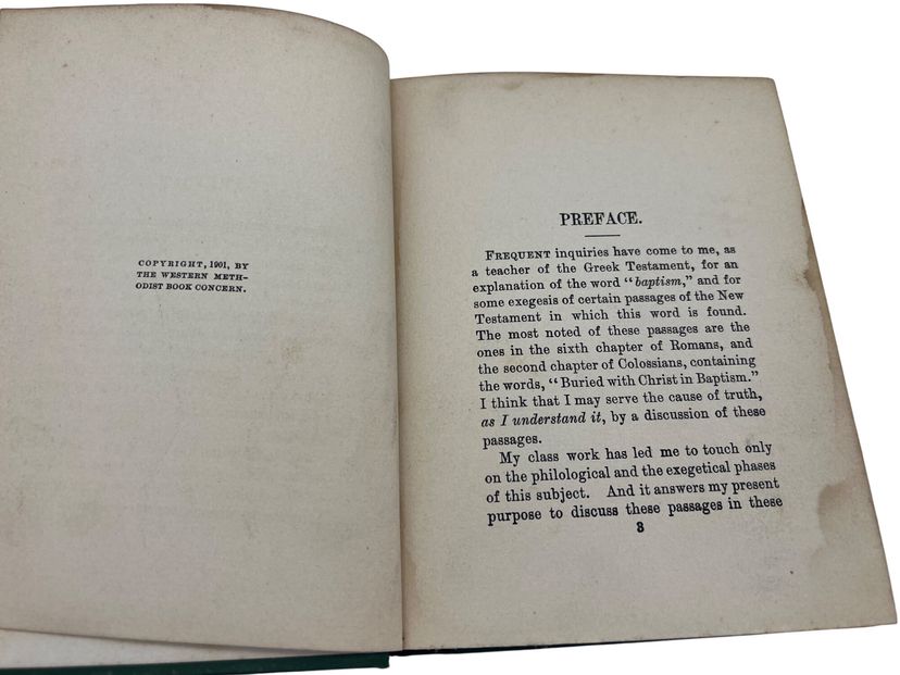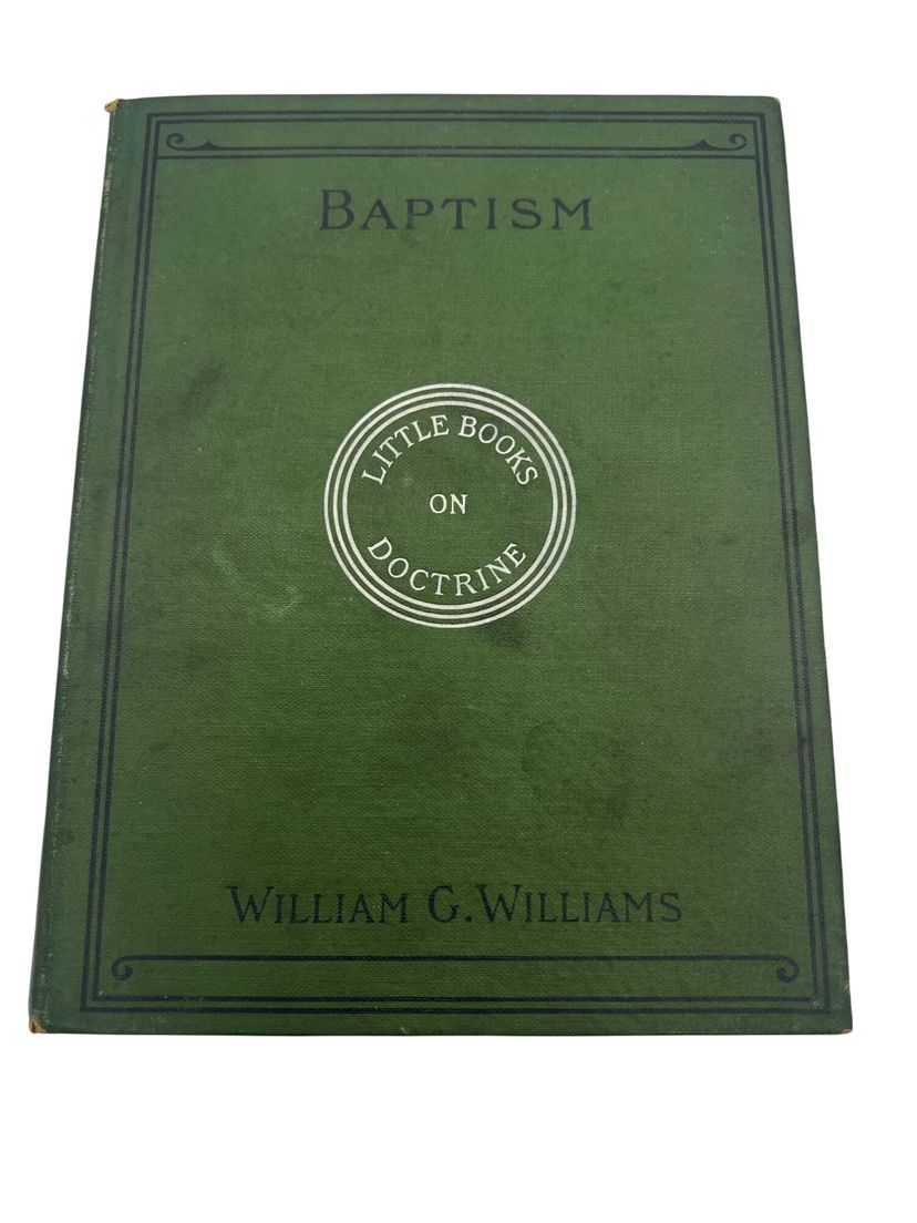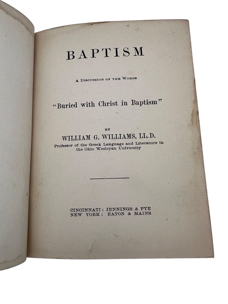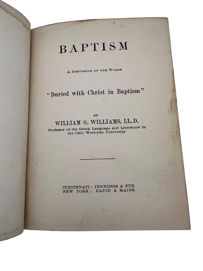 This 1901 hardcover book, "Baptism," by William G. Williams, offers an in-depth discussion of baptism in religious doctrine and theology. Published by Jennings & Pye. Measures 6" x 4.5" and has 109 numbered pages. The book is an argument defending the Wesleyan-Methodist perspective on baptism. Instead of literal, physical immersion, Williams asserts that the New Testament language is a symbolic and theological statement about the experience of regeneration. The book is not a general treatise on baptism but a targeted response to the "immersionists" of his day, who included Baptist and Disciples of Christ denominations.