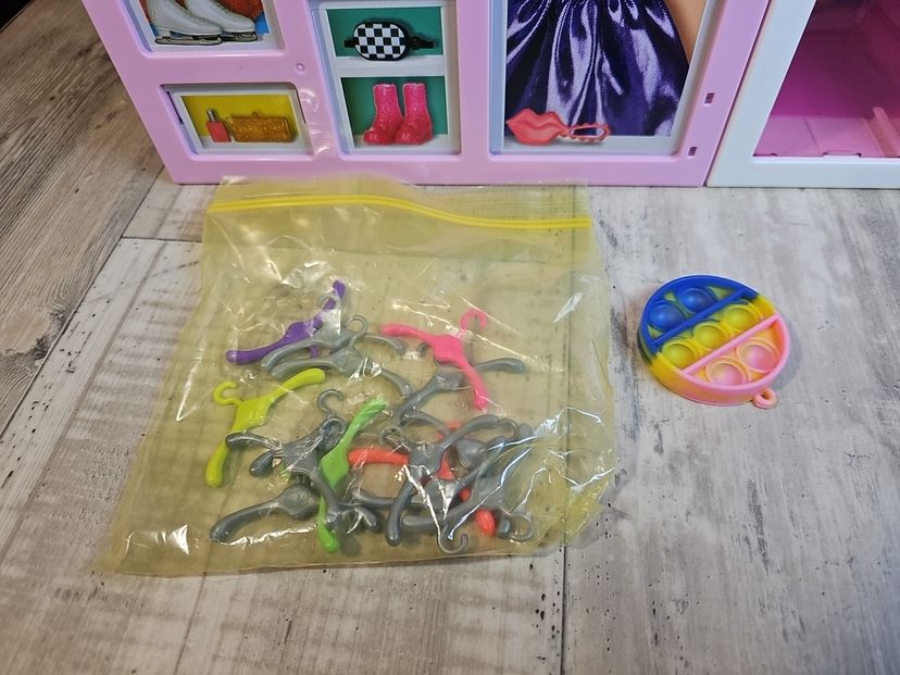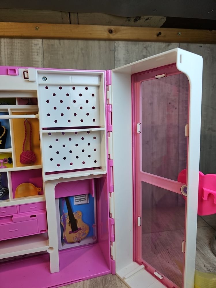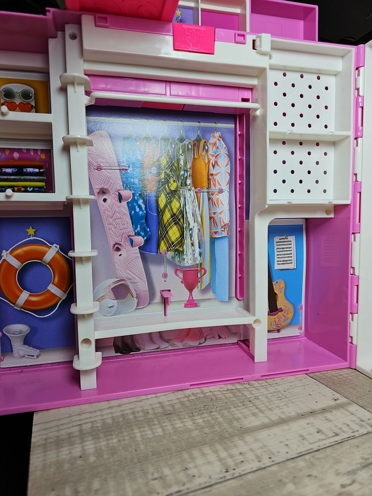 Pre-owned in excellent condition. Clean, bright colors, all hinges and drawers work perfectly. Includes assorted hangers and accessories as shown. No dolls included.