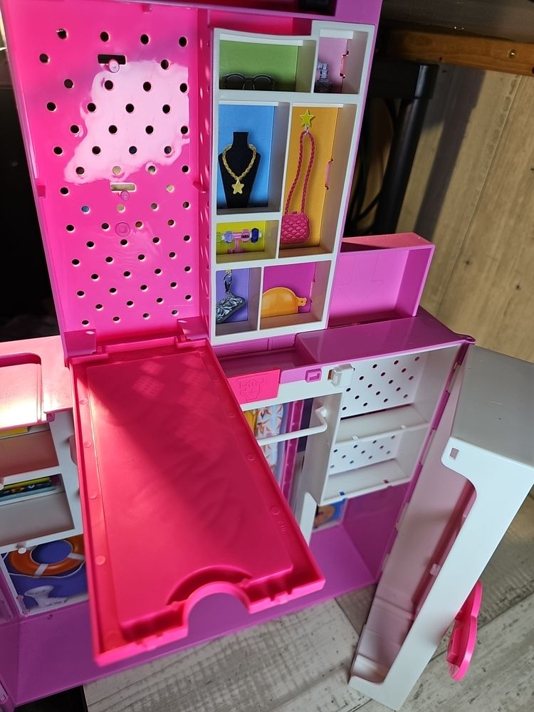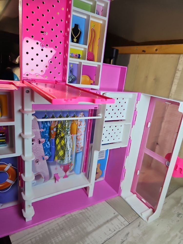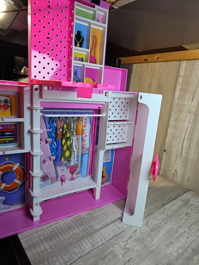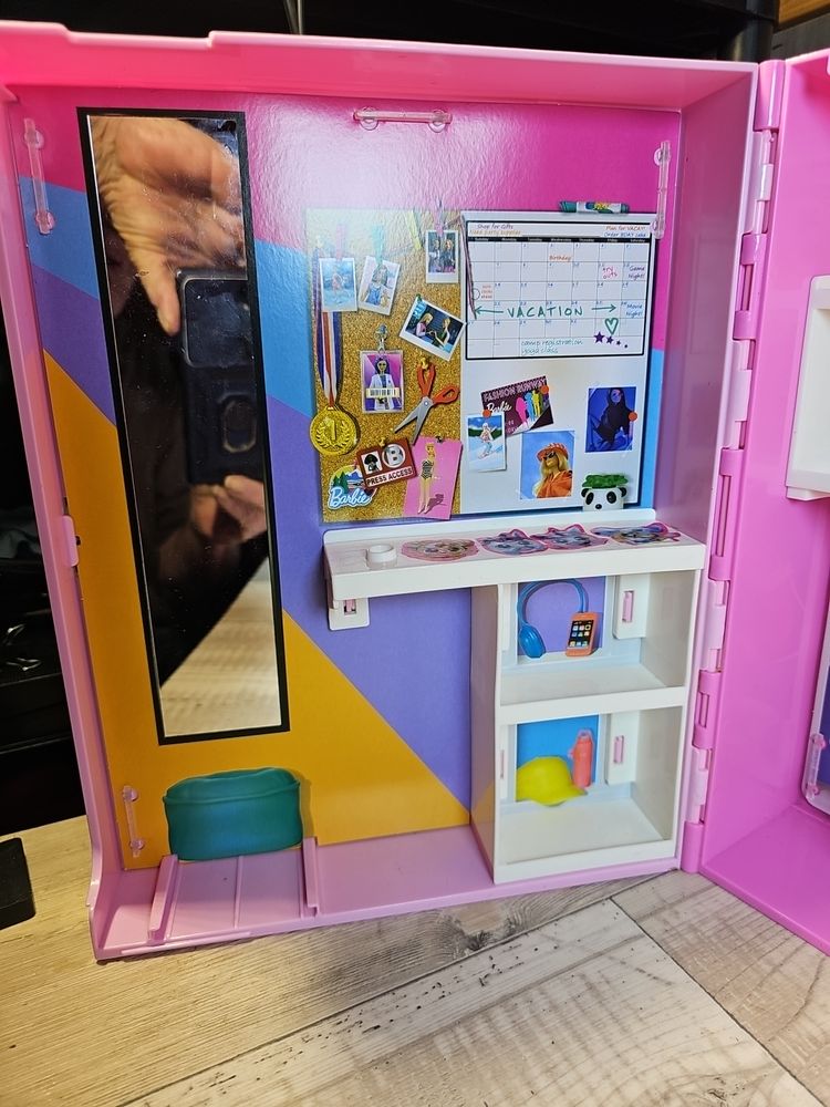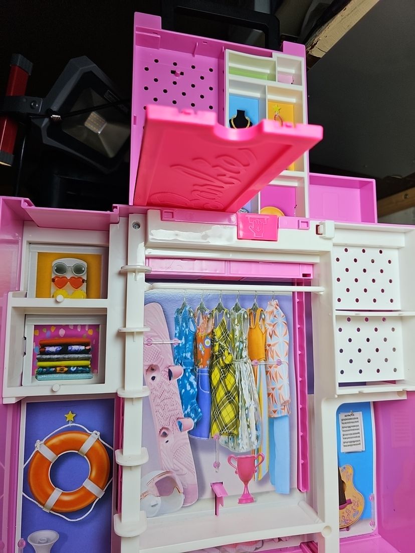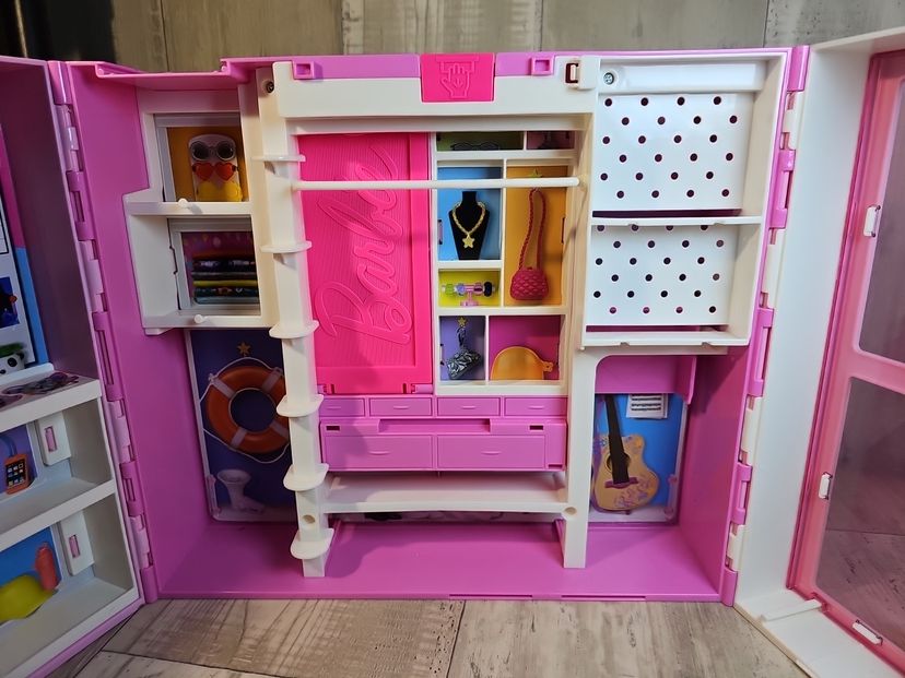 • Model HBV28 (Mattel, 2021) • Fold-out double-door design with mirror and pegboard storage • Pop-up second level and working laundry chute • Multiple drawers, racks, and accessory cubbies • Compact suitcase-style fold for easy storage • Fully compatible with 11.5" Barbie dolls and clothing