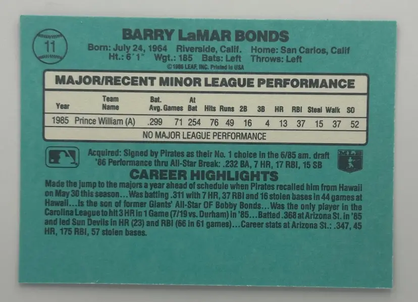 Barry Bonds 1986 Donruss The Rookies Card